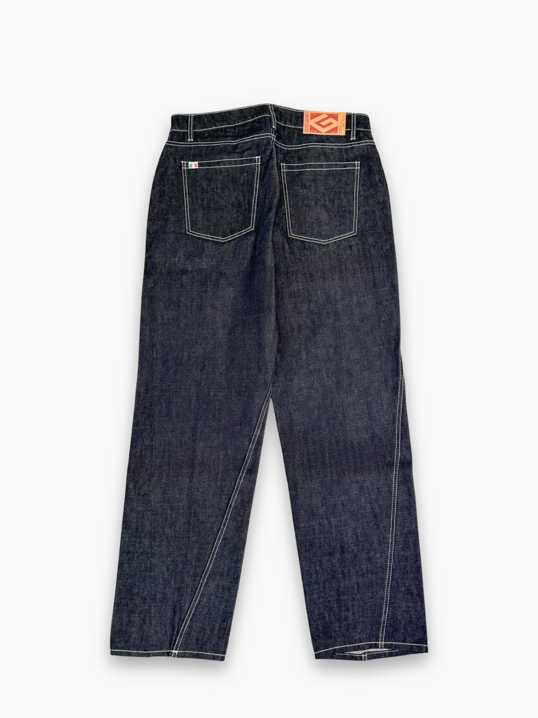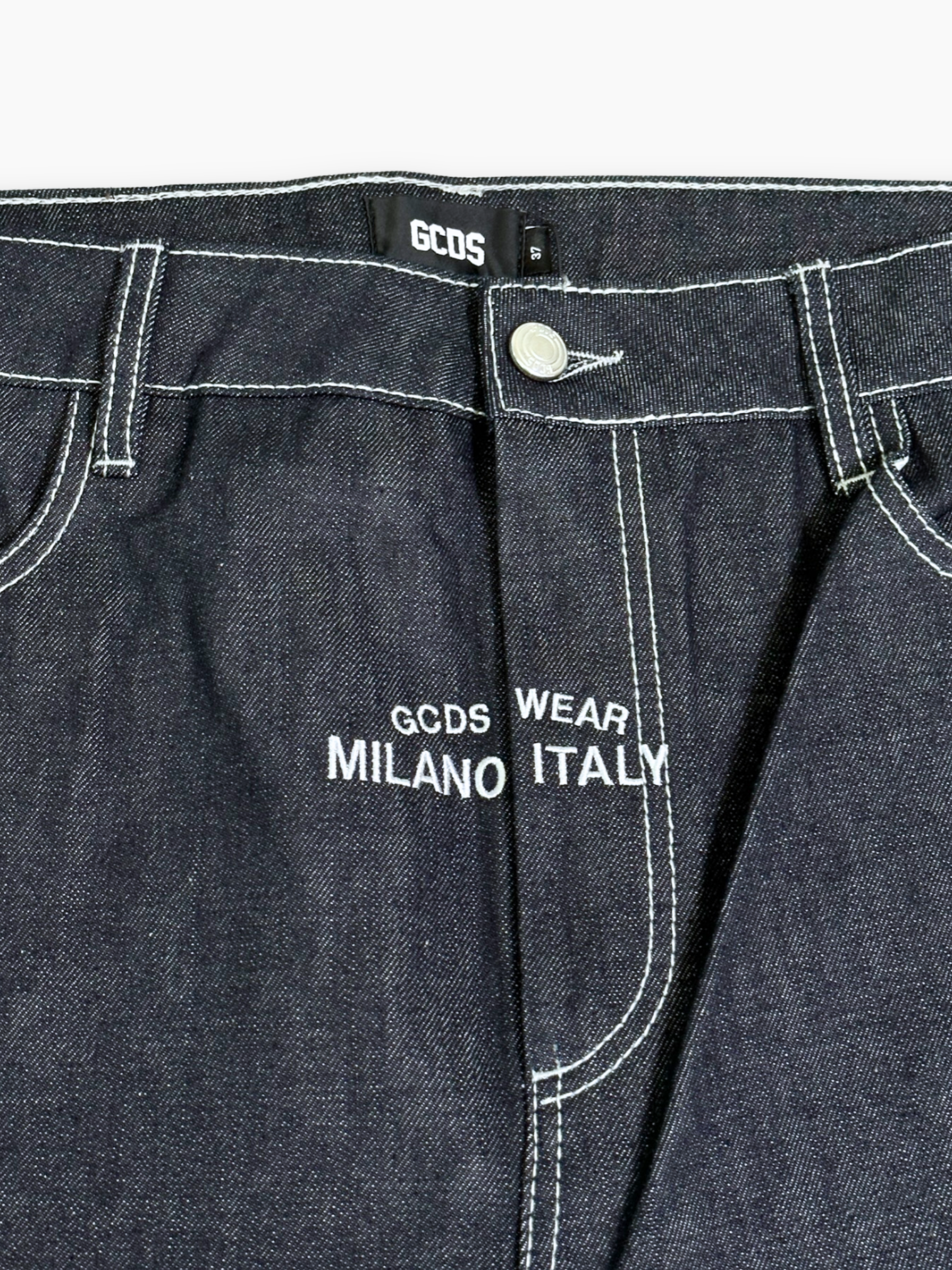 Pantaloni in denim blu scuro con cuciture a contrasto e linea dritta. Il modello presenta vita regular, cinque tasche e ricamo “GCDS Wear Milano Italy” sulla parte frontale, che aggiunge un dettaglio distintivo e contemporaneo. La struttura in denim rigido garantisce tenuta e stile, ideale per look casual dal tocco urbano.