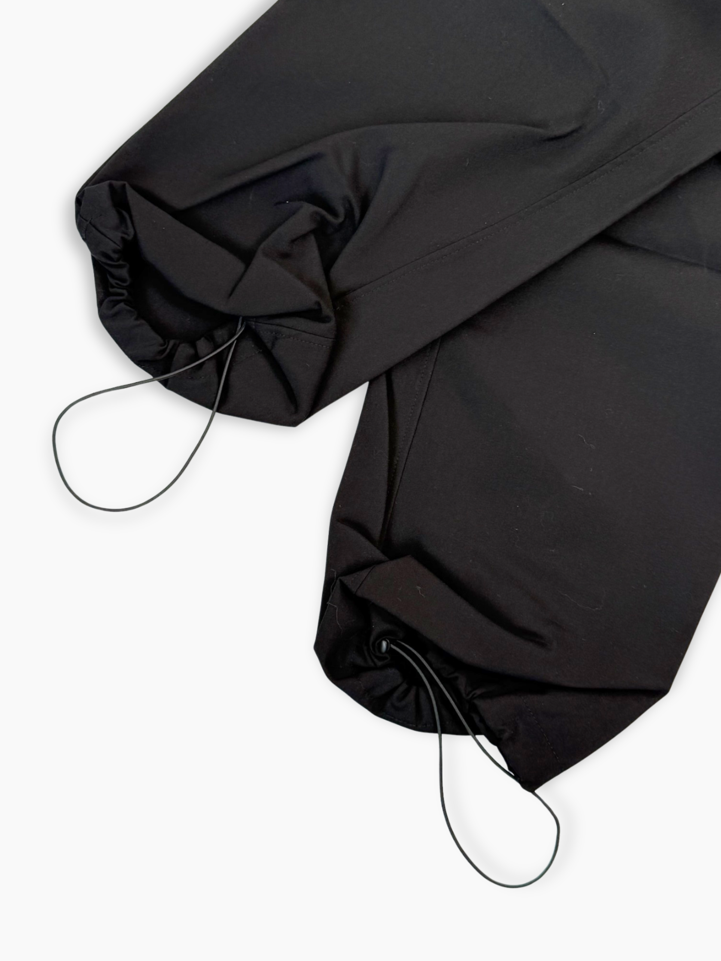 Versatile, funzionale e cool: questo pantalone nero in nylon e cotone mixa estetica utility e dettagli urban. La vita con elastico e coulisse garantisce comfort, mentre i fondi regolabili con cordini permettono di variare la silhouette a seconda dell’umore. Un capo perfetto per interpretare con stile la quotidianità.