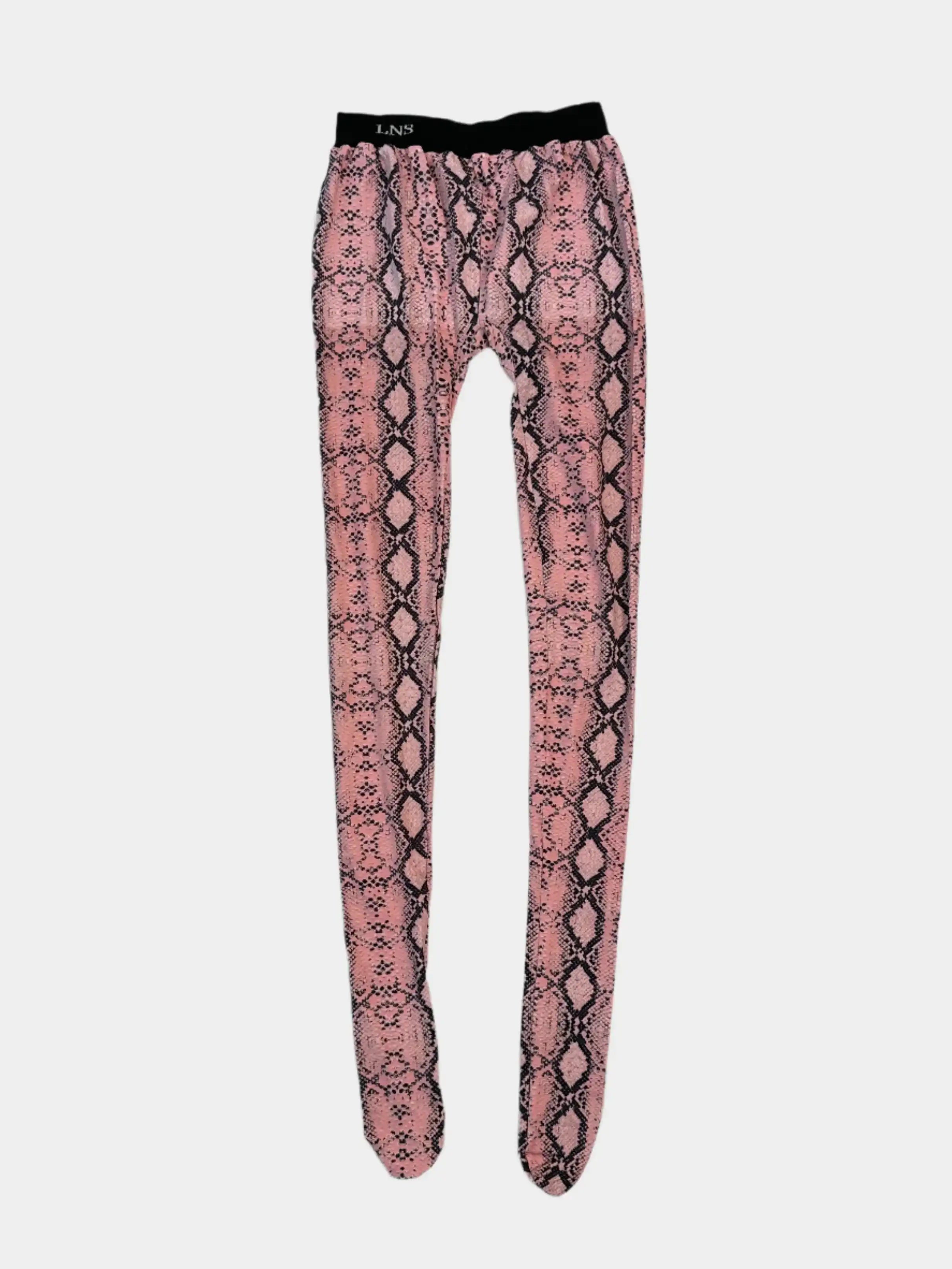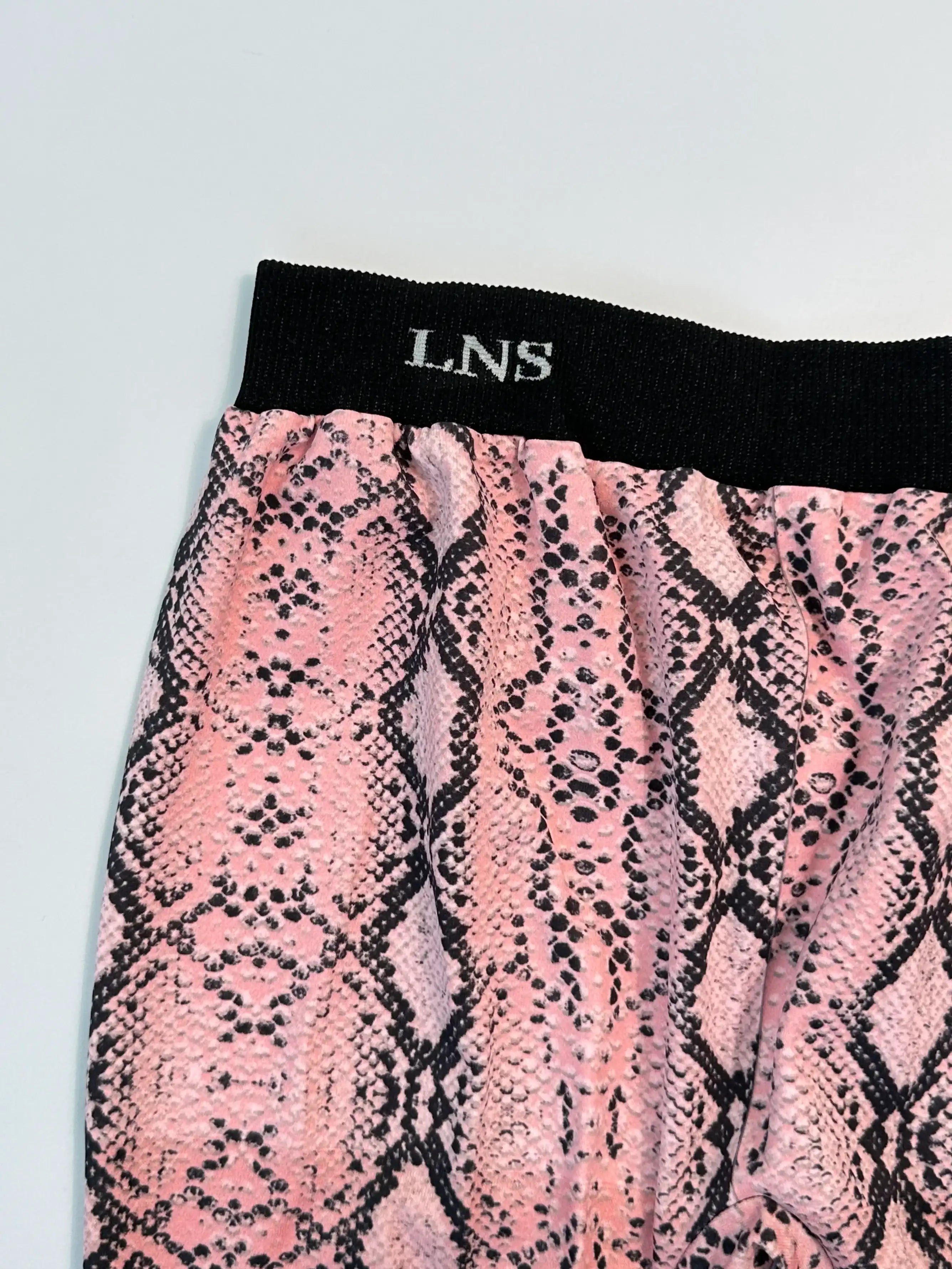I leggings Laneus con stampa pitonata rosa combinano uno stile deciso e attuale con la praticità di un capo elasticizzato. Caratterizzati da una silhouette aderente, presentano un elastico in vita nero con logo LNS a contrasto. Perfetti per look d'impatto, da indossare da soli o sotto capi oversize.