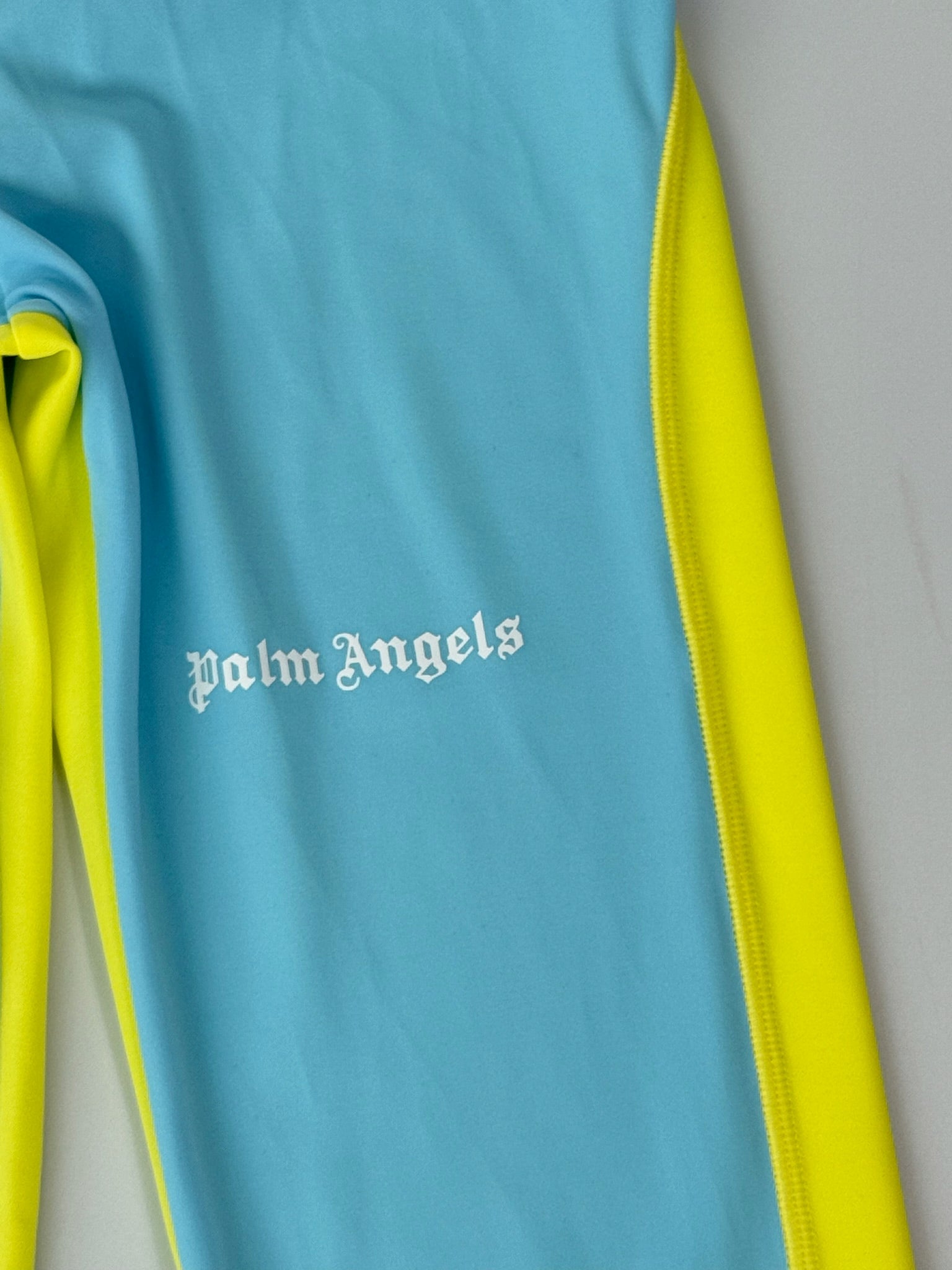 Leggings lunghi multicolor con vita alta a contrasto rosa, gamba celeste sul fronte e gialla sul retro. Il logo è stampato in bianco sul lato sinistro. La linea fasciante e i colori vivaci lo rendono perfetto per uno stile sportivo ma cool, anche fuori dalla palestra.