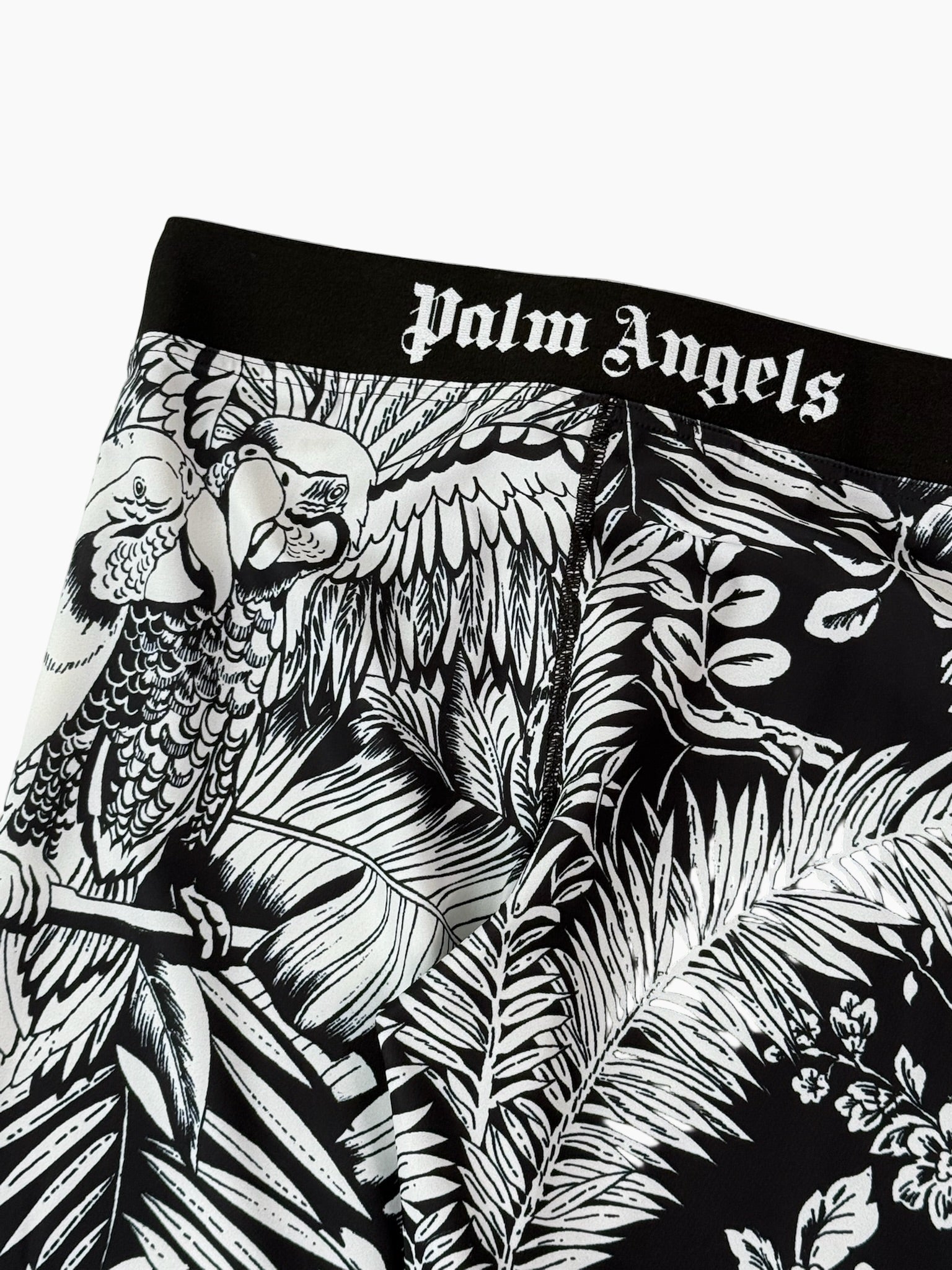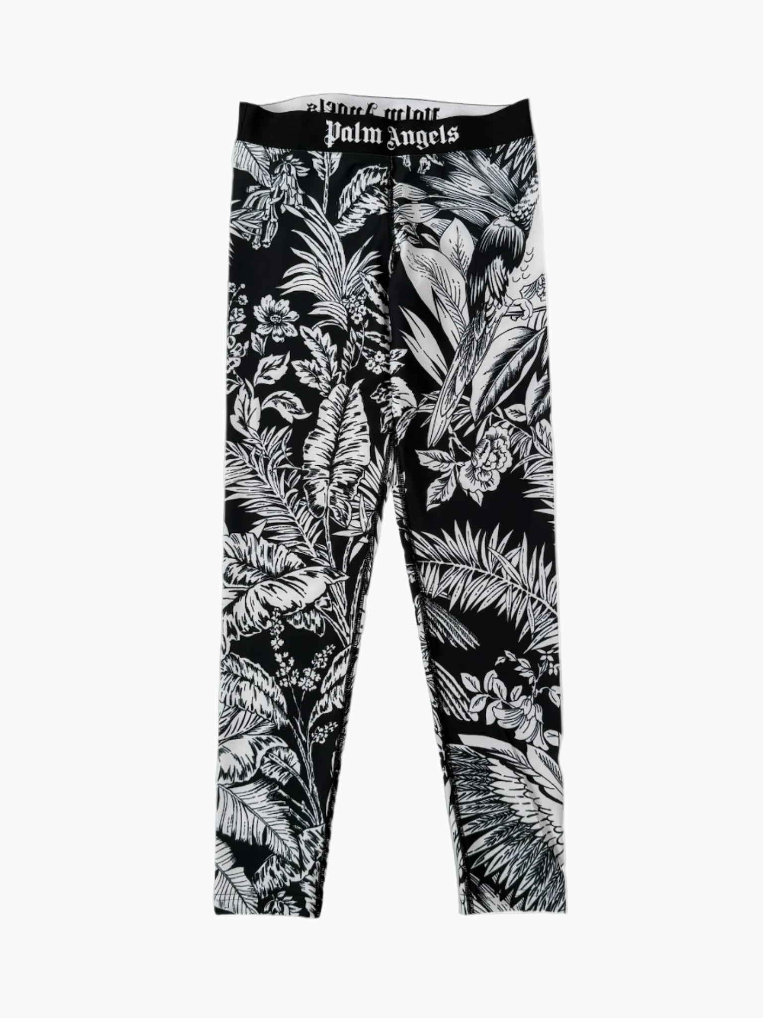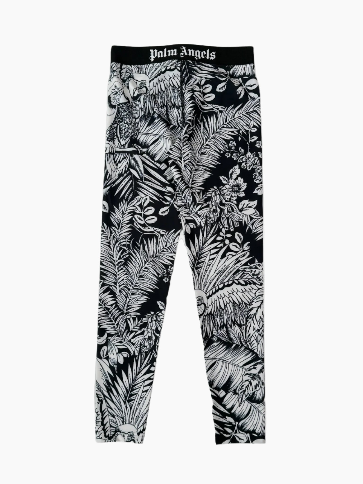 Leggings elasticizzati a vita alta con stampa jungle bicolore, caratterizzati da una fascia elastica con logo a contrasto. Il design avvolgente e la grafica tropical donano un tocco distintivo a ogni outfit sportivo o casual.