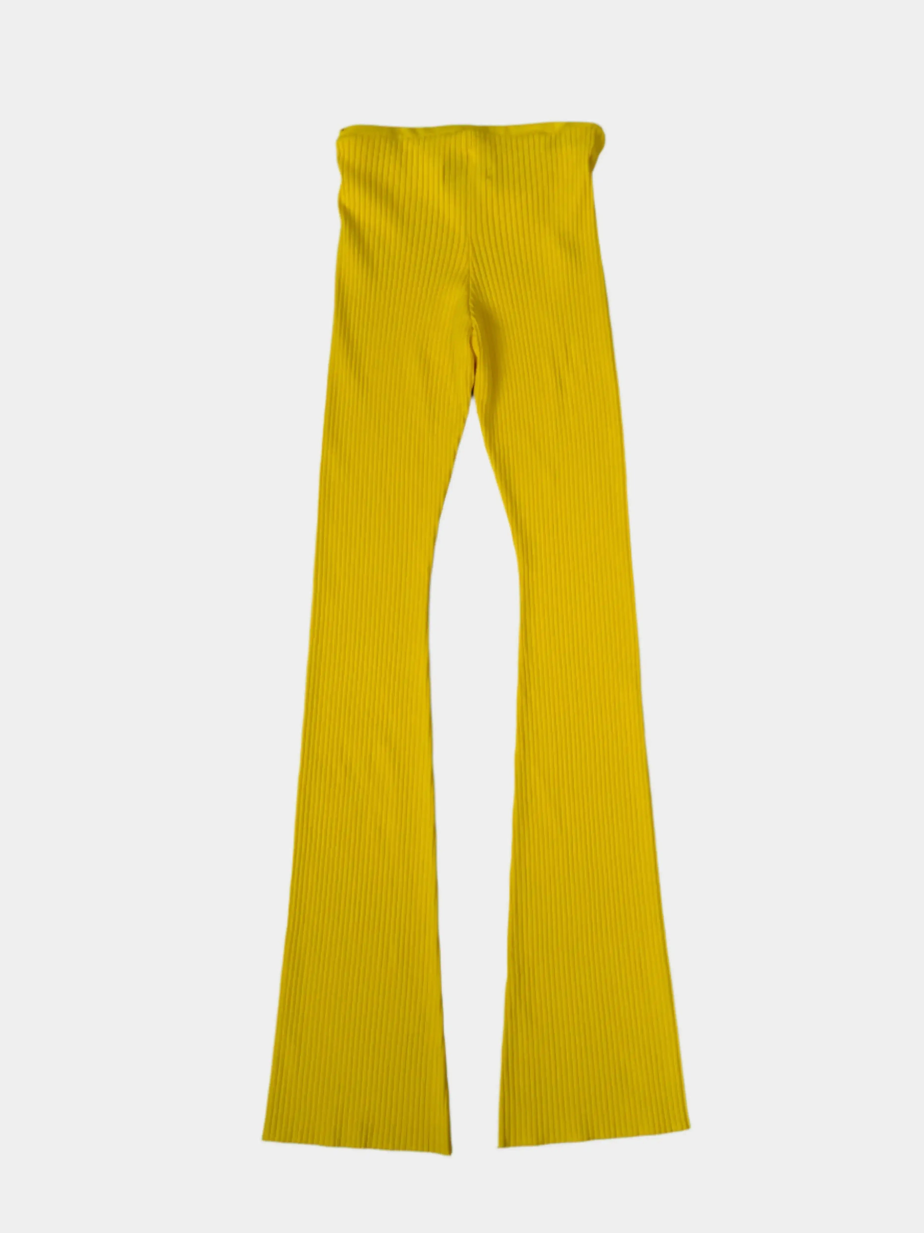 Realizzati in una luminosa maglia gialla a costine, questi pantaloni firmati Laneus combinano comfort e stile audace. Il design a gamba leggermente svasata valorizza la silhouette, mentre il tessuto elasticizzato garantisce una vestibilità impeccabile. Perfetti per creare outfit vivaci con un tocco moderno.