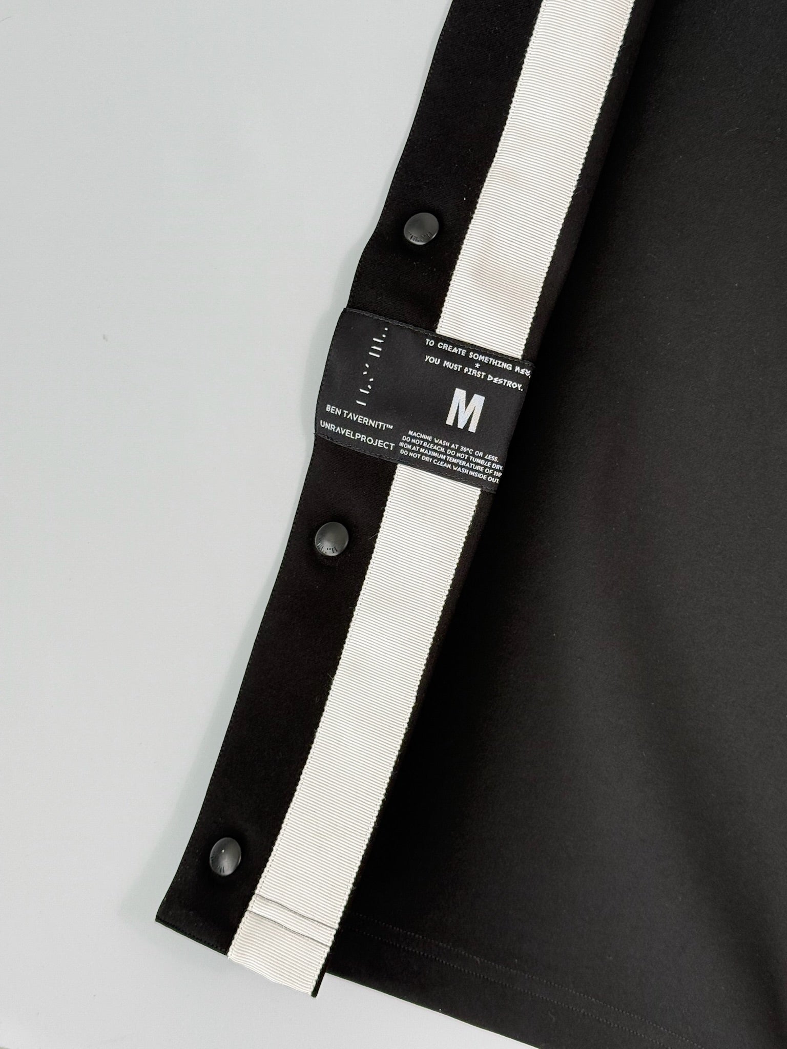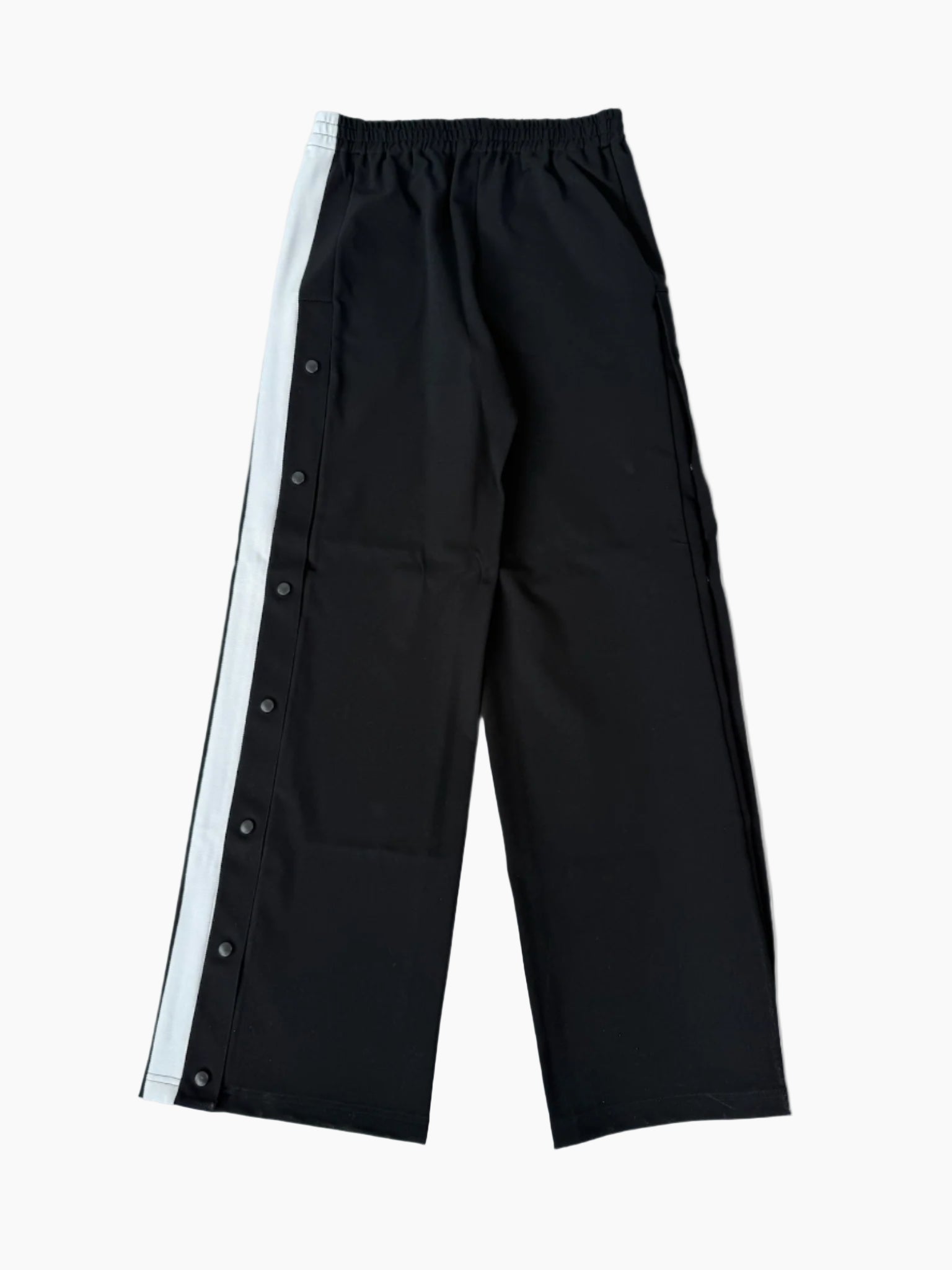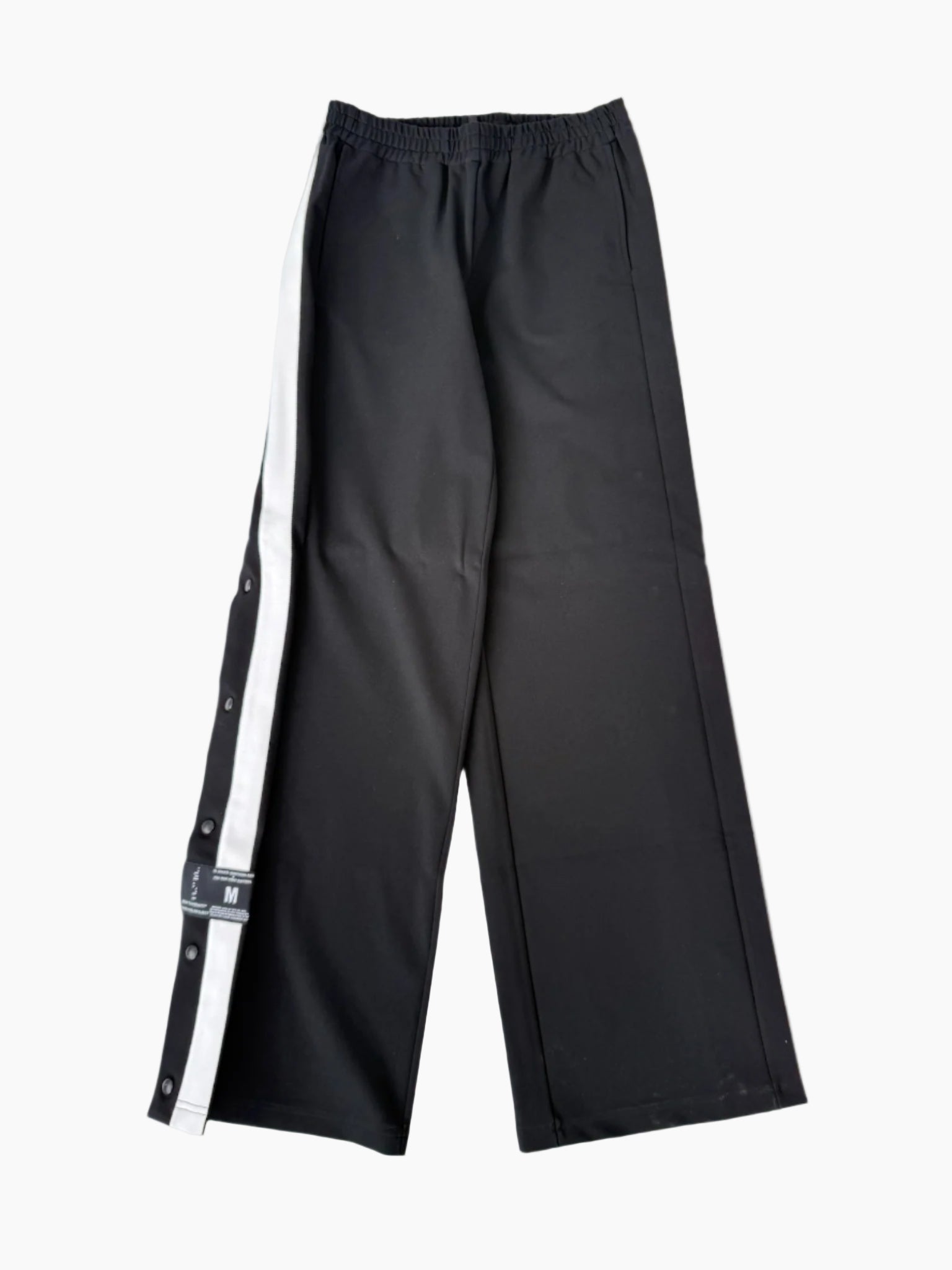 Pantaloni neri in jersey dalla linea ampia con chiusura laterale a bottoni automatici su tutta la gamba sinistra, arricchiti da una banda bianca a contrasto. Un capo dallo stile sportivo e destrutturato, firmato Unravel Project.