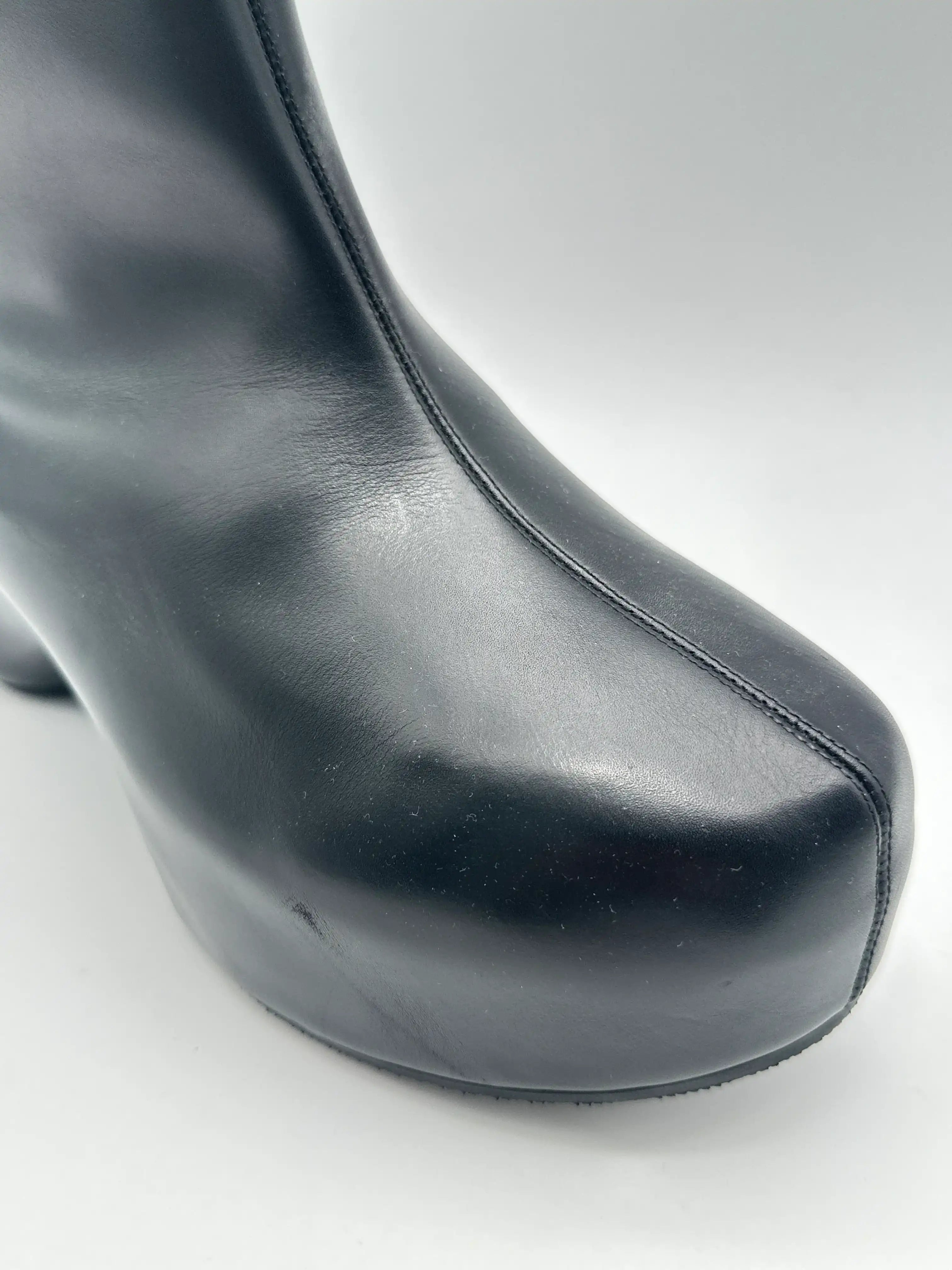 Design d'avanguardia per questi stivaletti Givenchy in pelle nera modellata effetto scultoreo. Caratterizzati da una silhouette monoblocco a punta squadrata, suola sagomata chunky e zip laterale con tirazip logato, rappresentano un connubio tra sperimentazione stilistica e comfort urbano. Il logo "GIVENCHY" è inciso tono su tono sulla tomaia laterale. Presentano leggeri segni di usura.