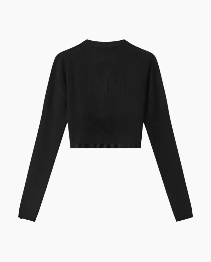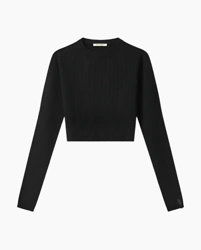 Crop top nero firmato Hinnominate, realizzato in maglia a costina mossa per un effetto stretch e confortevole. Presenta girocollo, maniche lunghe e una discreta etichetta applicata sul fondo manica. Un capo essenziale, perfetto per essere indossato da solo o in layering.