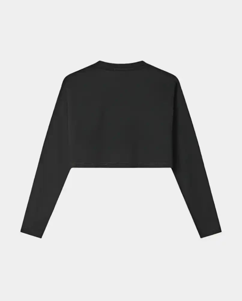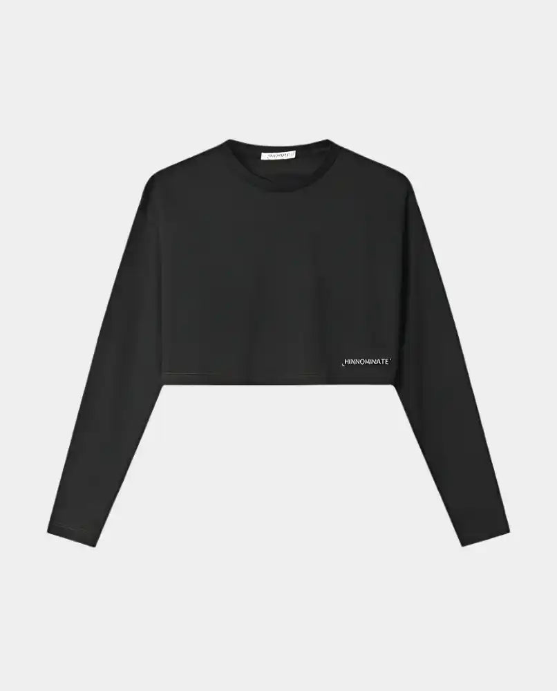 Crop top nero Hinnominate a manica lunga, realizzato in morbido jersey di cotone. Caratterizzato da una stampa logo minimal posizionata sul fondo frontale, è un capo versatile e confortevole perfetto per un look essenziale ma curato.