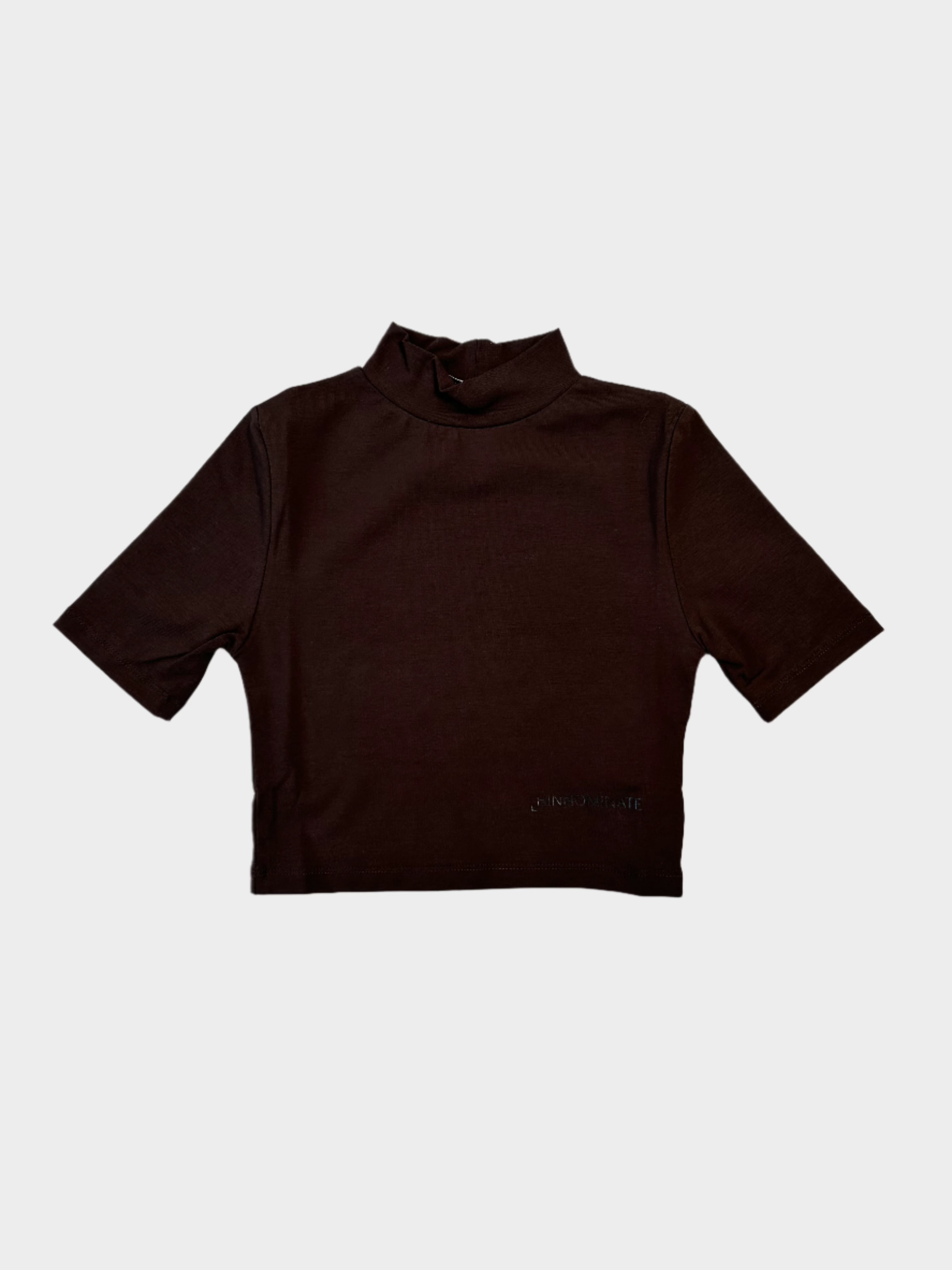 Crop top a mezza manica in bielastico color marrone con collo a lupetto. Un capo dal design aderente e moderno, ideale per completare look minimal e casual con un tocco attuale e versatile.