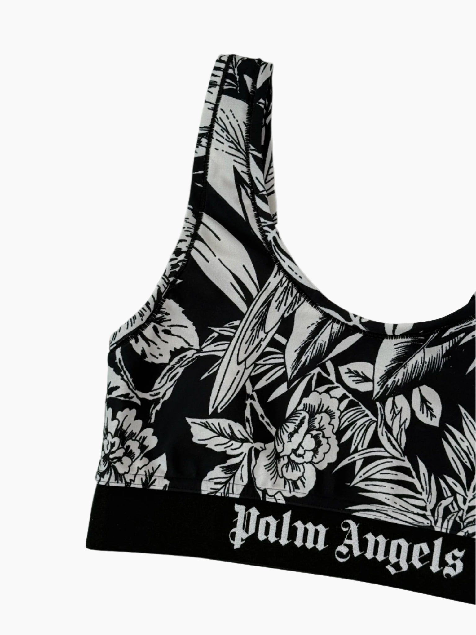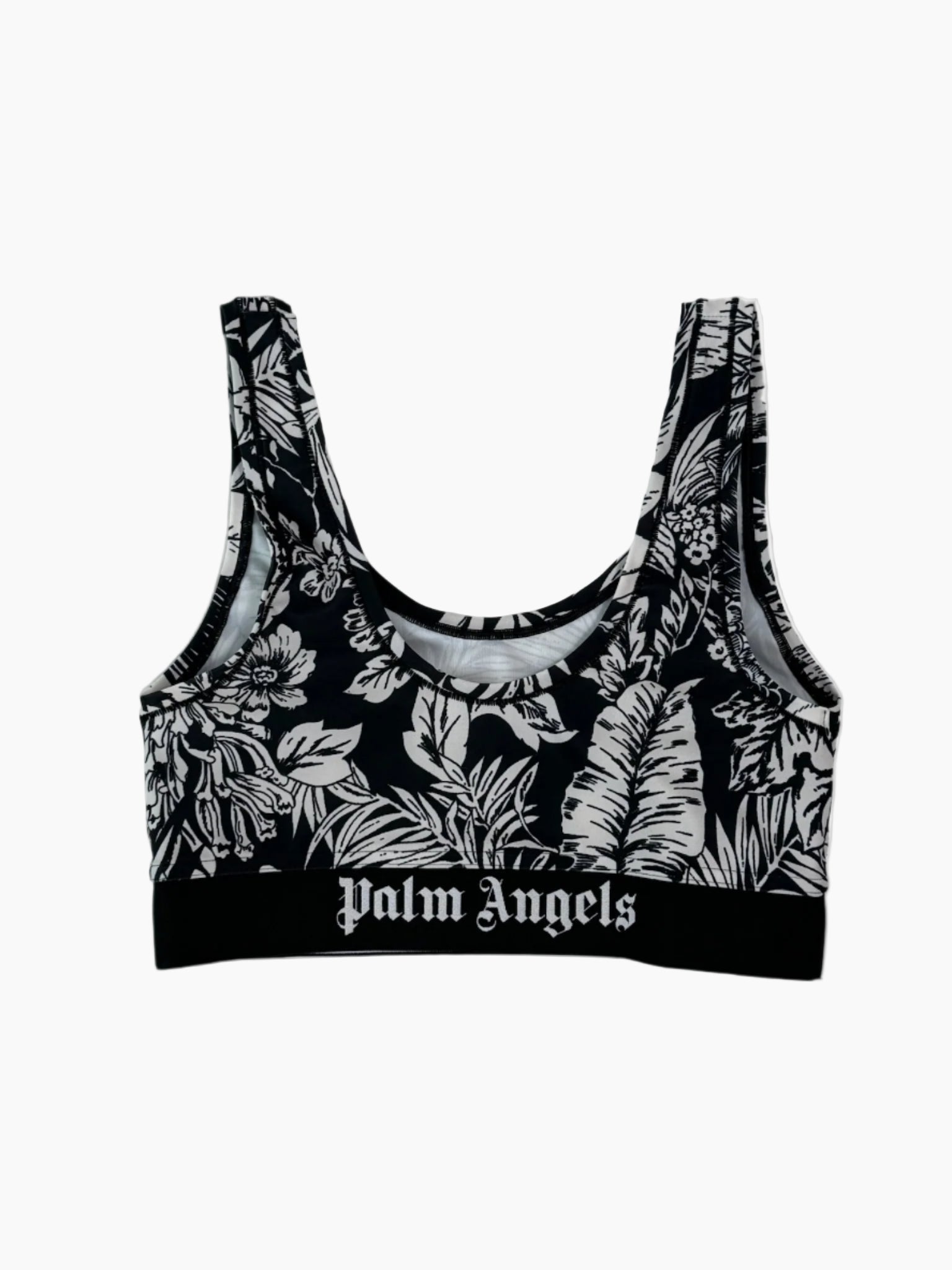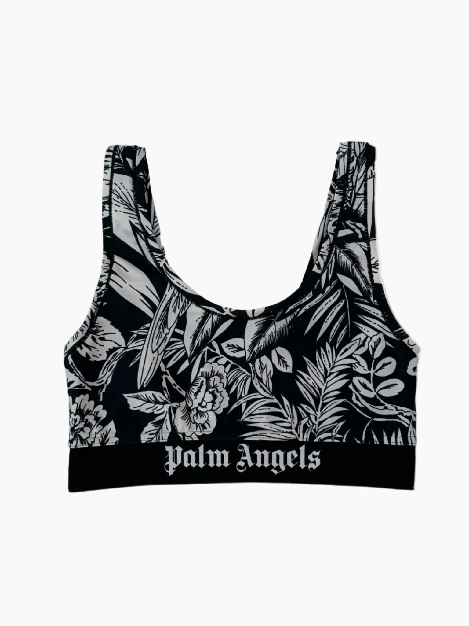 Top sportivo a fascia con spalline larghe, realizzato in tessuto tecnico elasticizzato. La stampa jungle bianca dona un tocco esotico e grafico, mentre l'elastico sotto seno con logo a contrasto assicura supporto e stile.