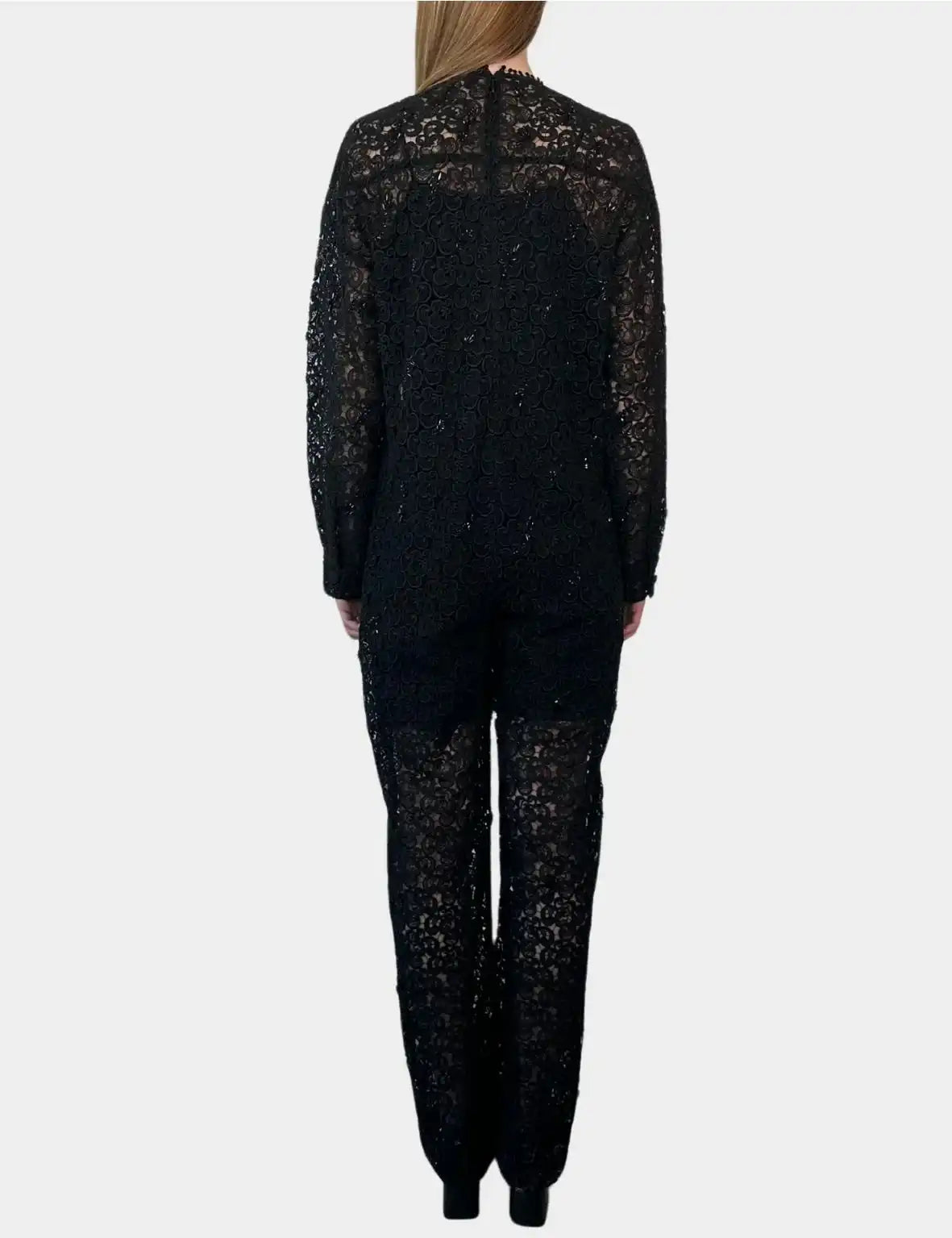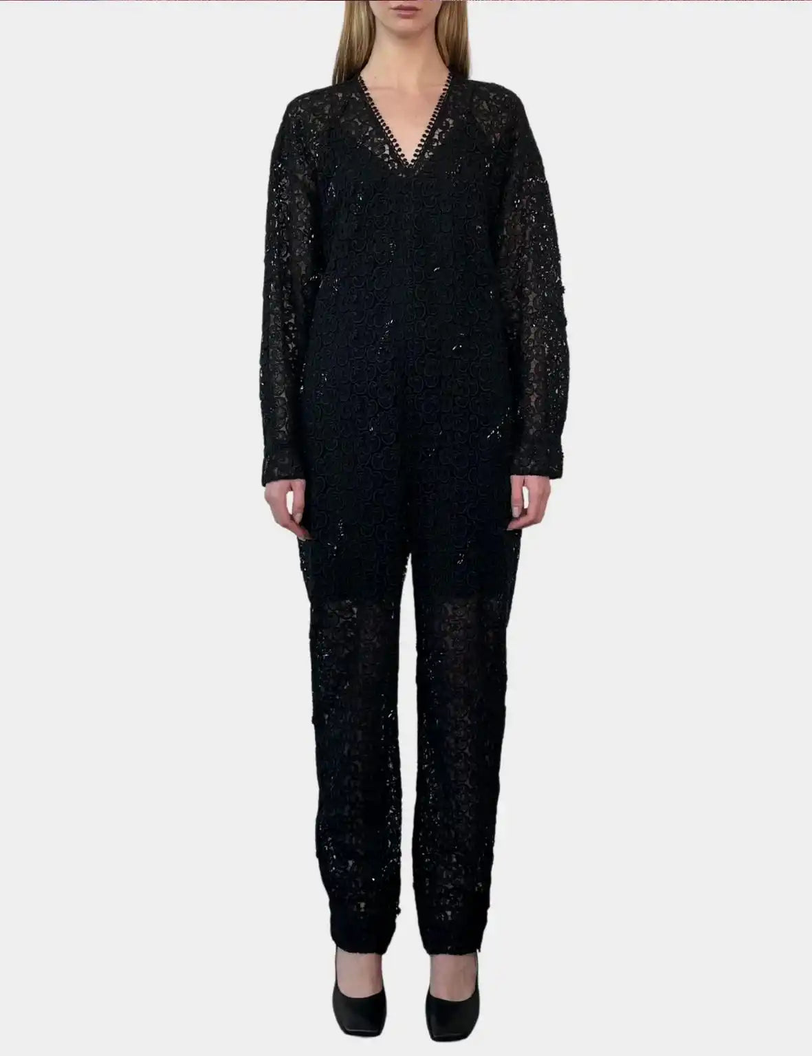 La tuta nera firmata Givenchy è un capo di carattere che unisce l’eleganza di un abito alla praticità di una jumpsuit. Realizzata in tessuto fluido, presenta una silhouette pulita con scollo tondo, spalle definite e pantaloni ampi a palazzo. Perfetta per eventi serali o occasioni speciali, è un’alternativa sofisticata al classico vestito.