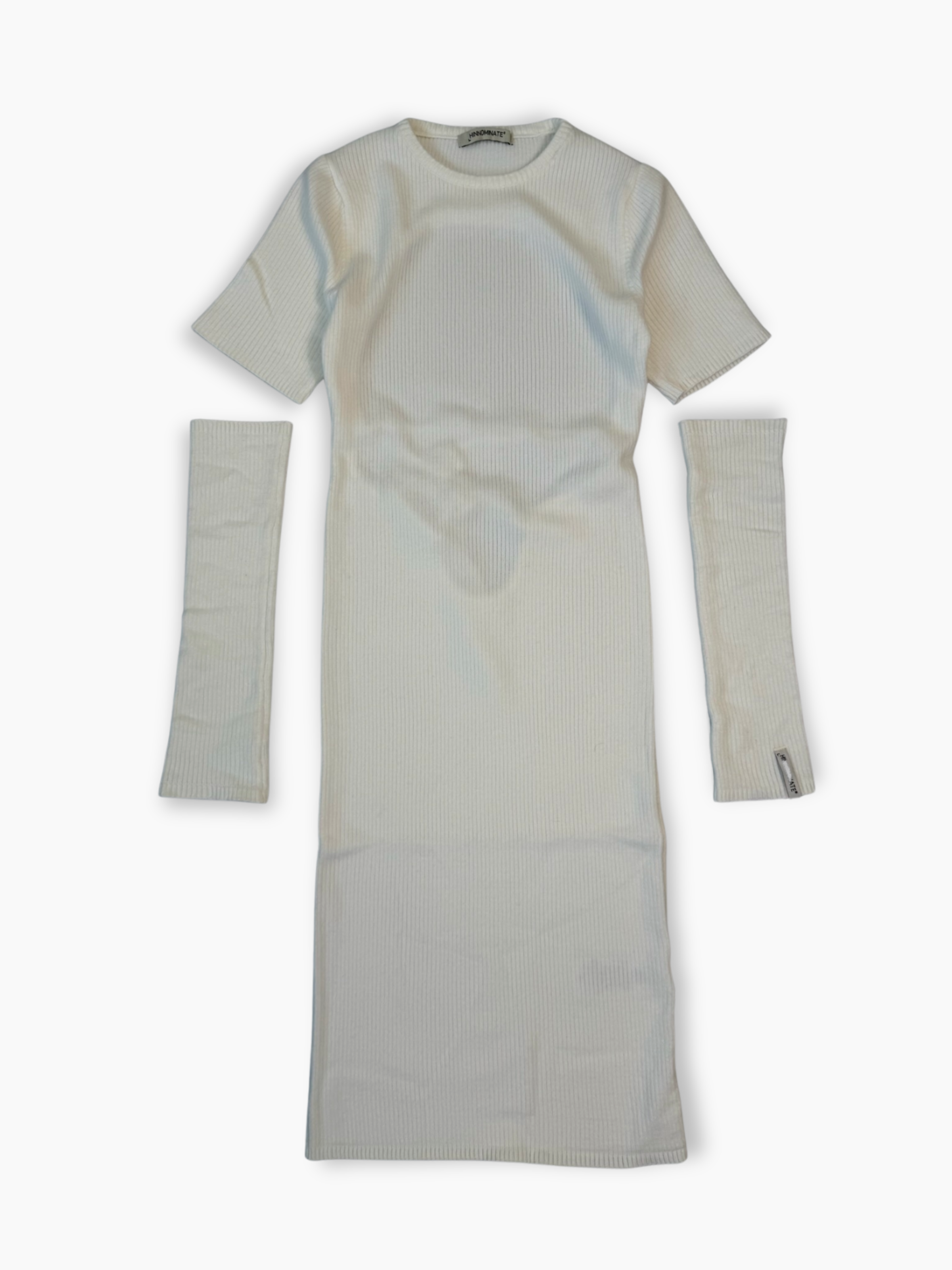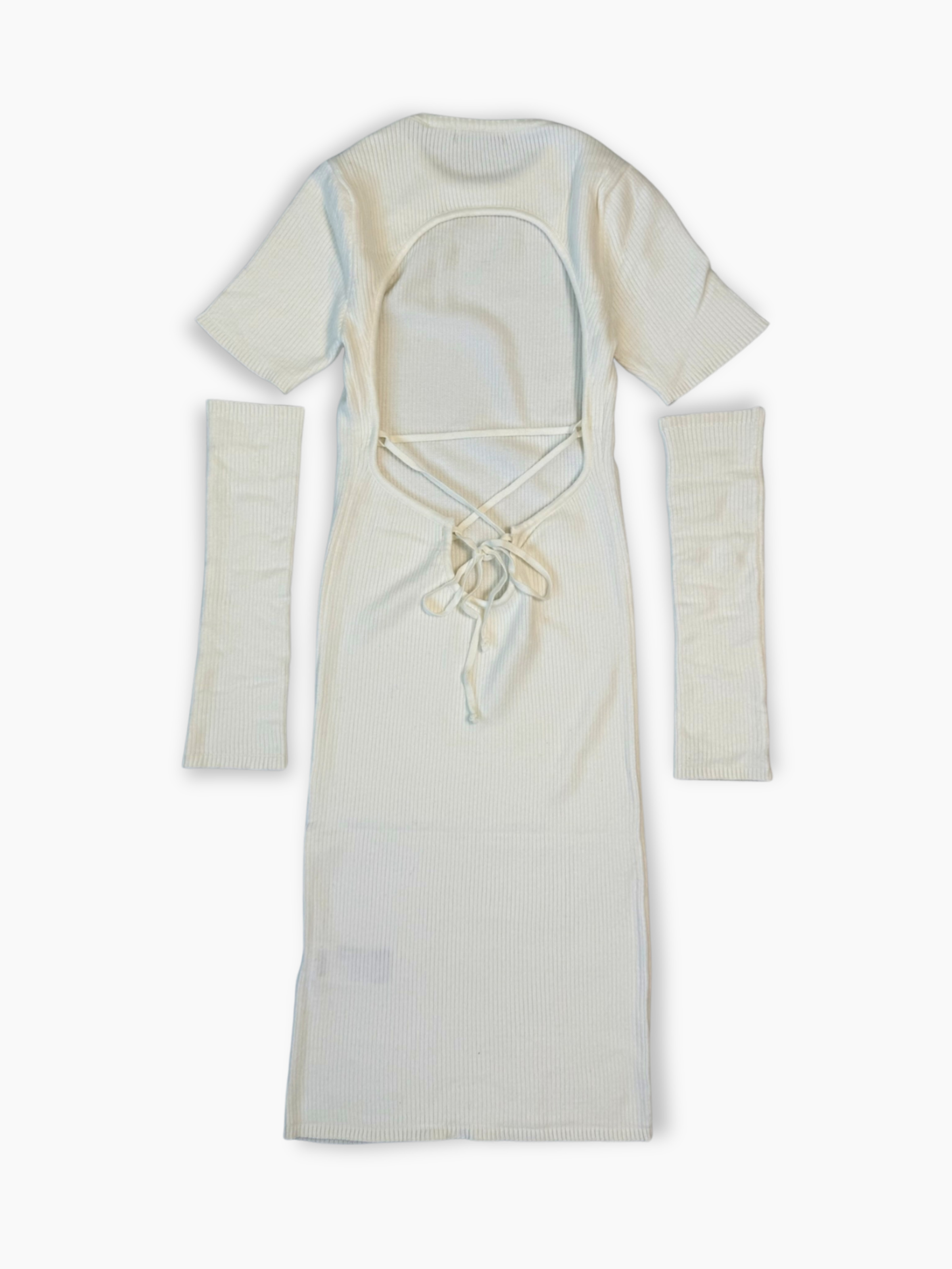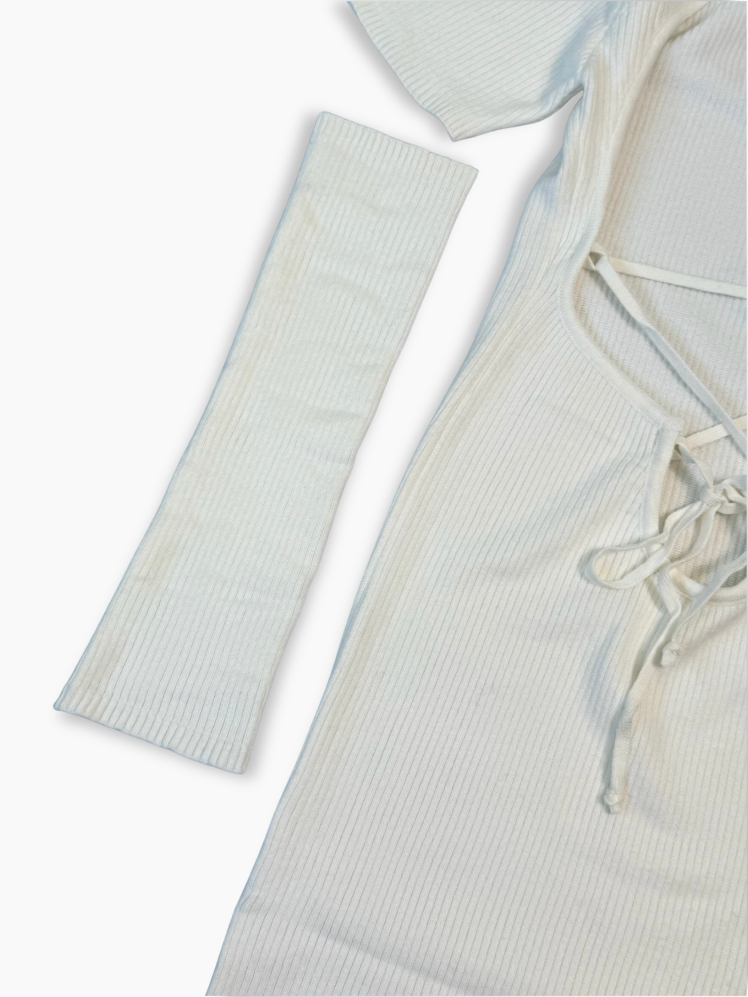 Abito corto in maglia a costine color bianco con vestibilità aderente e maniche corte. Il design minimal si arricchisce di un dettaglio sensuale: l’apertura posteriore che lascia intravedere la schiena, perfetta per un look elegante e contemporaneo. Un capo essenziale nel guardaroba, ideale per la stagione.