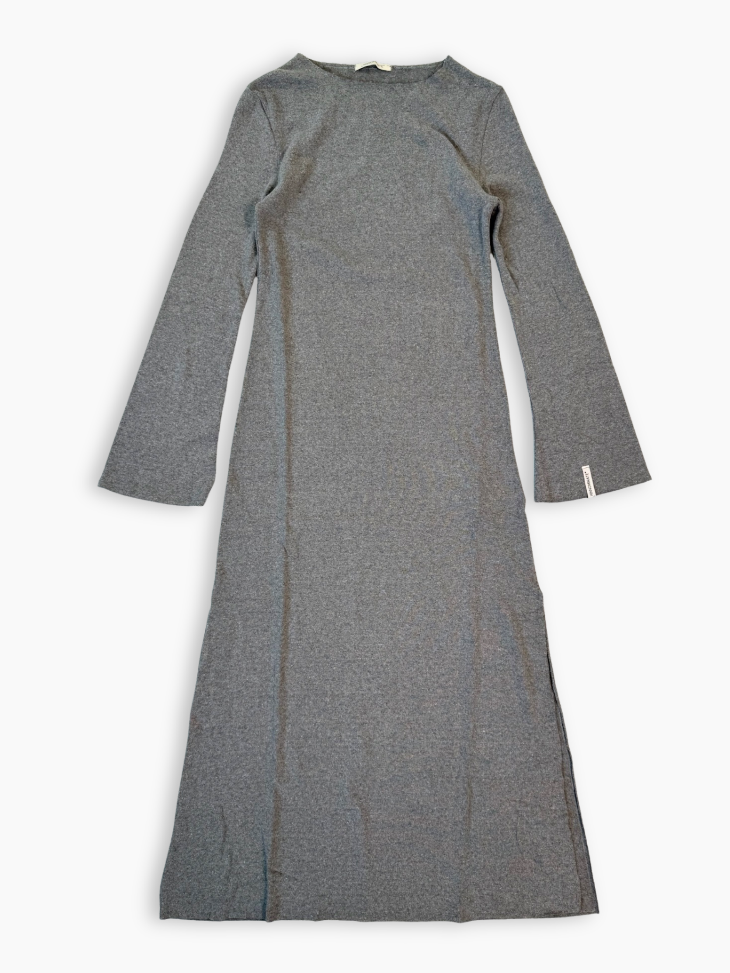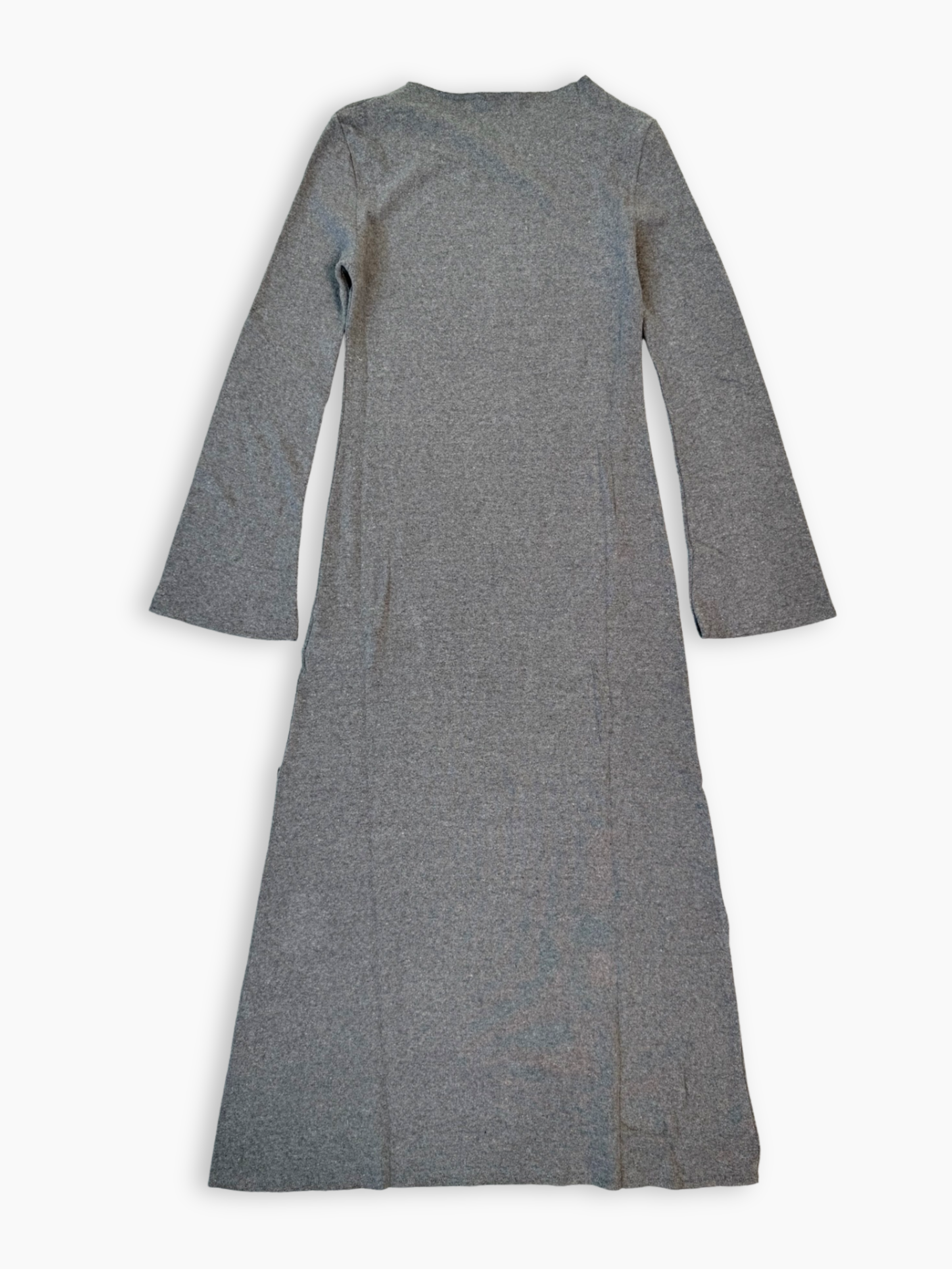 Abito midi in tessuto morbido color grigio melange, caratterizzato da un design essenziale con girocollo e maniche lunghe. Lo spacco laterale aggiunge un tocco femminile e dinamico, mantenendo un’eleganza discreta e contemporanea. Un capo versatile e confortevole, ideale per il quotidiano o per un look minimal chic.