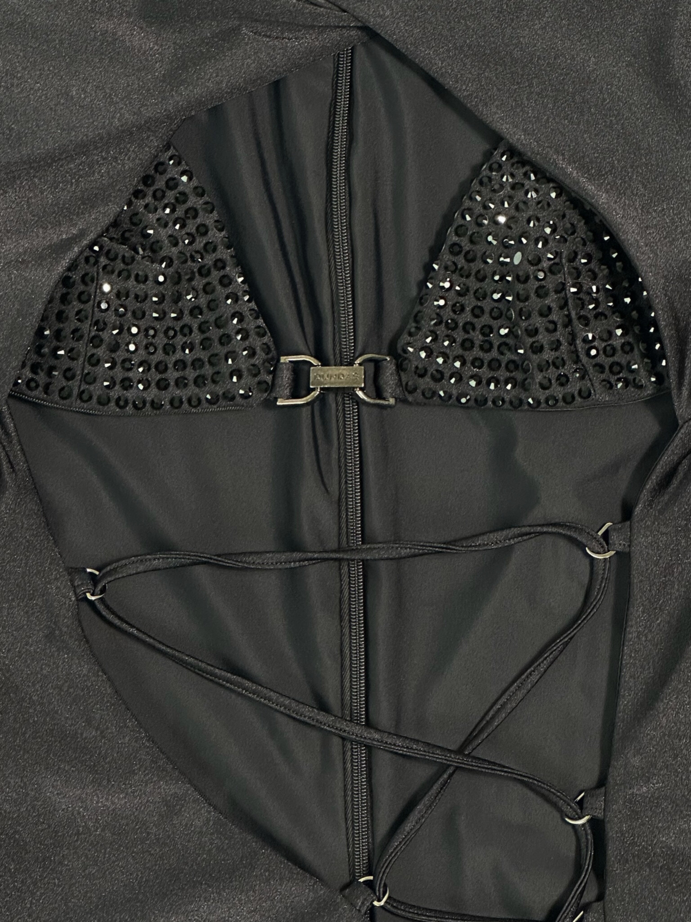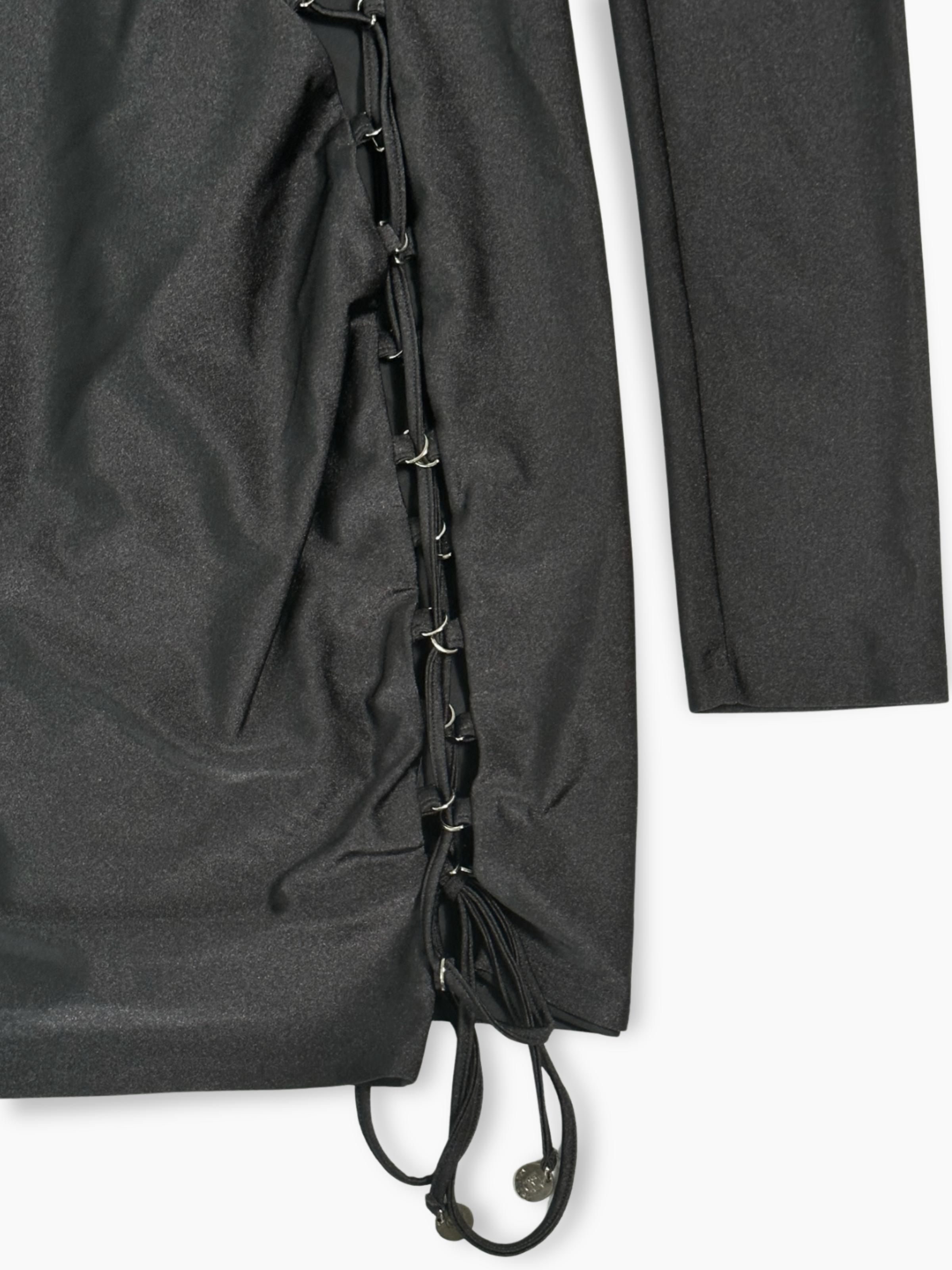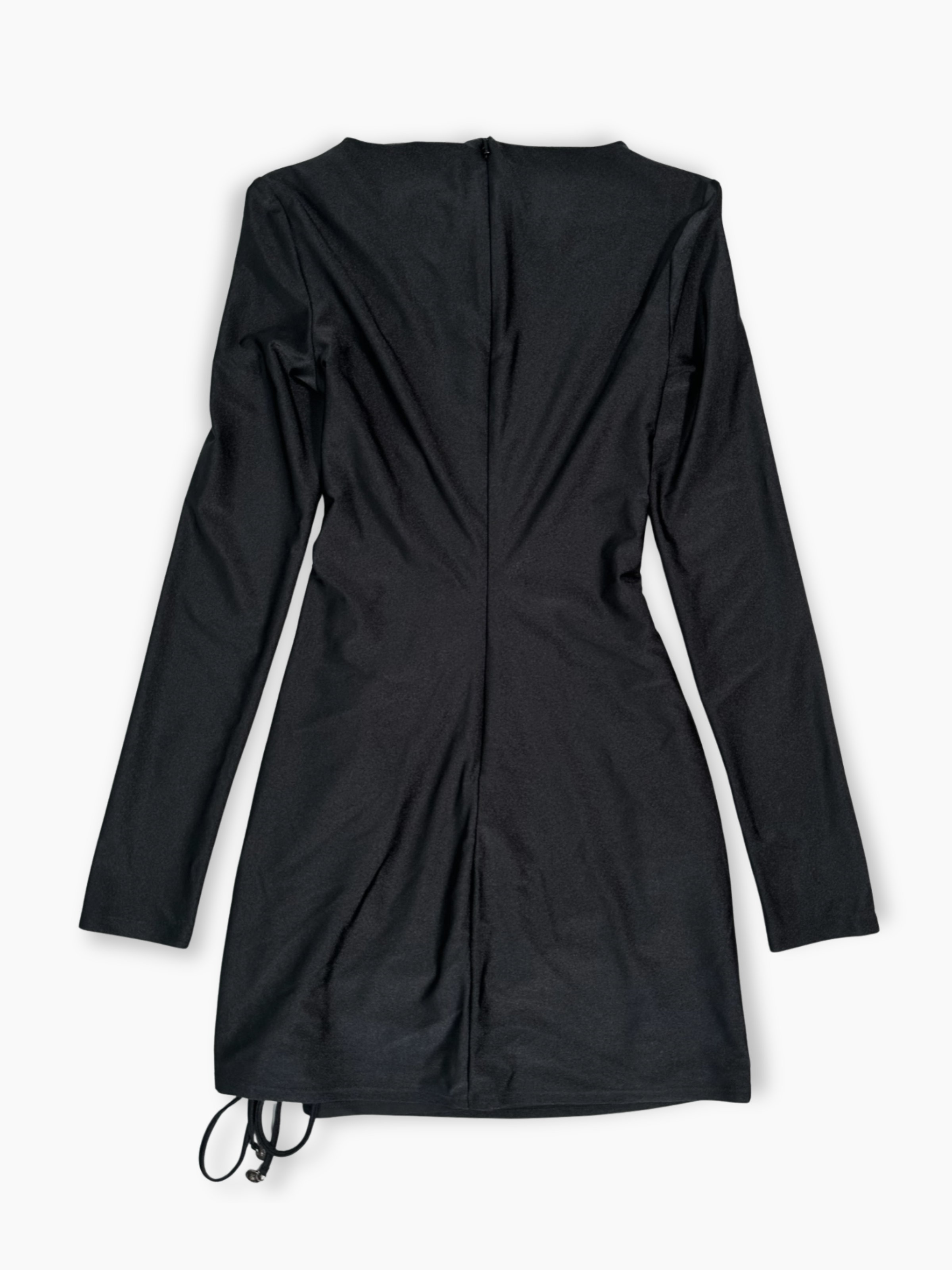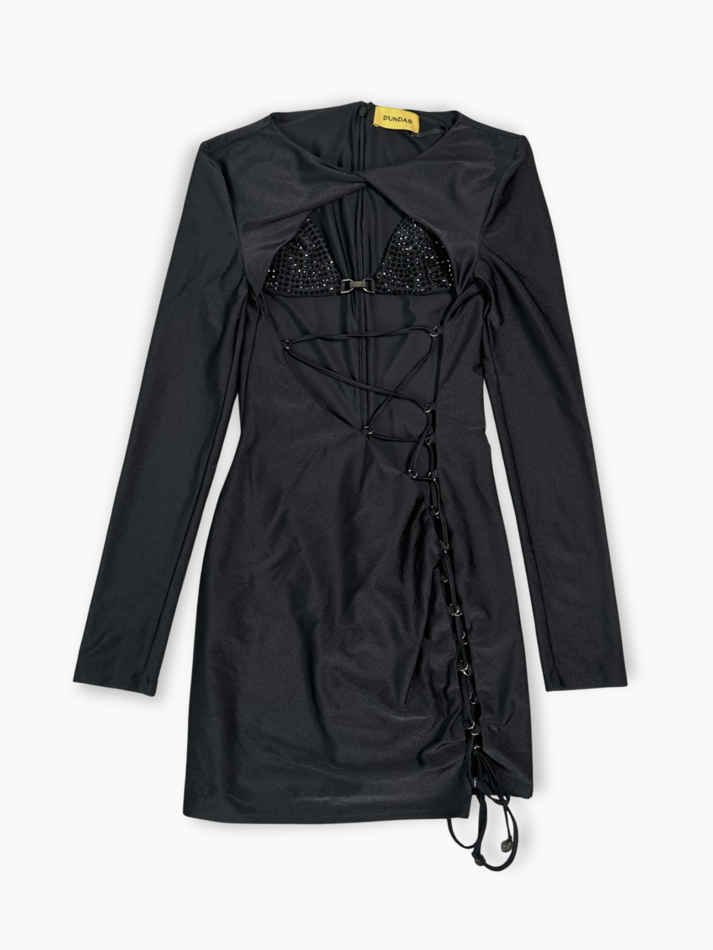 Abito nero a maniche lunghe con tagli cut-out frontali e intrecci con lacci che valorizzano la silhouette. Il modello è arricchito da un reggiseno integrato decorato con strass neri, per un look audace e glamour. La chiusura posteriore con zip garantisce una vestibilità perfetta, mentre il dettaglio arricciato con laccetti laterali dona carattere e movimento al capo.