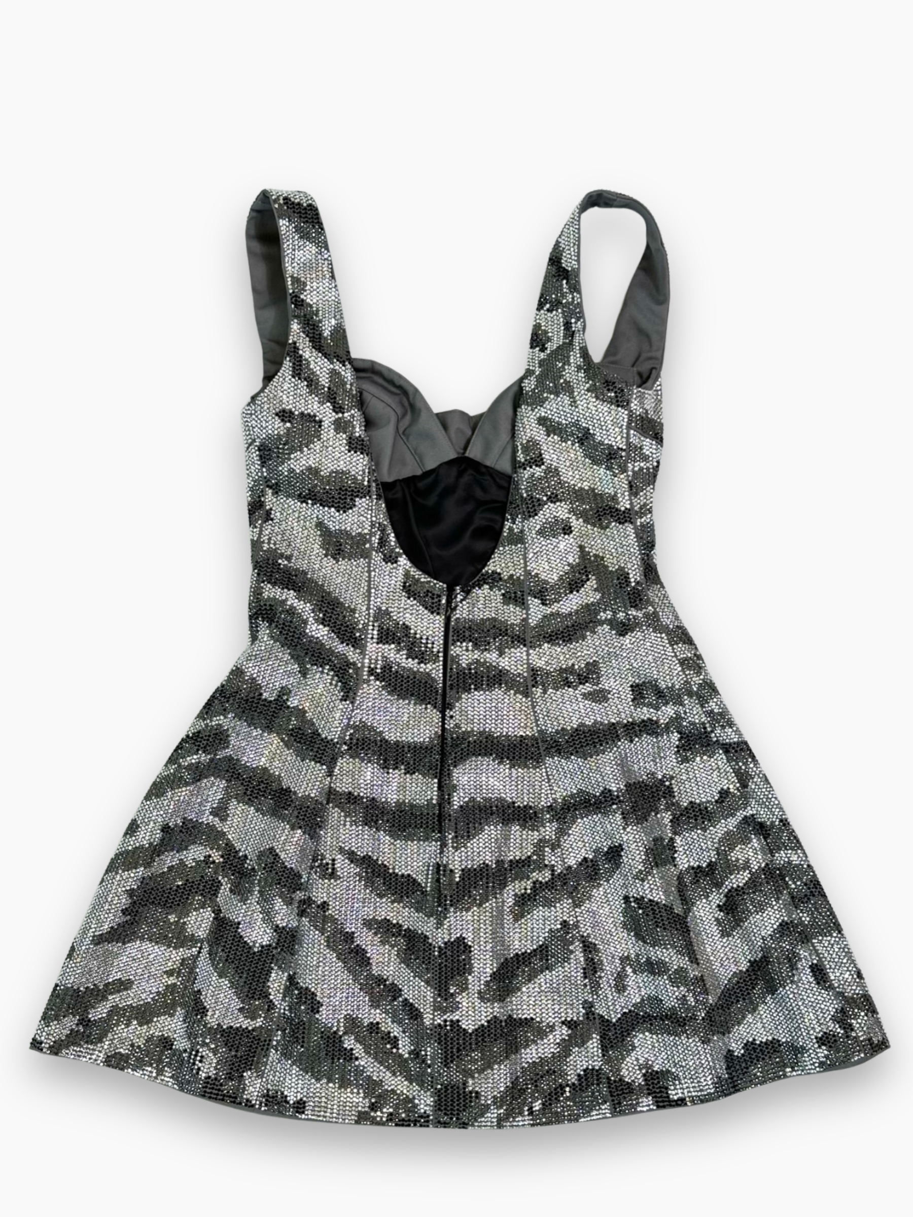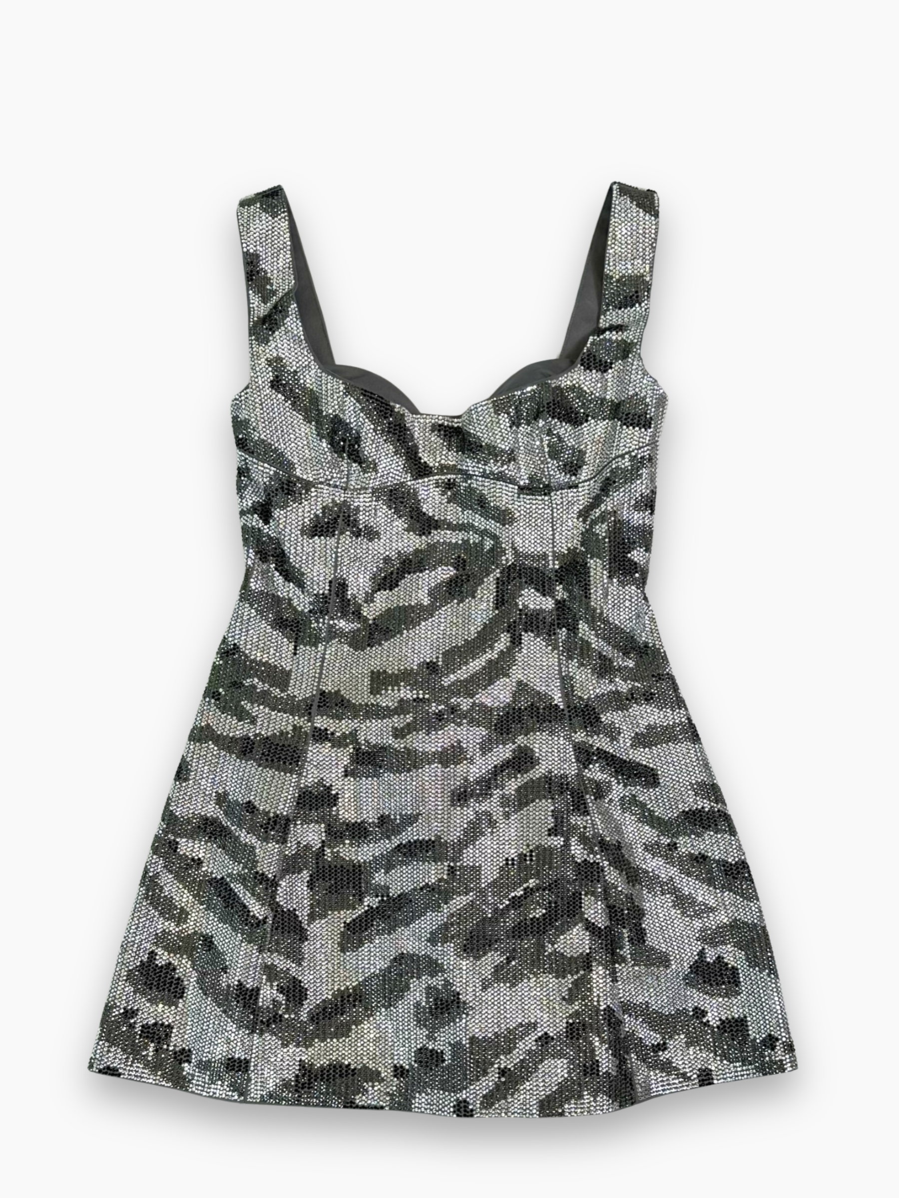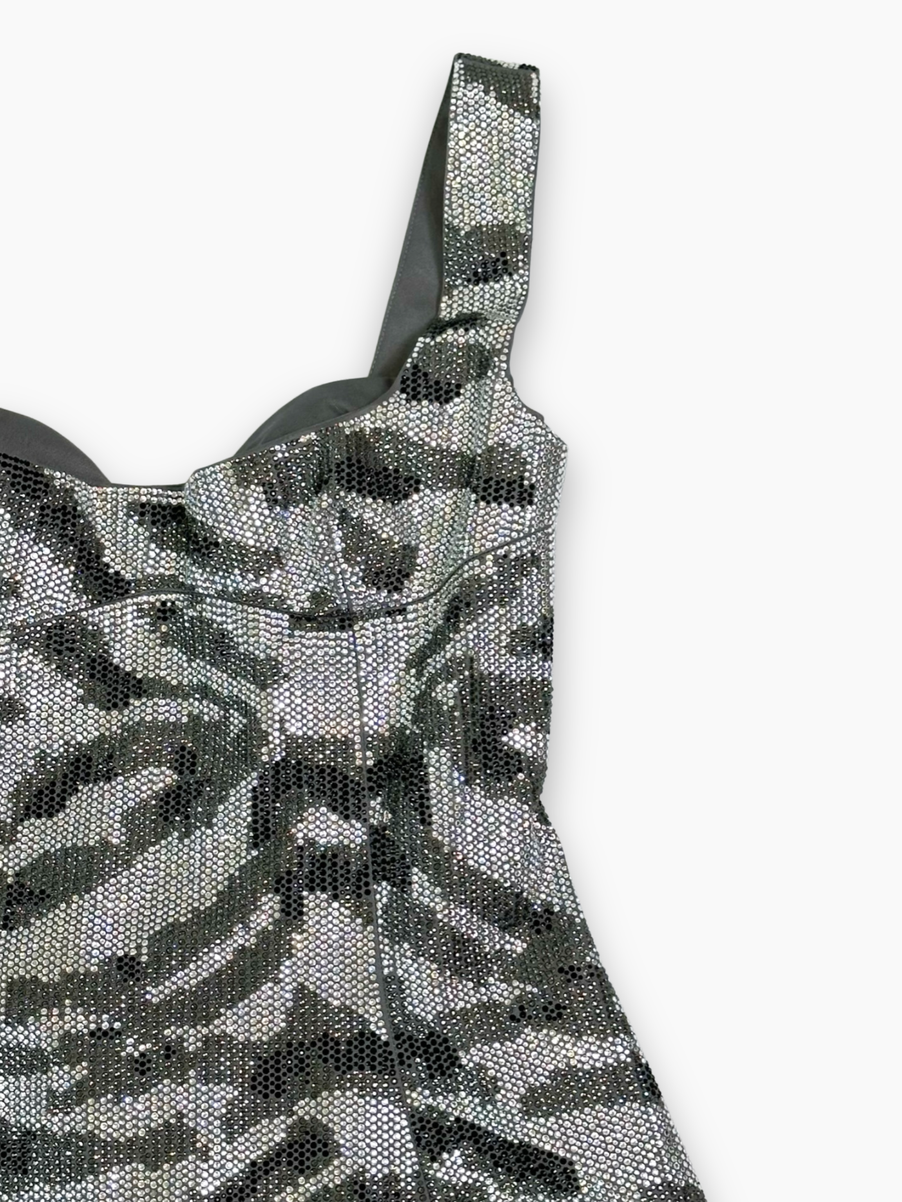 Abito mini in paillettes con motivo camouflage nei toni del grigio, caratterizzato da una linea svasata e da un bustier strutturato che valorizza la silhouette. Le spalline larghe assicurano una vestibilità stabile e confortevole, mentre l’effetto brillante lo rende ideale per look da sera dal carattere deciso.