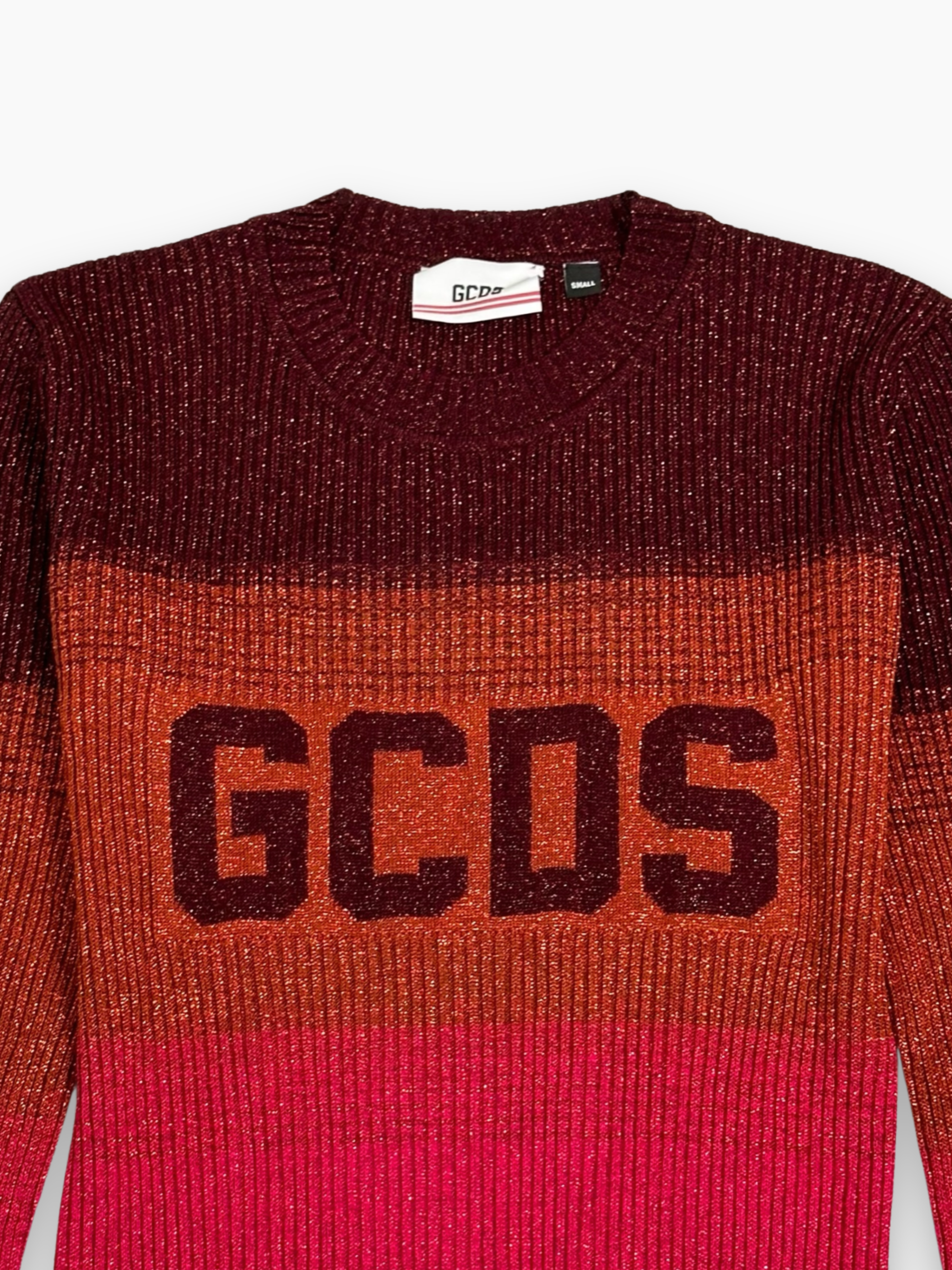 Abito corto in maglia multicolor con sfumature rosse, arancioni e fucsia. Il design presenta una lavorazione a costine che avvolge la silhouette, mentre il logo GCDS ricamato sul petto aggiunge un tocco iconico e grintoso. Le maniche lunghe e la vestibilità aderente rendono il modello perfetto per look casual ma ricercati.