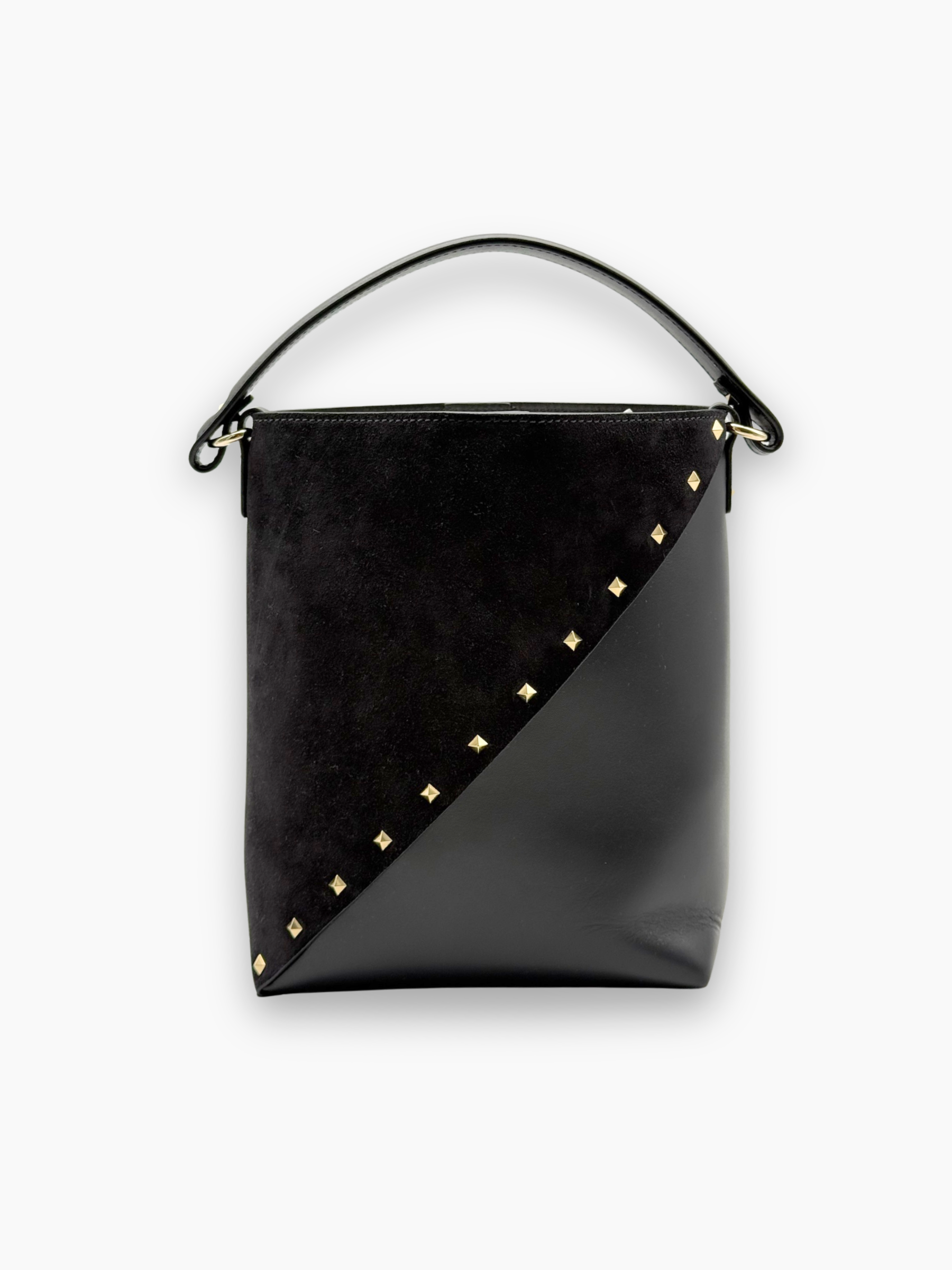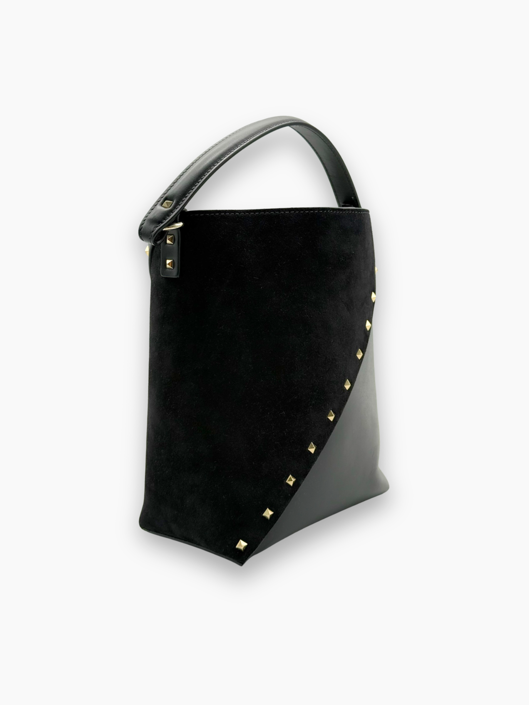 Borsa a secchiello nera modello Rockstud, realizzata in pregiata pelle liscia di alta qualità. Il design raffinato è arricchito dalle iconiche borchie piramidali dorate, simbolo dello stile distintivo della maison. Dotata di tracolla regolabile e chiusura con coulisse, unisce eleganza e personalità, diventando l’accessorio ideale per look chic dal carattere deciso.
