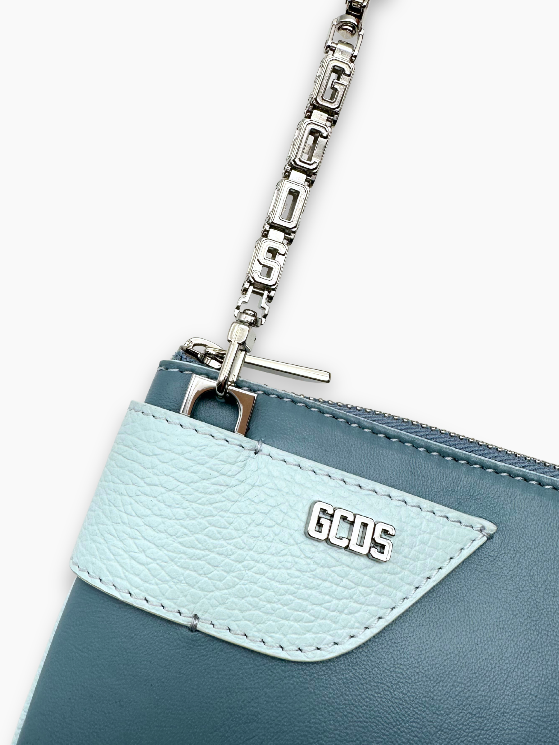 Borsa GCDS in pelle liscia azzurra dal design compatto e moderno, caratterizzata da una silhouette pulita e da dettagli metallici raffinati. Il dettaglio frontale sovrapposto in pelle a grana e il logo metallico applicato aggiungono un tocco distintivo. Un modello elegante e versatile, ideale per l’uso quotidiano o per completare look da sera con una nota di colore delicato.