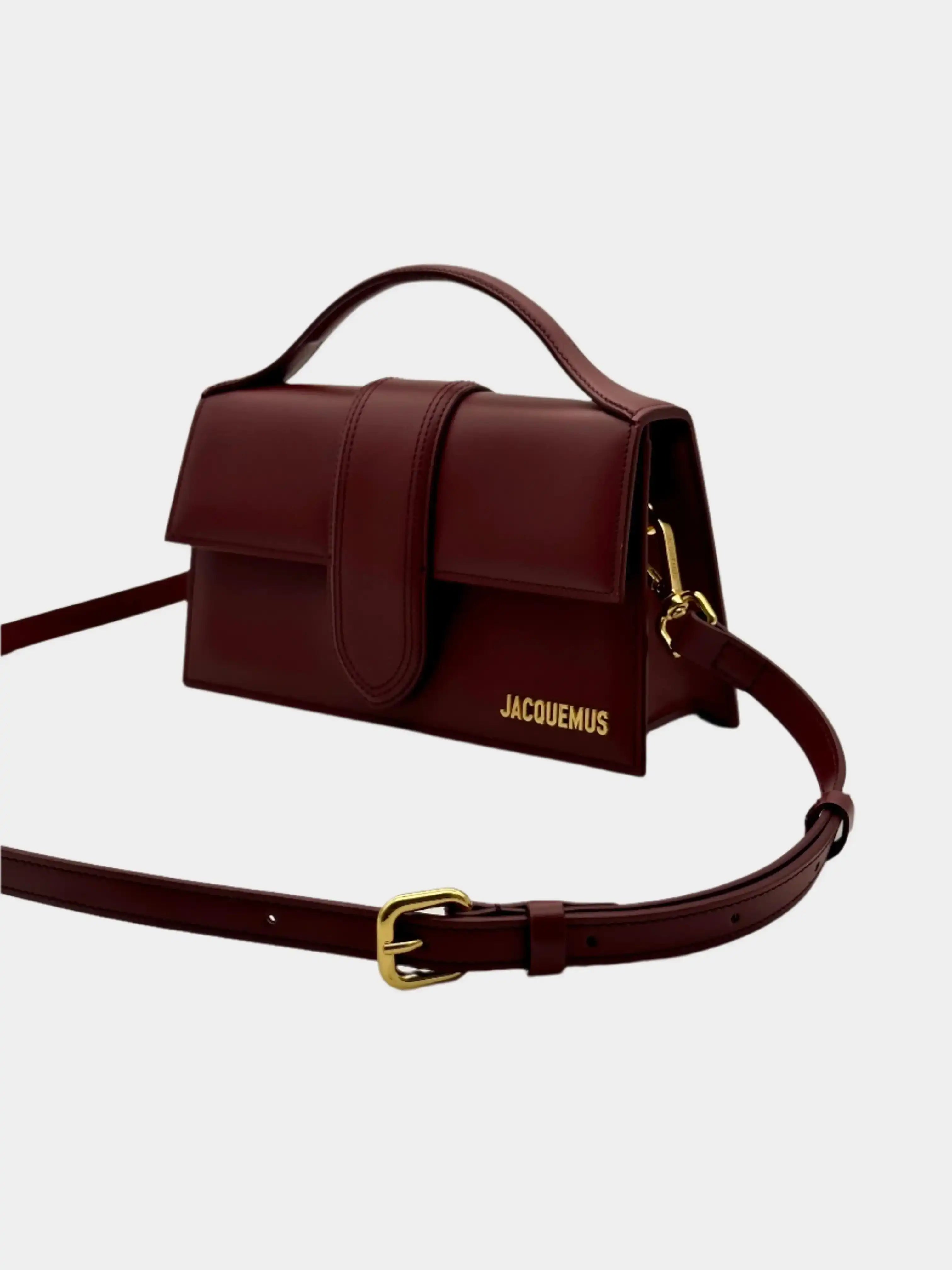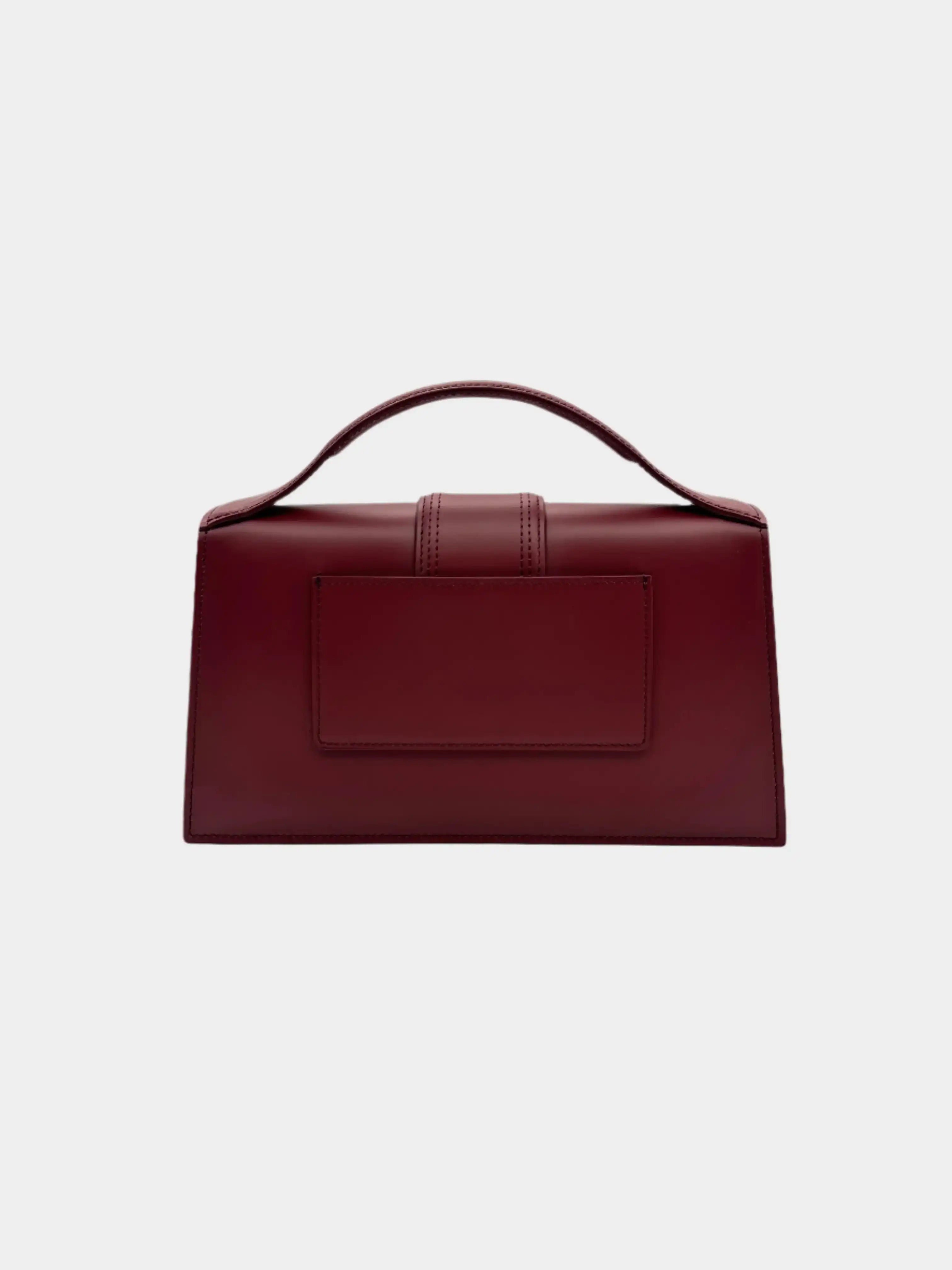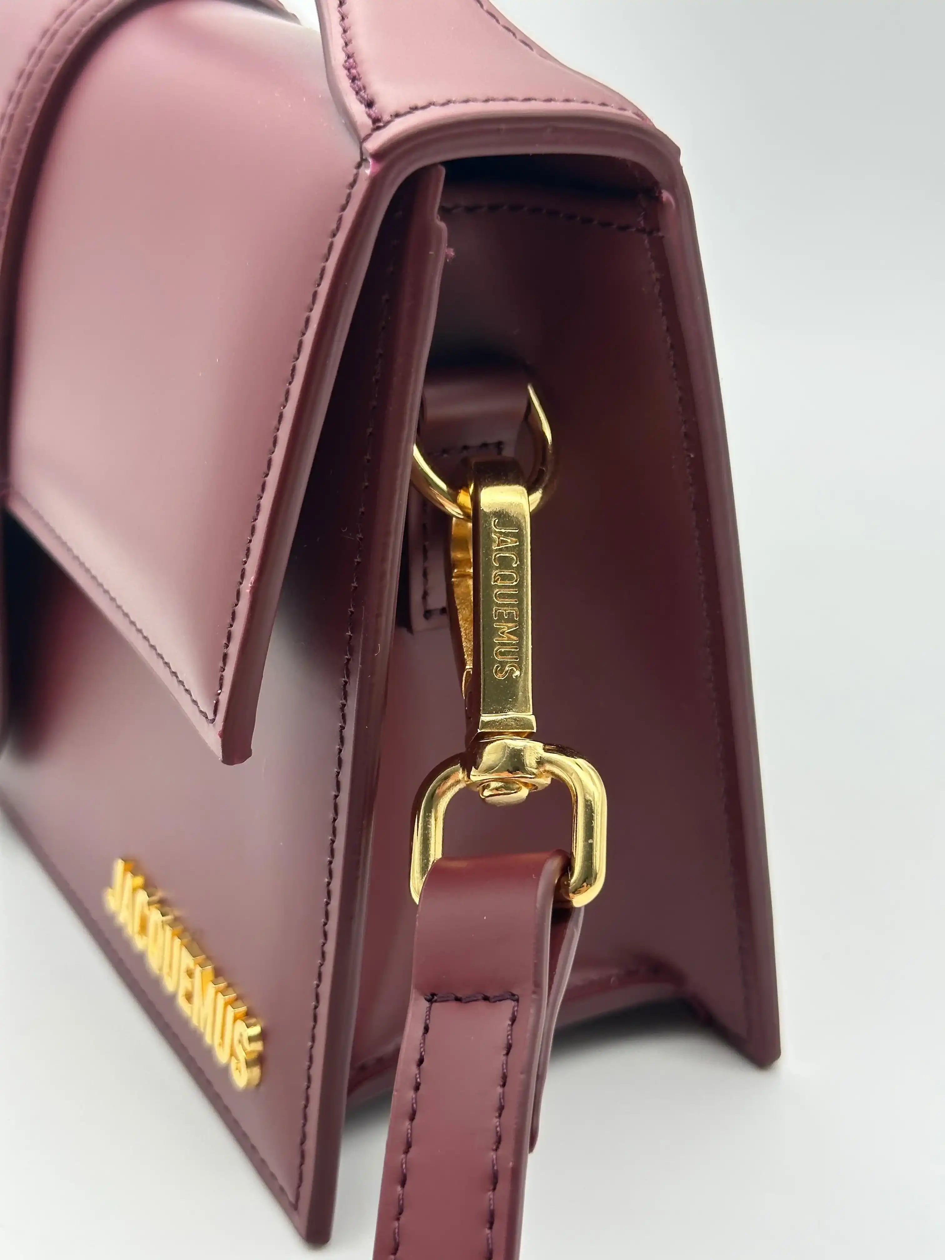 La borsa Jacquemus Le Grand Bambino burgundy in pelle opaca è un modello elegante e sofisticato, ideale per chi cerca un accessorio dal carattere deciso. Caratterizzata da un design rettangolare con patta frontale e manico superiore rigido, è dotata di tracolla regolabile e rimovibile con moschettoni in metallo dorato. La chiusura magnetica con linguetta garantisce praticità, mentre il logo Jacquemus in metallo dorato aggiunge un dettaglio iconico.