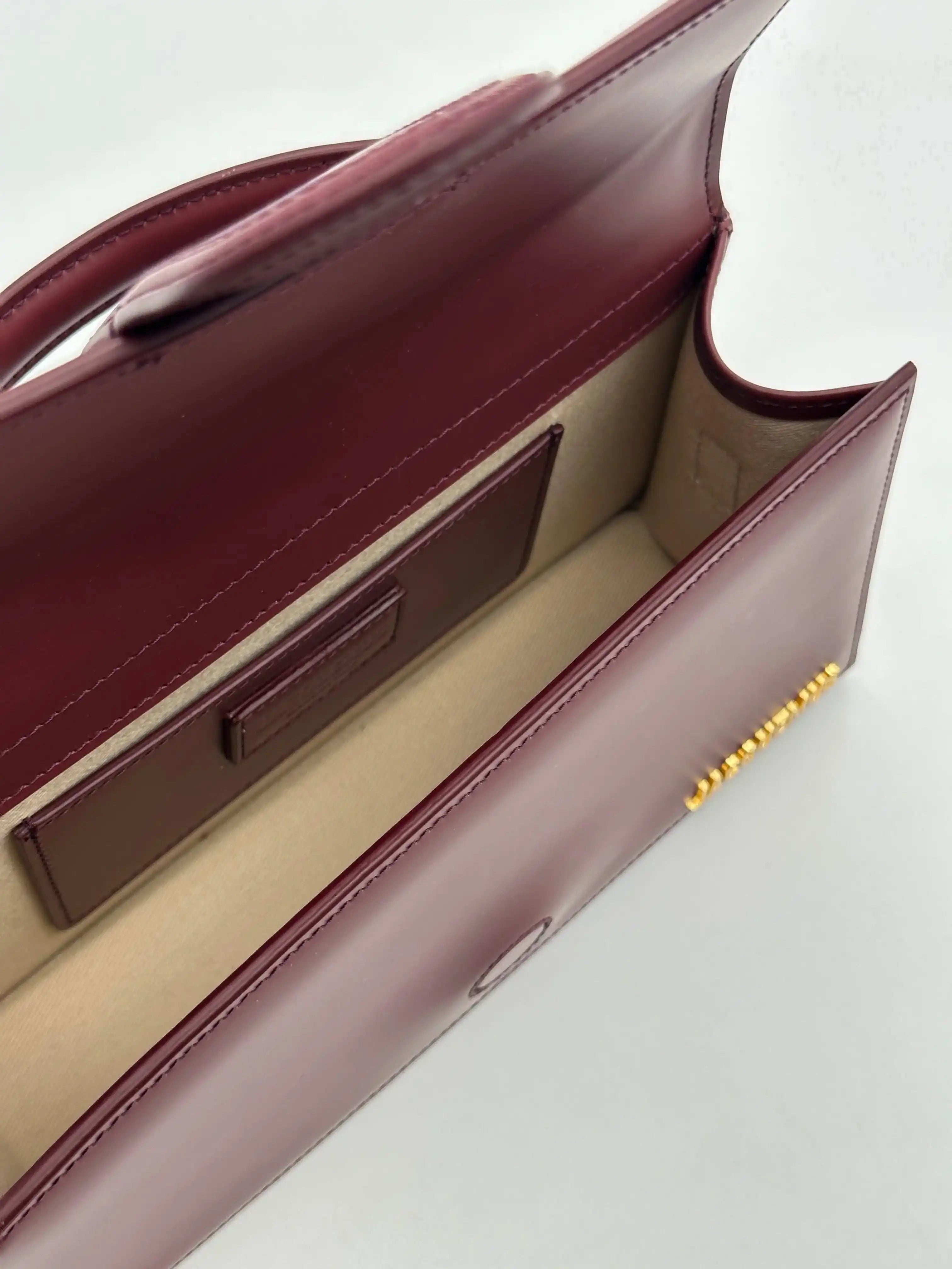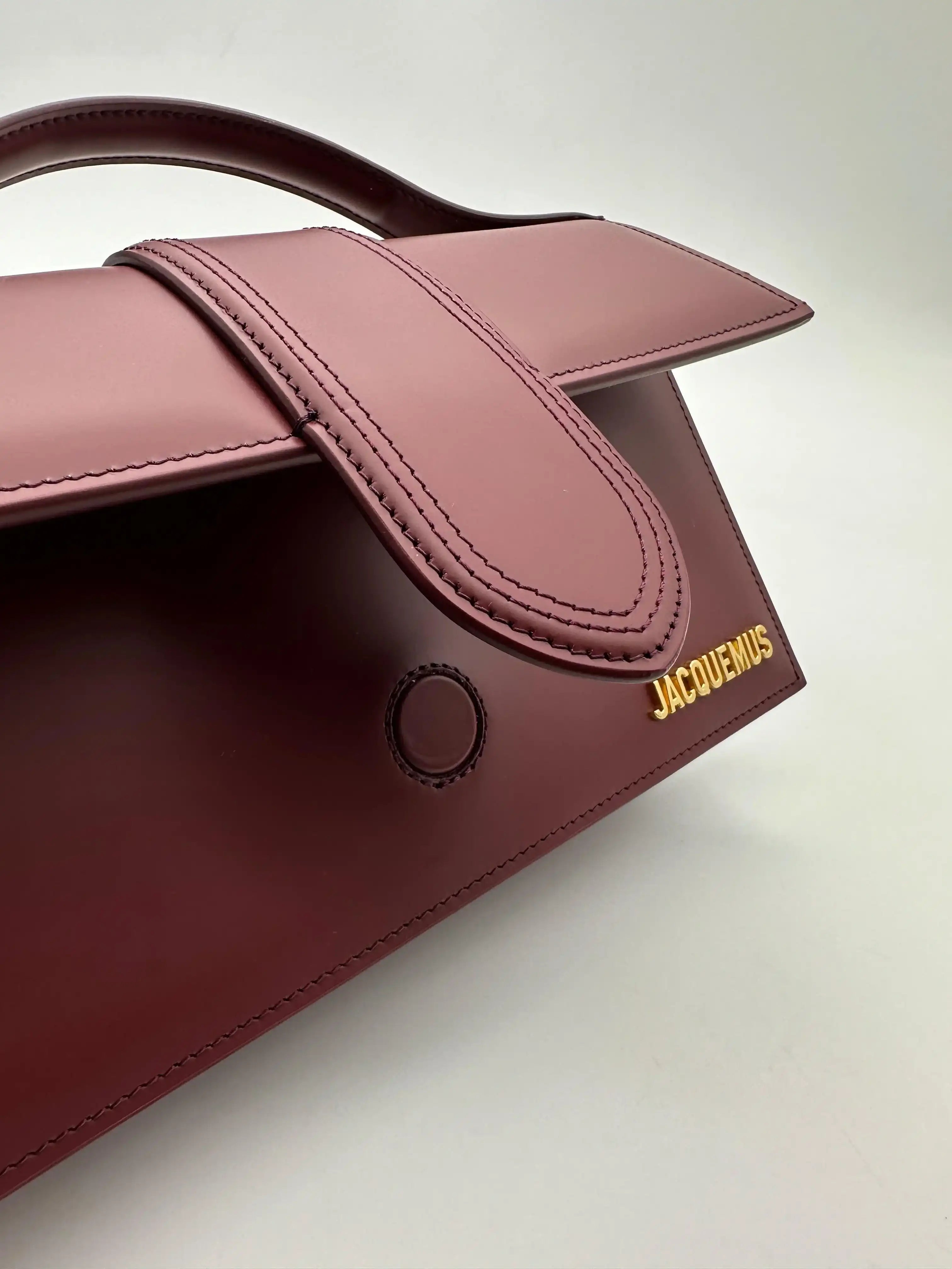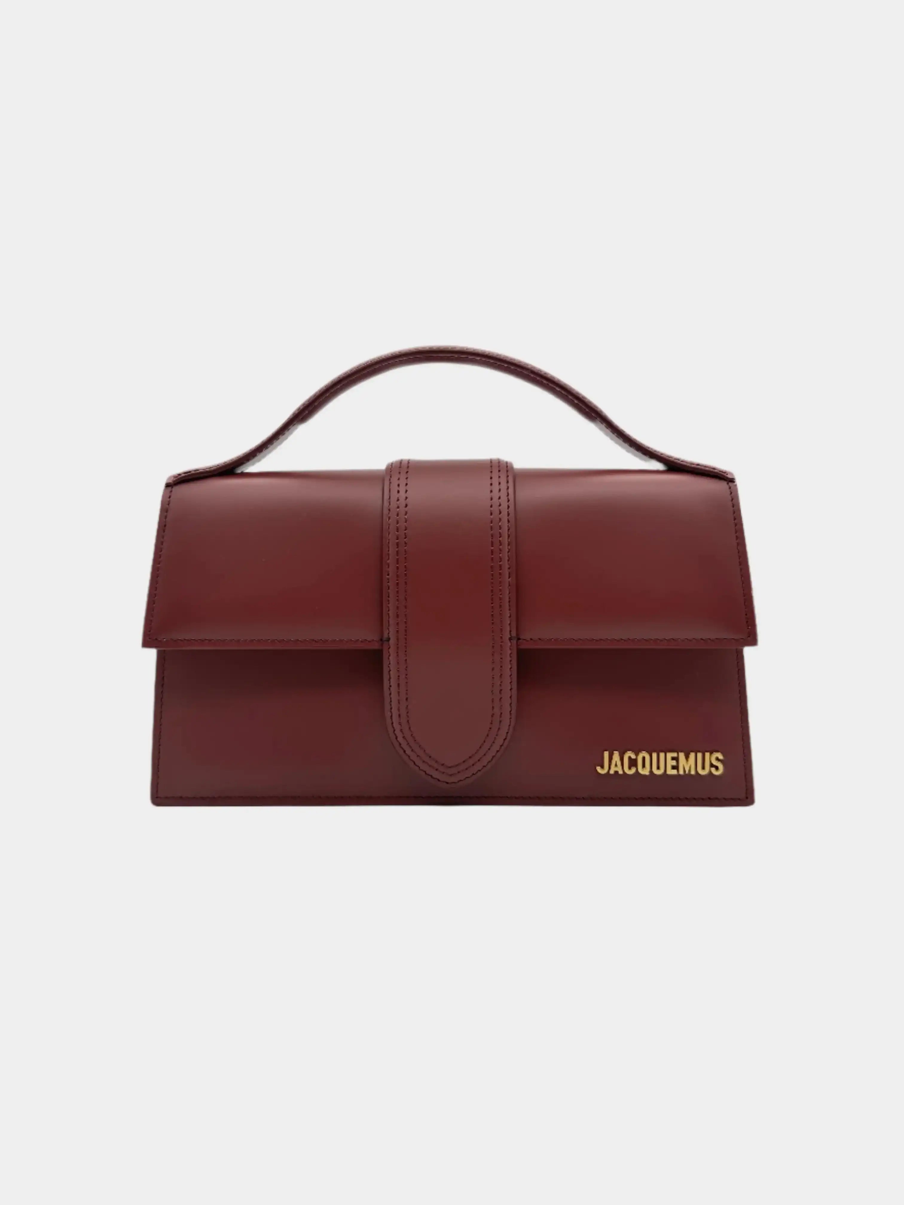 La borsa Jacquemus Le Grand Bambino burgundy in pelle opaca è un modello elegante e sofisticato, ideale per chi cerca un accessorio dal carattere deciso. Caratterizzata da un design rettangolare con patta frontale e manico superiore rigido, è dotata di tracolla regolabile e rimovibile con moschettoni in metallo dorato. La chiusura magnetica con linguetta garantisce praticità, mentre il logo Jacquemus in metallo dorato aggiunge un dettaglio iconico.