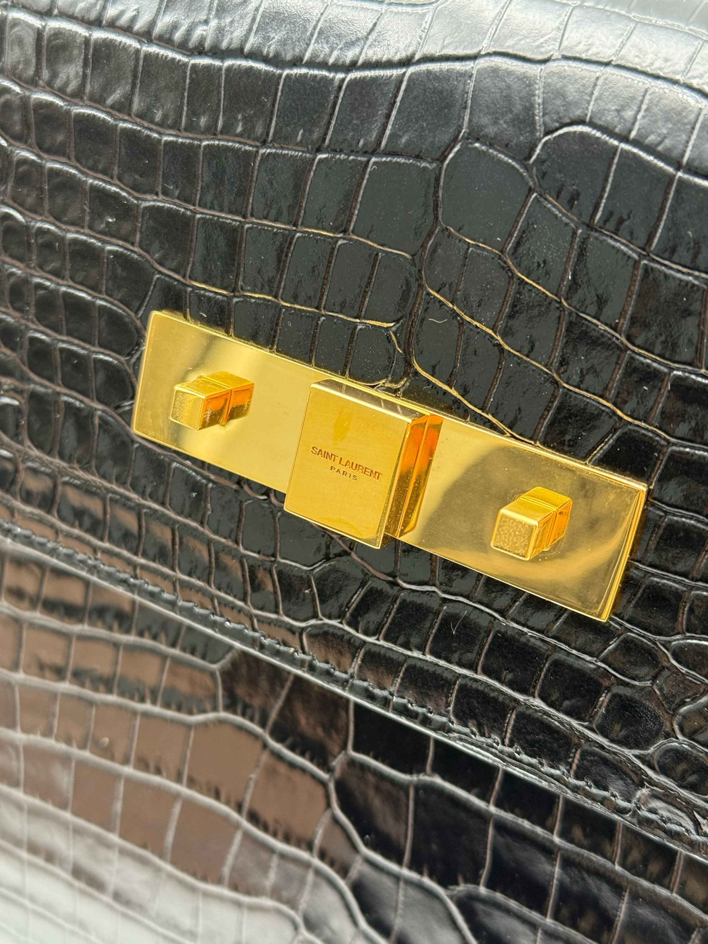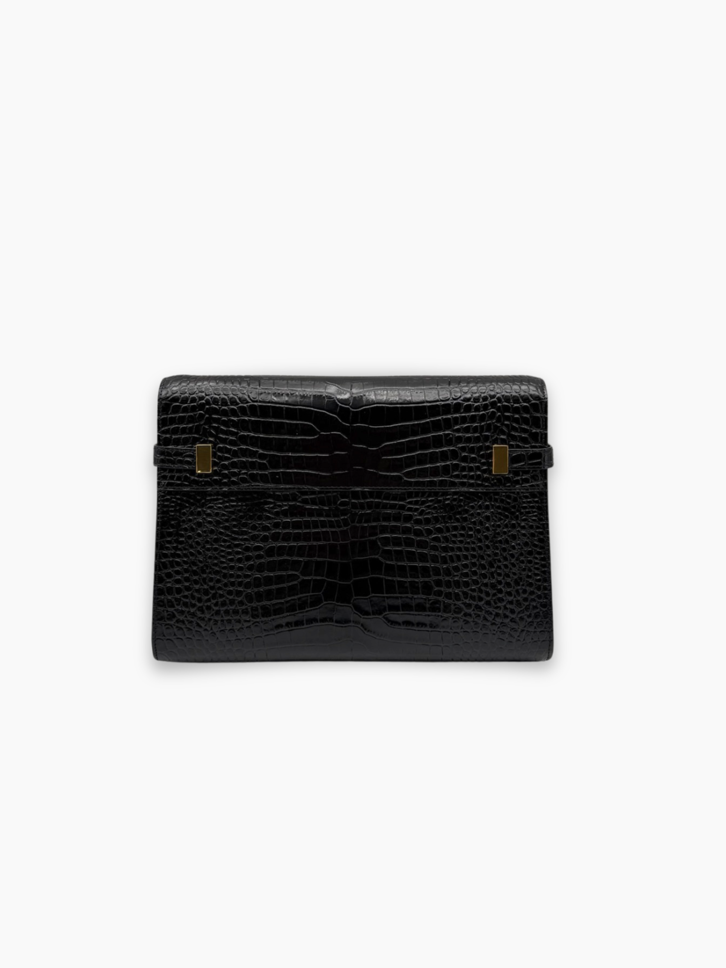 Borsa Saint Laurent modello Manhattan realizzata in pelle nera con effetto coccodrillo lucido e finiture metalliche dorate. Il design strutturato, la silhouette elegante e la chiusura frontale con clip dorata la rendono un’icona di stile raffinato e moderno. Perfetta per completare look da sera o da ufficio con un tocco di classe parigina.