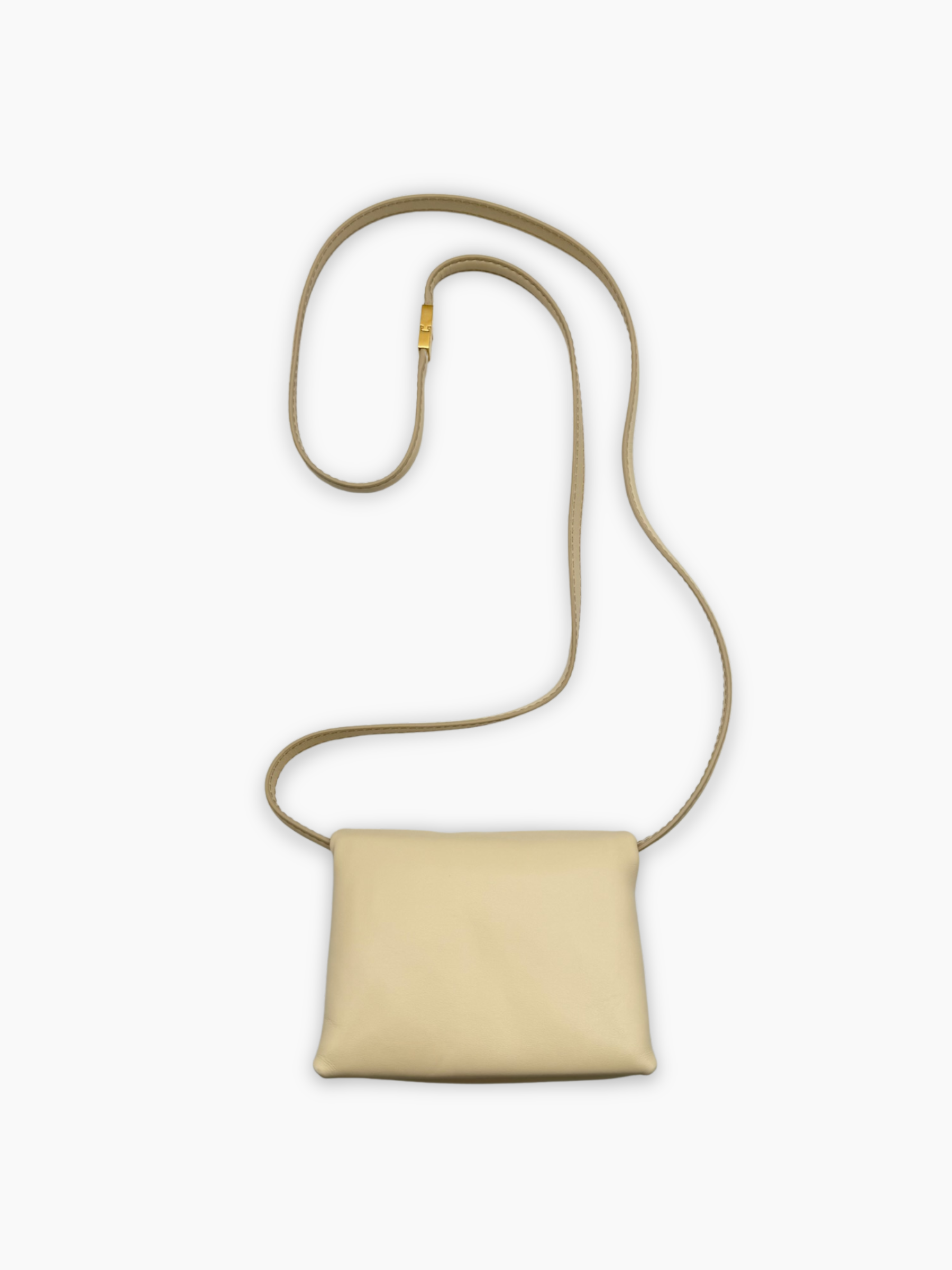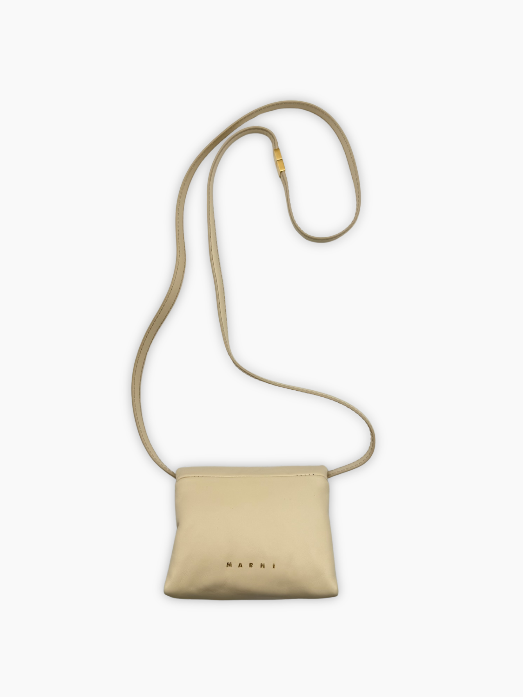 La Prisma Mini di Marni è una borsa compatta e raffinata, pensata per aggiungere un tocco di eleganza minimal al look quotidiano. Realizzata in pelle liscia color panna, presenta linee essenziali e una tracolla regolabile con fibbia dorata. La dimensione ridotta la rende perfetta per portare con sé lo stretto necessario, mantenendo un’allure sofisticata.