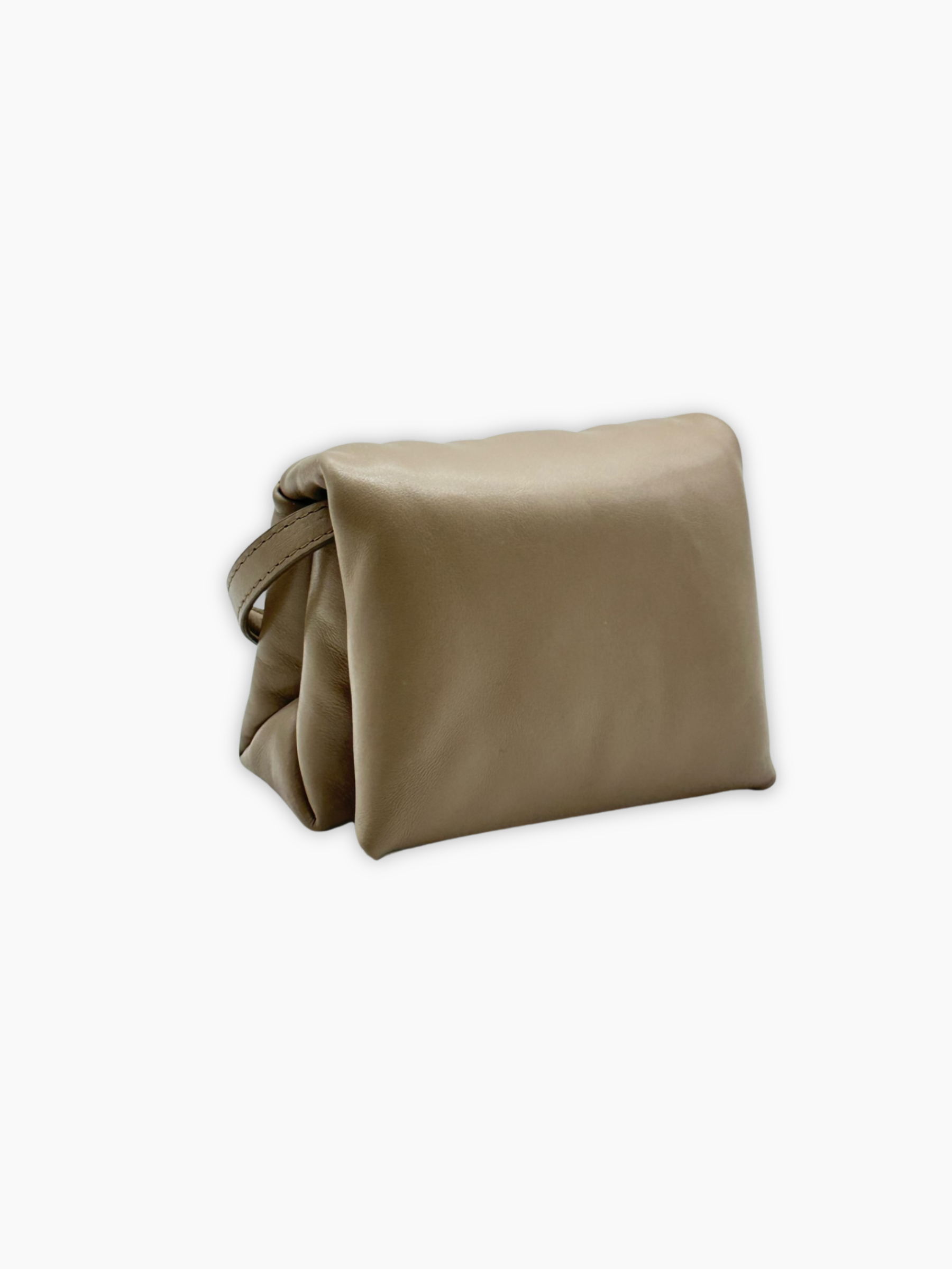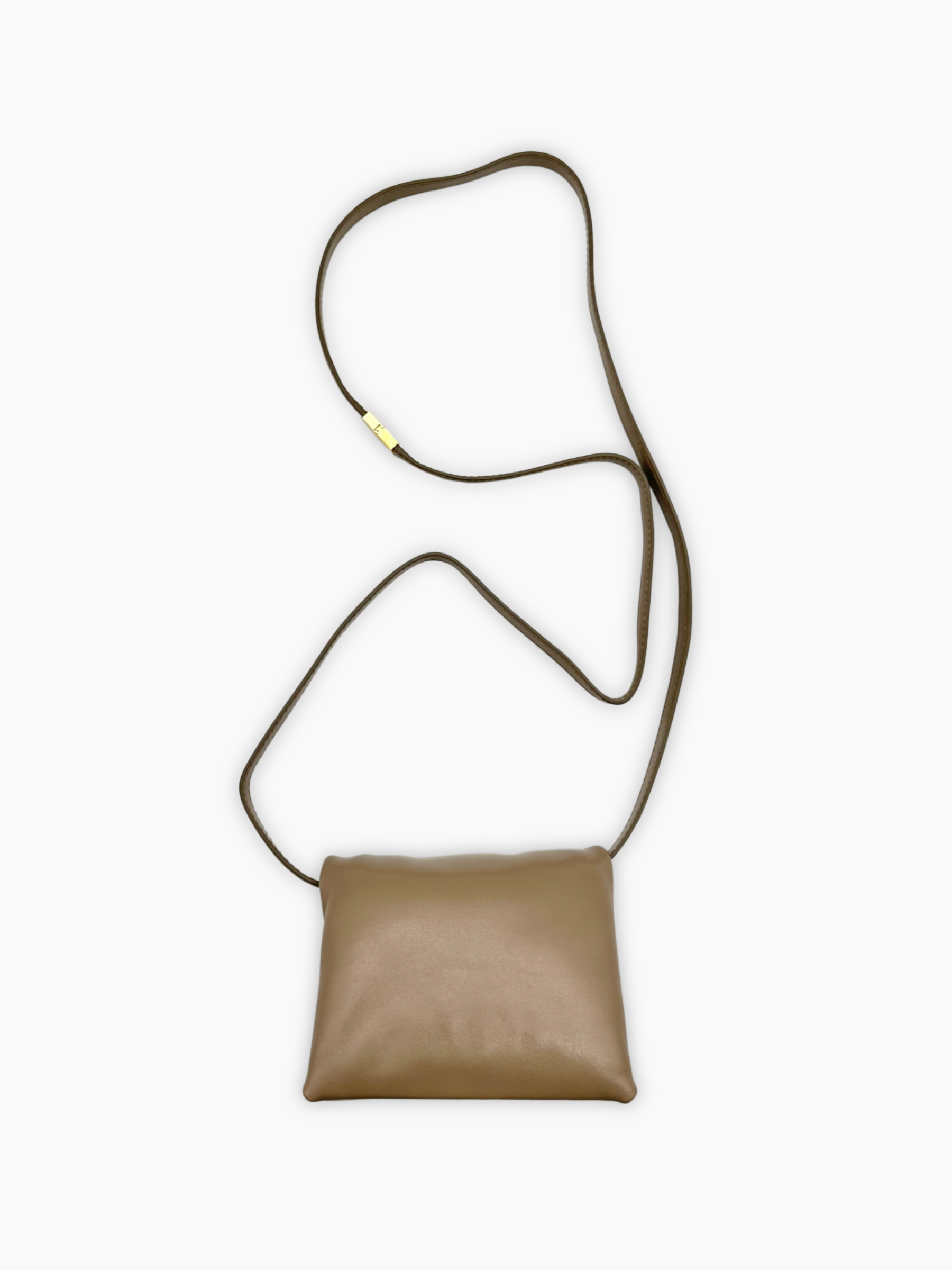La Prisma Mini di Marni è una borsa compatta e raffinata, pensata per aggiungere un tocco di eleganza minimal al look quotidiano. Realizzata in pelle liscia colore tortora, presenta linee essenziali e una tracolla regolabile con fibbia dorata. La dimensione ridotta la rende perfetta per portare con sé lo stretto necessario, mantenendo un mood sofisticato.