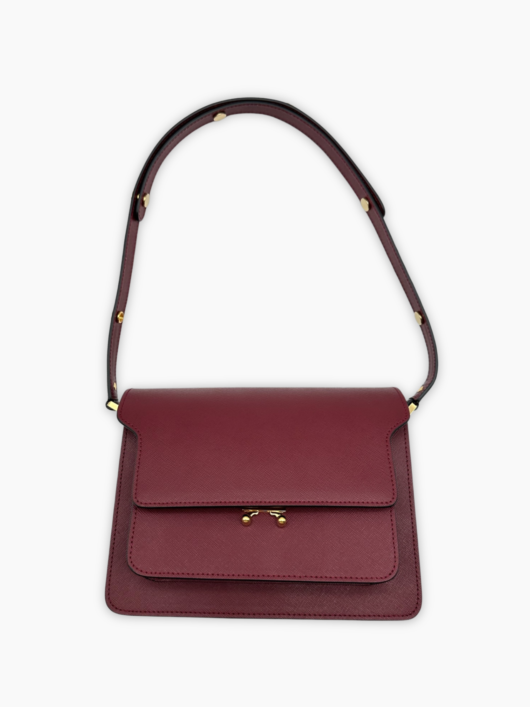 Borsa Marni modello Trunk realizzata in pelle saffiano bordeaux con finiture eleganti e dettagli in metallo dorato. Dotata di tracolla regolabile e multipli scomparti interni, combina praticità e design iconico. Un accessorio versatile e sofisticato, ideale per look da giorno e da sera.