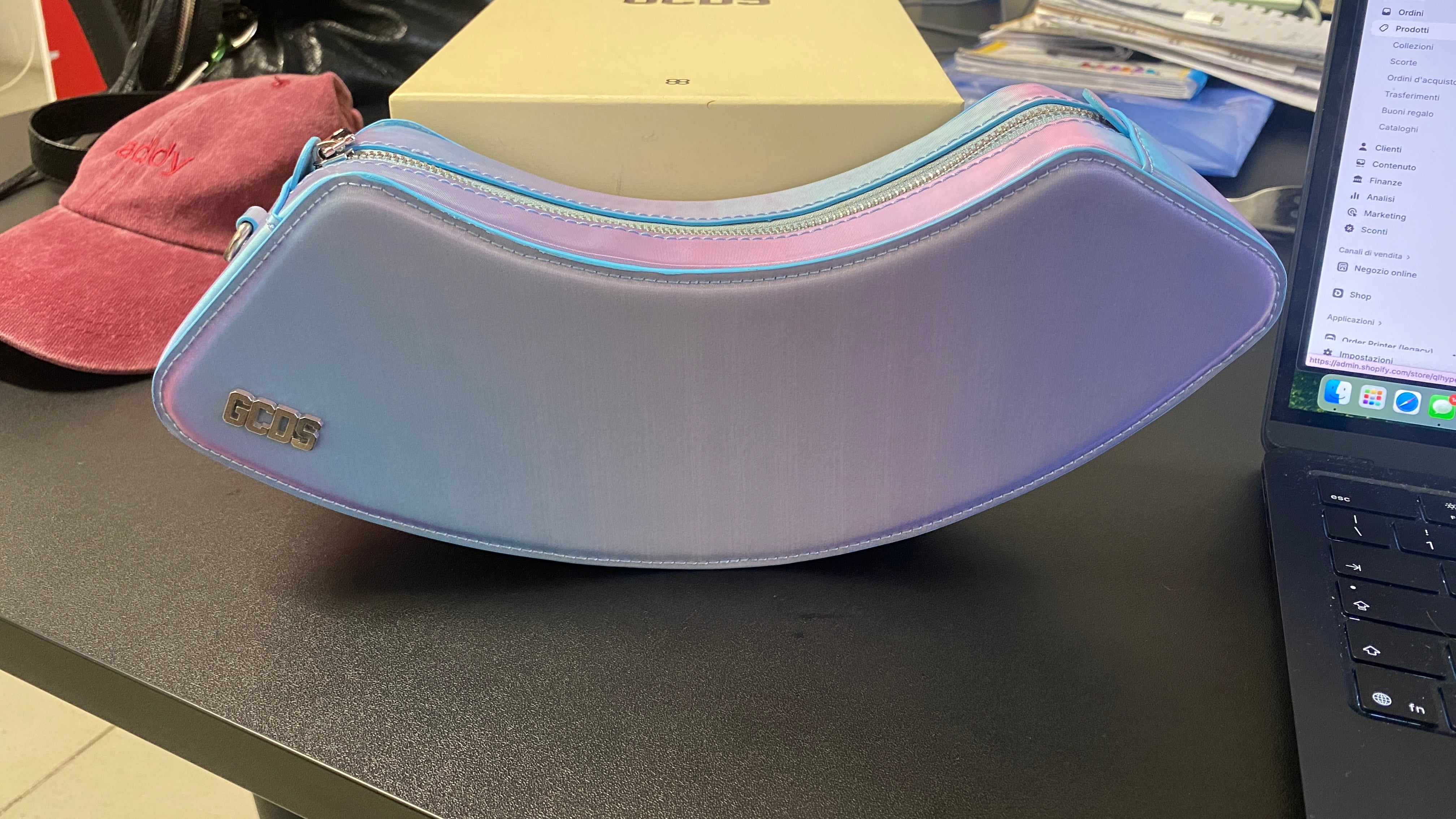 Borsa a spalla dal design iconico della linea Comma, realizzata in materiale effetto olografico con sfumature iridescenti che cambiano colore alla luce. La silhouette curva e futuristica la rende un accessorio distintivo, perfetto per aggiungere un tocco brillante ai tuoi look.