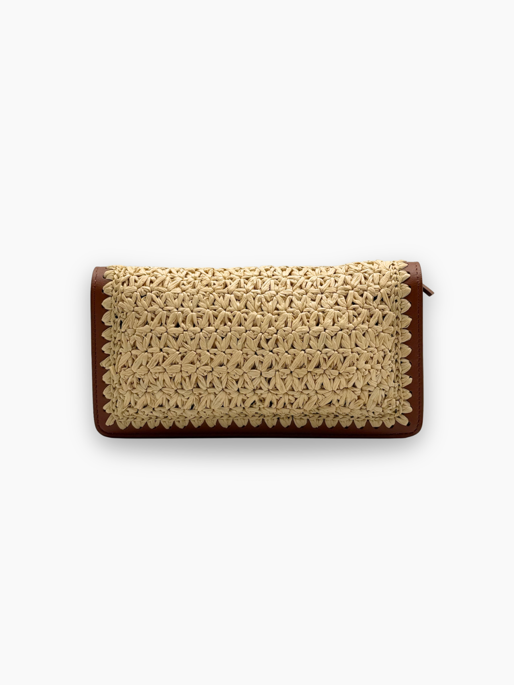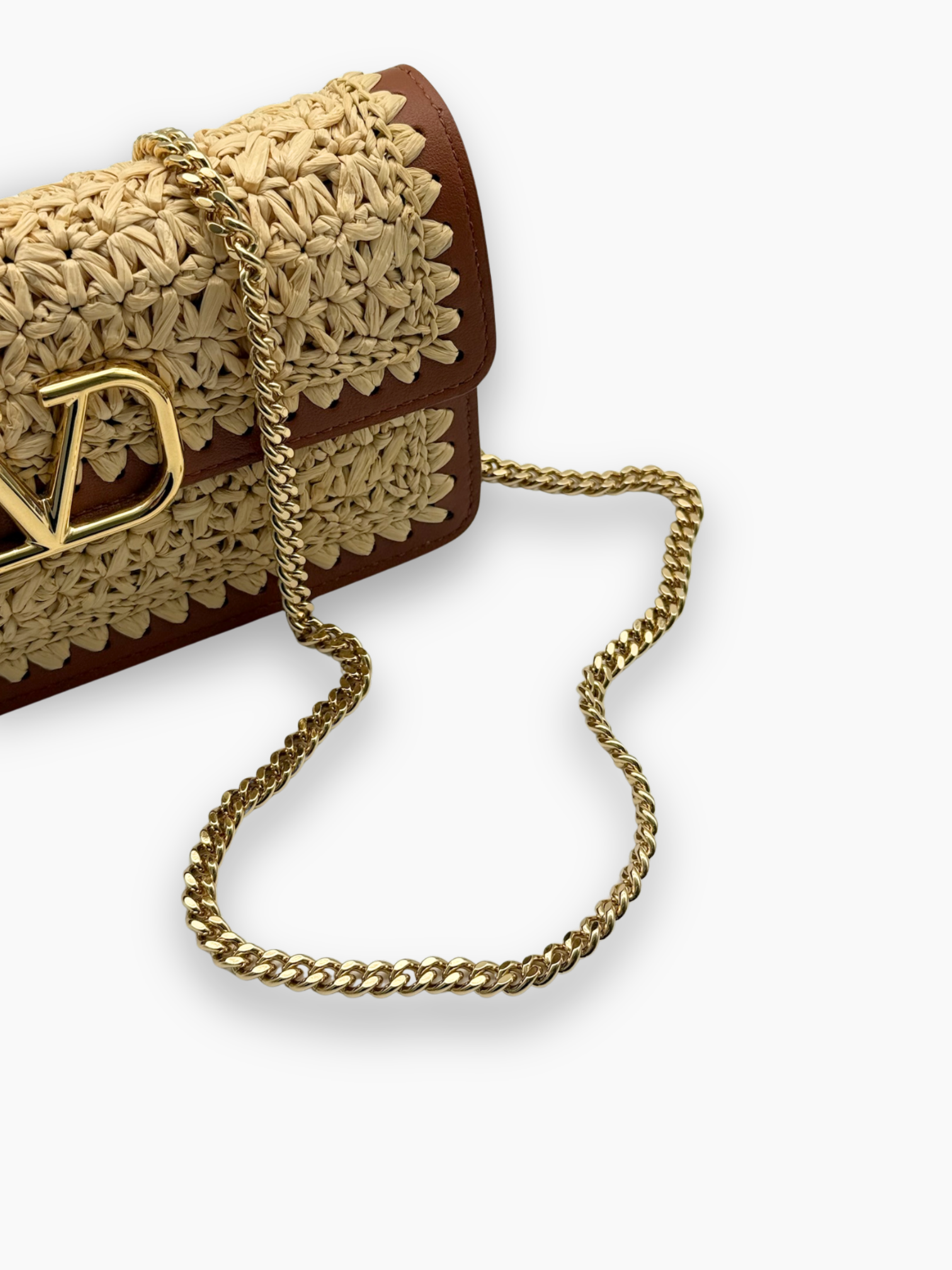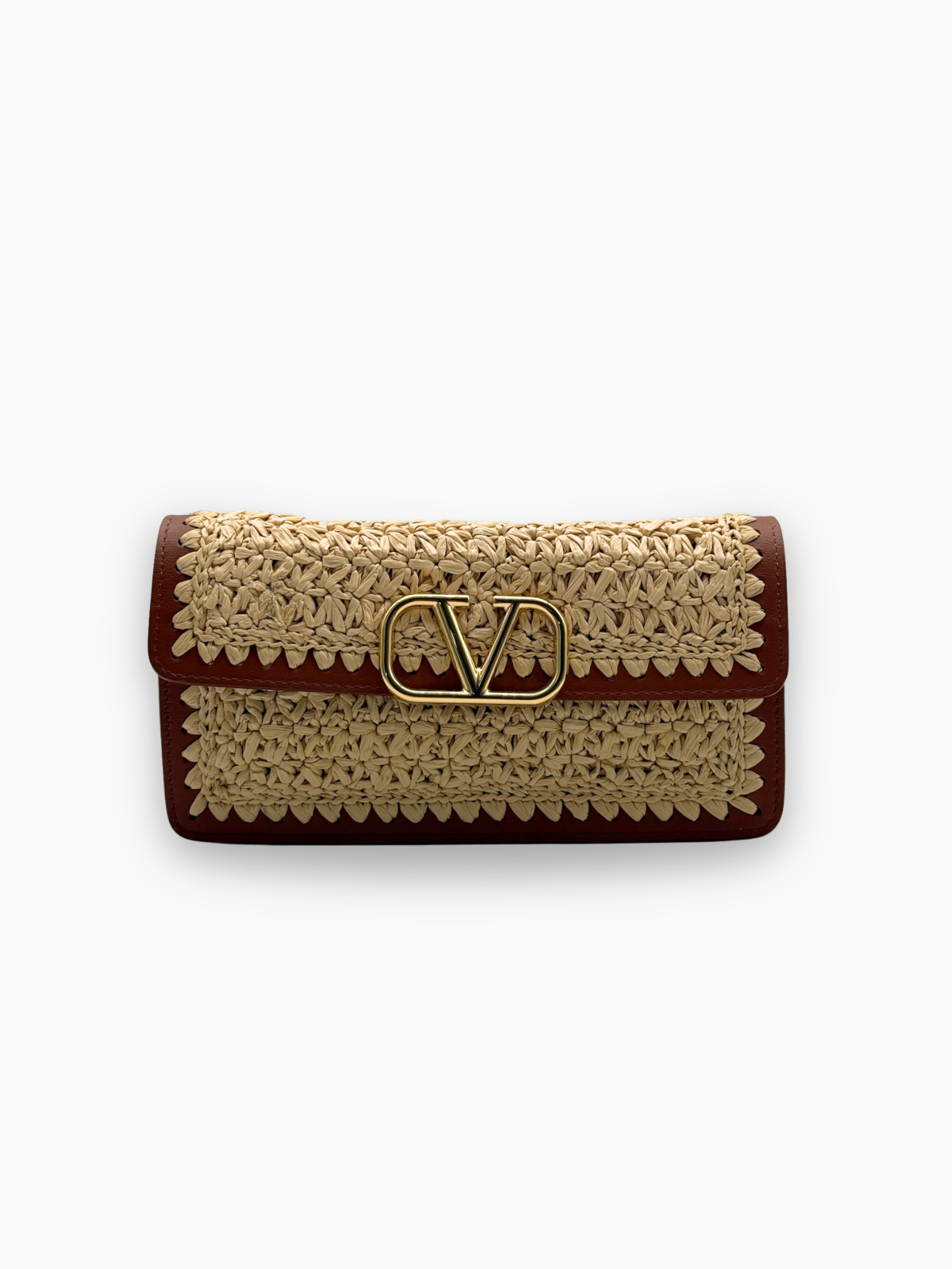 Pochette firmata Valentino realizzata in raffinata raffia beige intrecciata, dal design elegante e naturale. Il modello si distingue per le sue linee pulite e i dettagli curati, perfetti per completare look estivi con un tocco sofisticato. Leggera e versatile, può essere portata a mano o con la tracolla sottile rimovibile, ideale per passare con stile dal giorno alla sera.