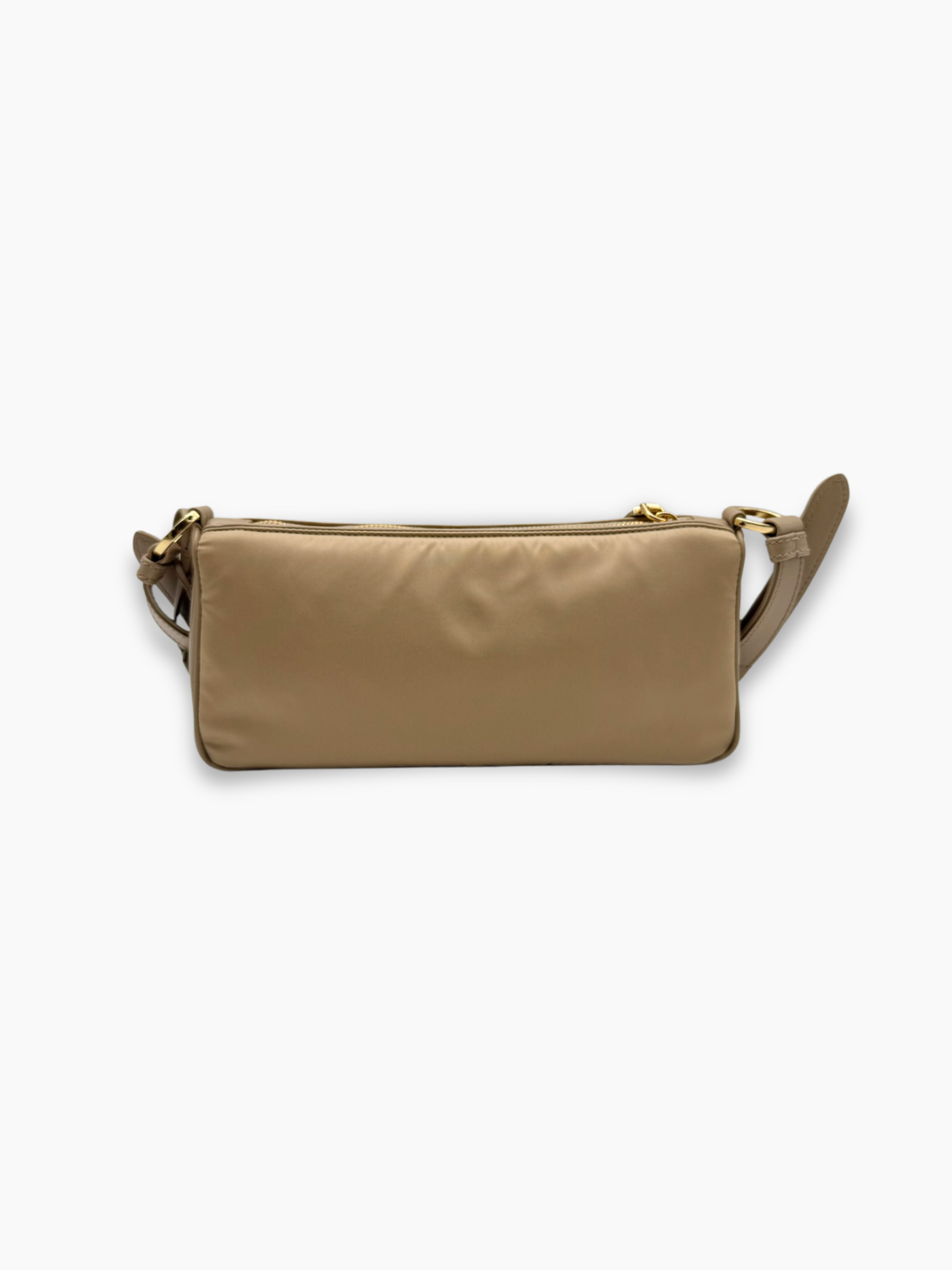 Pouch beige realizzata in Re-Nylon, materiale rigenerato iconico della maison Prada. Il design compatto e moderno è arricchito dal logo triangolare in metallo dorato e dall’elegante lucchetto laterale. Dotata di chiusura superiore con zip e tracolla regolabile, è un accessorio raffinato e versatile, perfetto per completare look urbani e contemporanei.