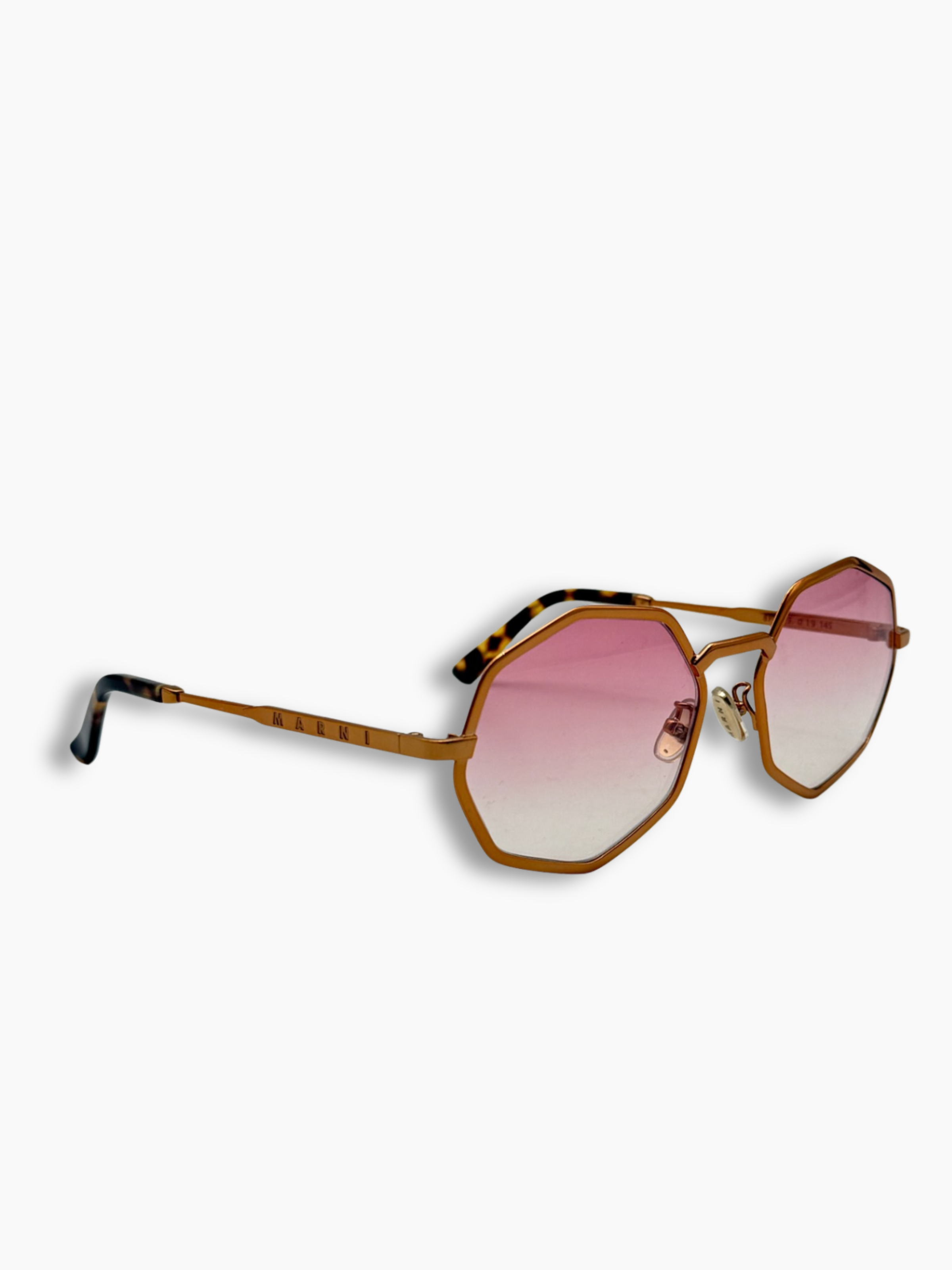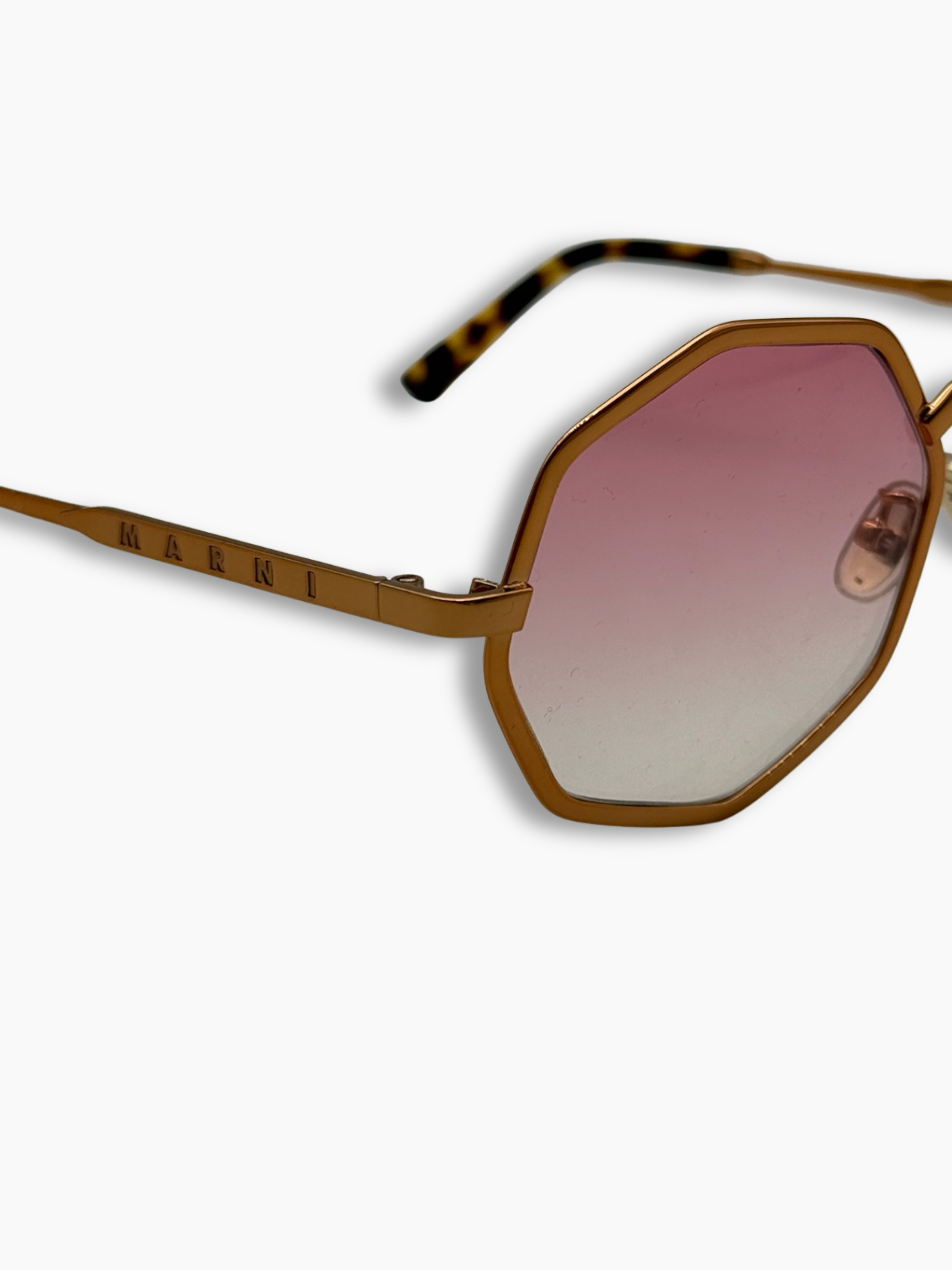 Occhiali da sole Marni dallo stile sofisticato e contemporaneo, caratterizzati da una montatura geometrica in metallo dorato e lenti marroni chiare. Un accessorio artigianale made in Italy che unisce eleganza, originalità e un tocco rétro.