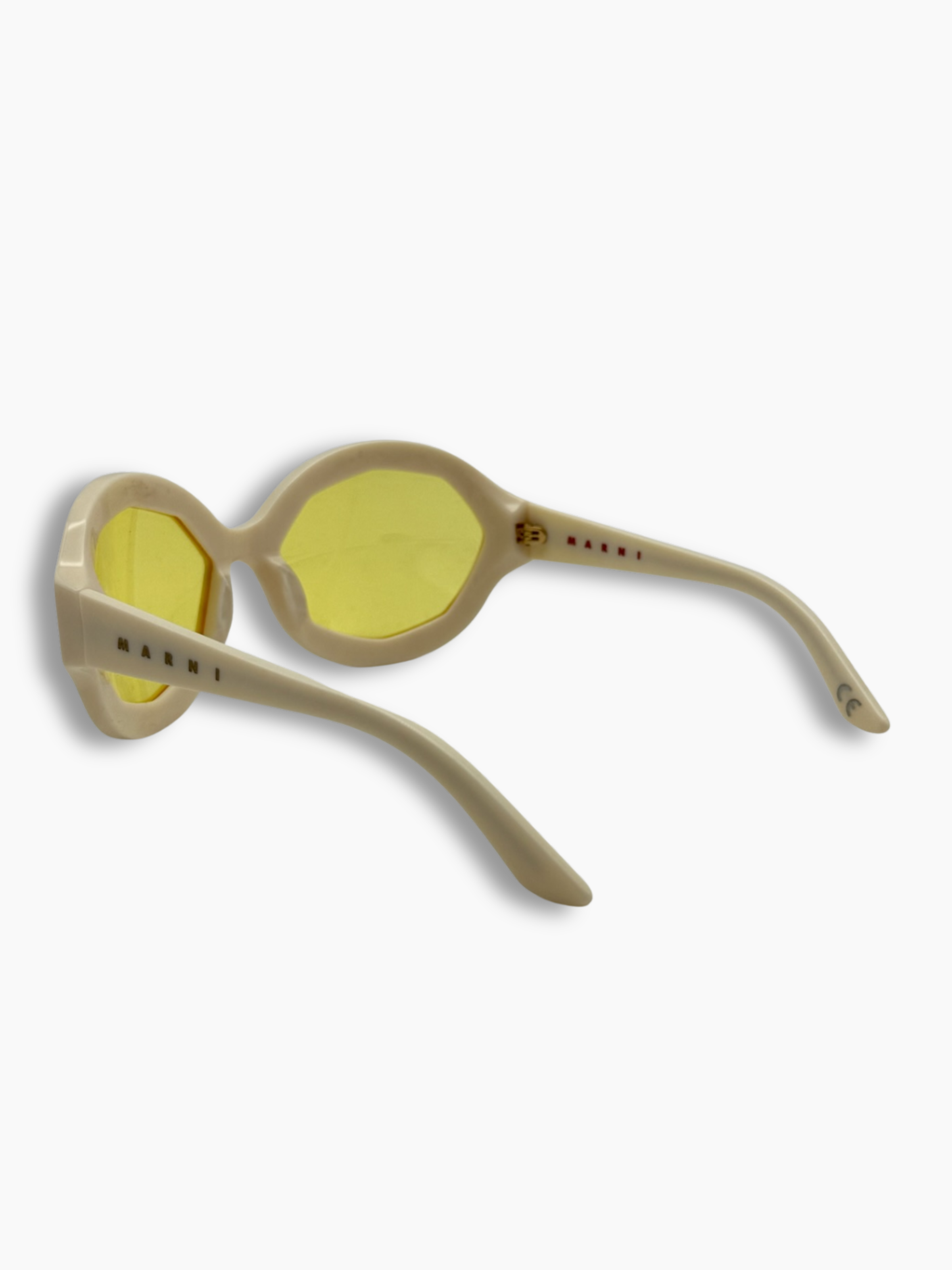 Occhiali da sole Marni dallo stile eclettico e glamour, con montatura in acetato panna e interno giallo, impreziosita da cristalli blu lungo il profilo. Le lenti gialle creano un effetto luminoso e sofisticato, rendendo questo modello perfetto per chi ama distinguersi con accessori dal carattere deciso.