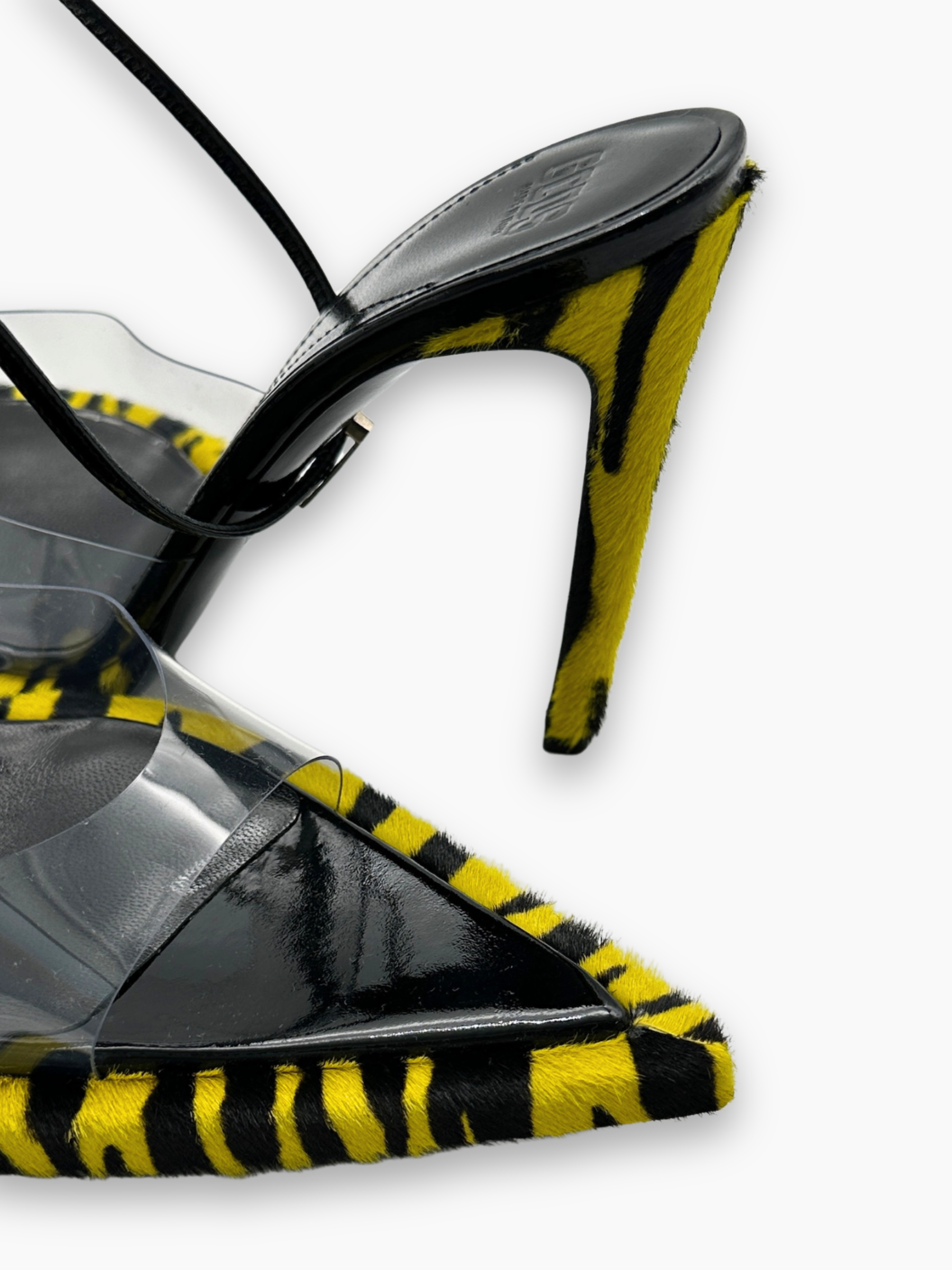 Sandali con tacco alto dal design deciso e sensuale, caratterizzati da una fascia frontale trasparente e dettagli in pelo giallo e nero effetto animalier lungo il profilo della suola e del tacco. Il cinturino sottile alla caviglia dona stabilità senza rinunciare alla leggerezza estetica, mentre la silhouette slanciata valorizza ogni look da sera.
