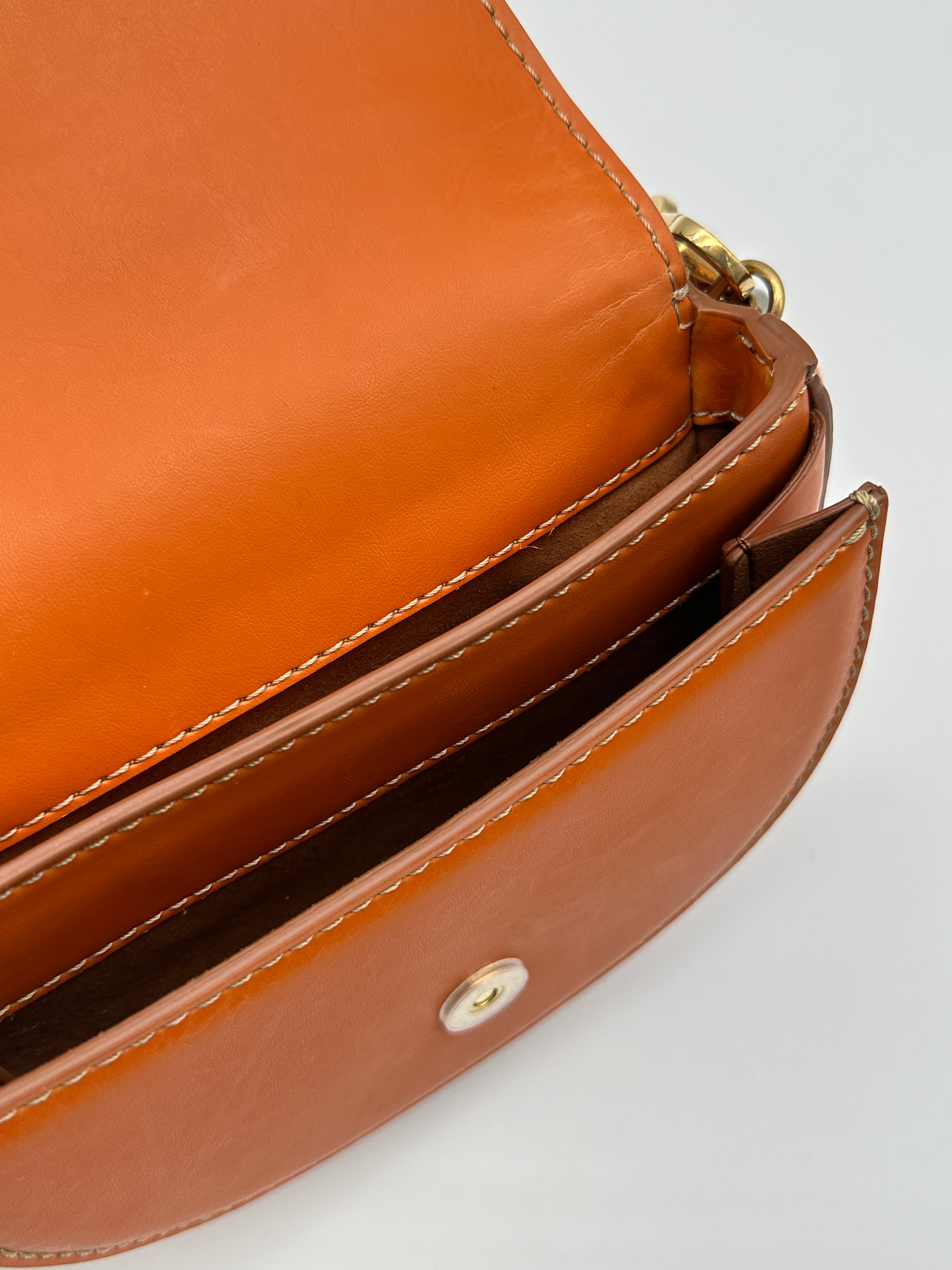 Borsa a spalla in Alter Mat marrone firmata Stella McCartney, con patta frontale e catena in metallo che funge da tracolla. Elegante e sostenibile, è perfetta per accompagnare look raffinati o quotidiani con un tocco consapevole.