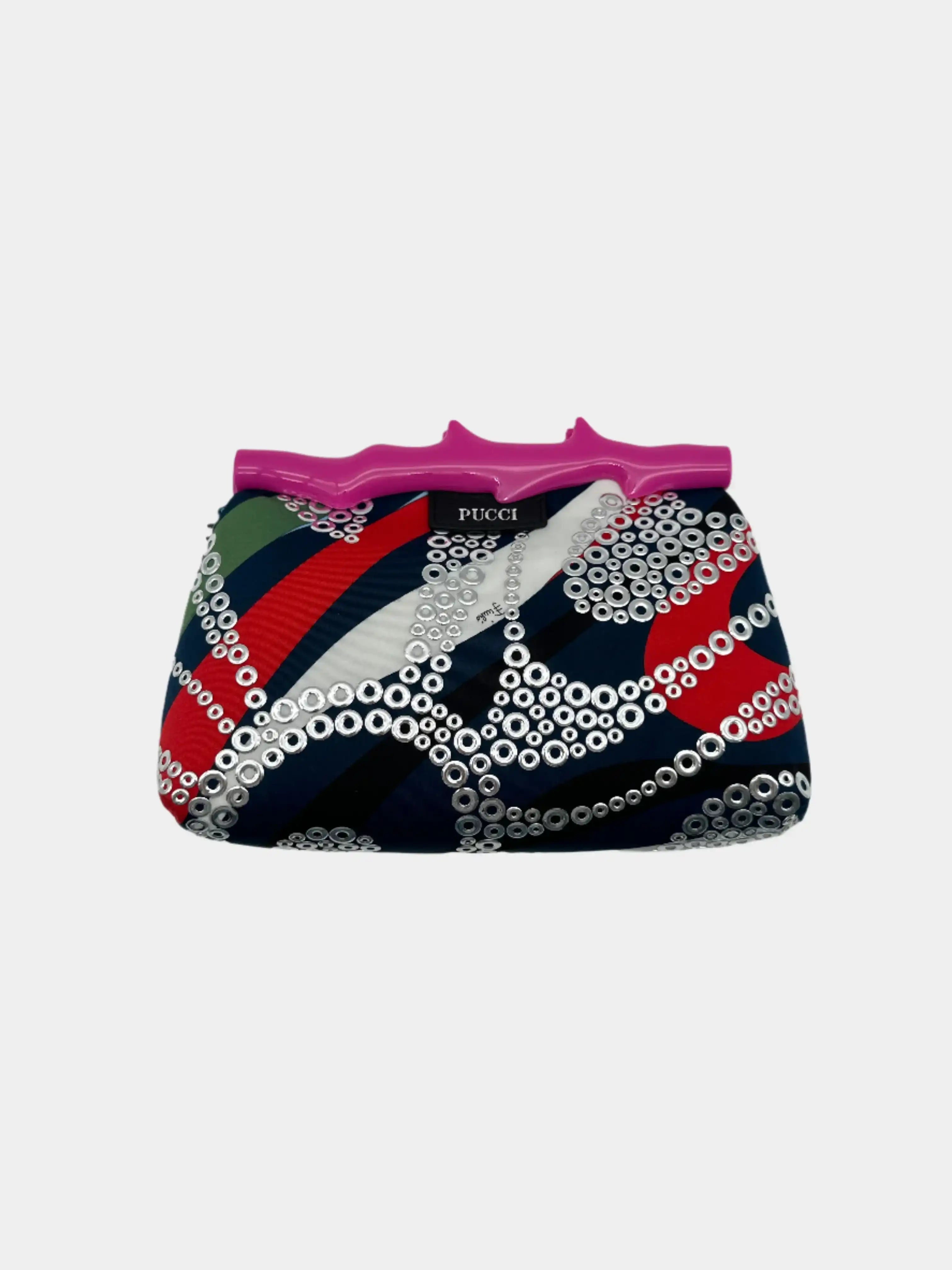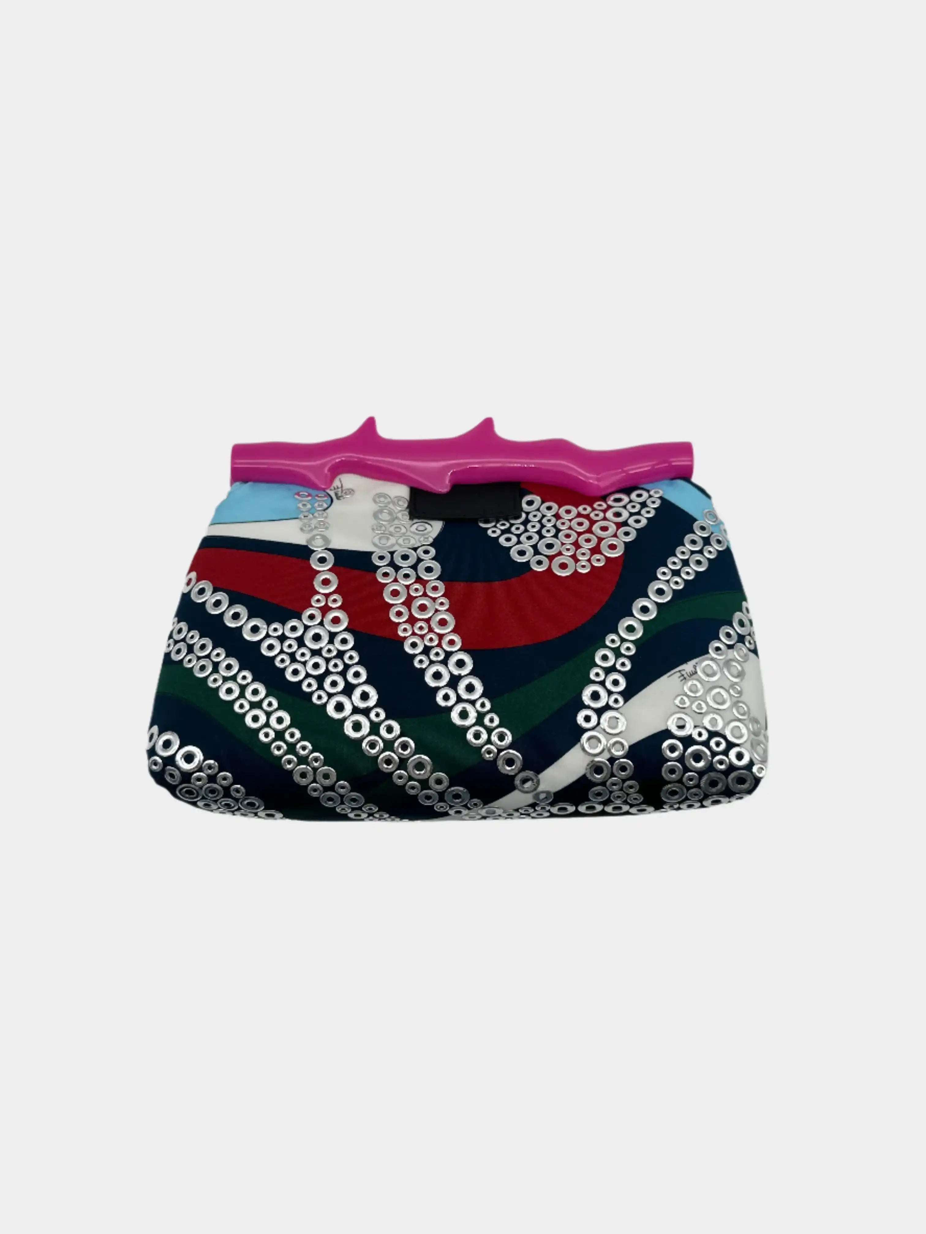 Mini clutch Emilio Pucci dallo stile audace e distintivo, caratterizzata da una stampa astratta multicolor con applicazioni metalliche circolari su tutta la superficie. Il manico rigido rosa fucsia a forma di ramo dona alla borsa un tocco scultoreo e moderno, esaltando il DNA creativo del brand. Ideale per look da sera o eventi speciali.