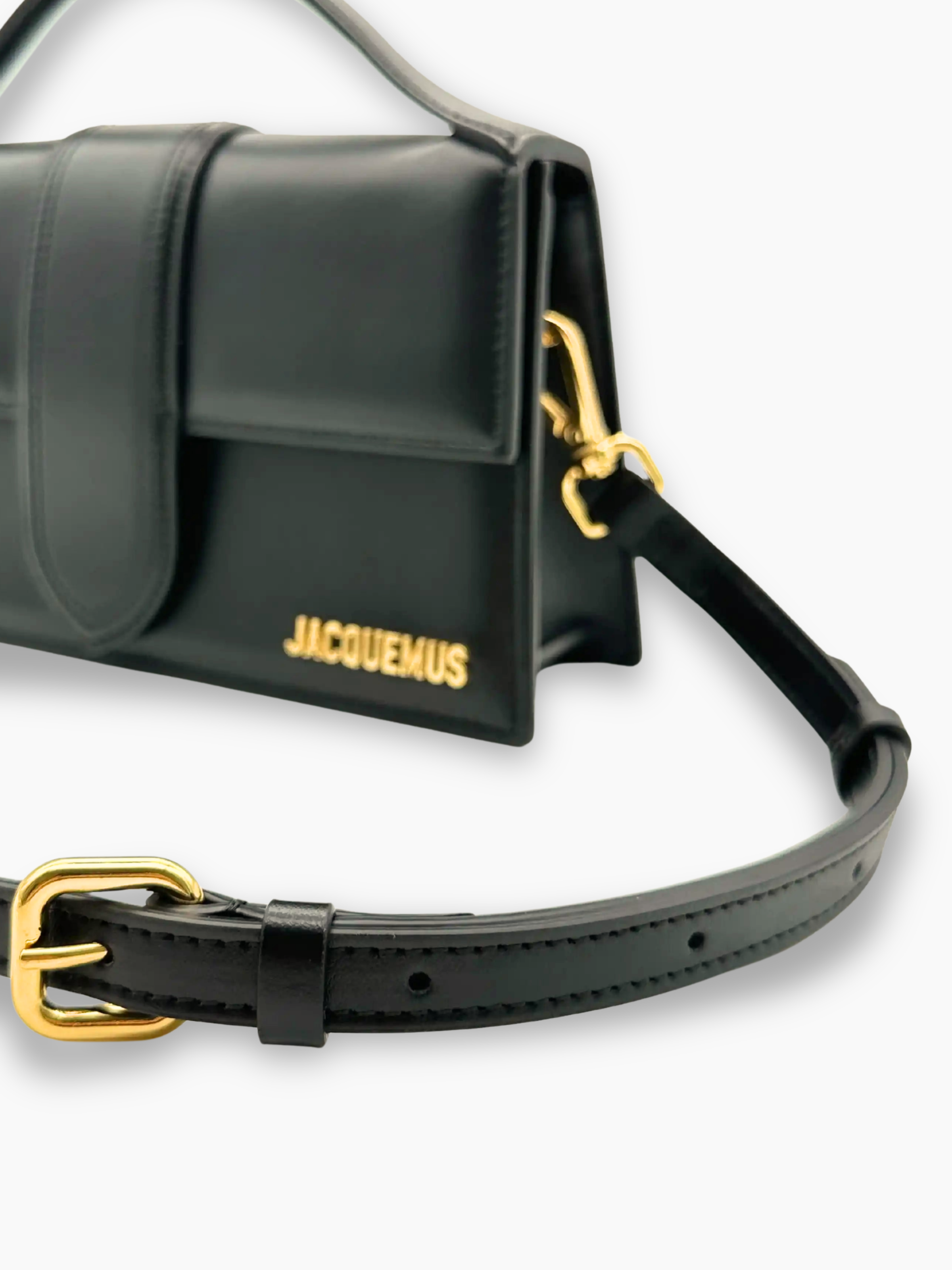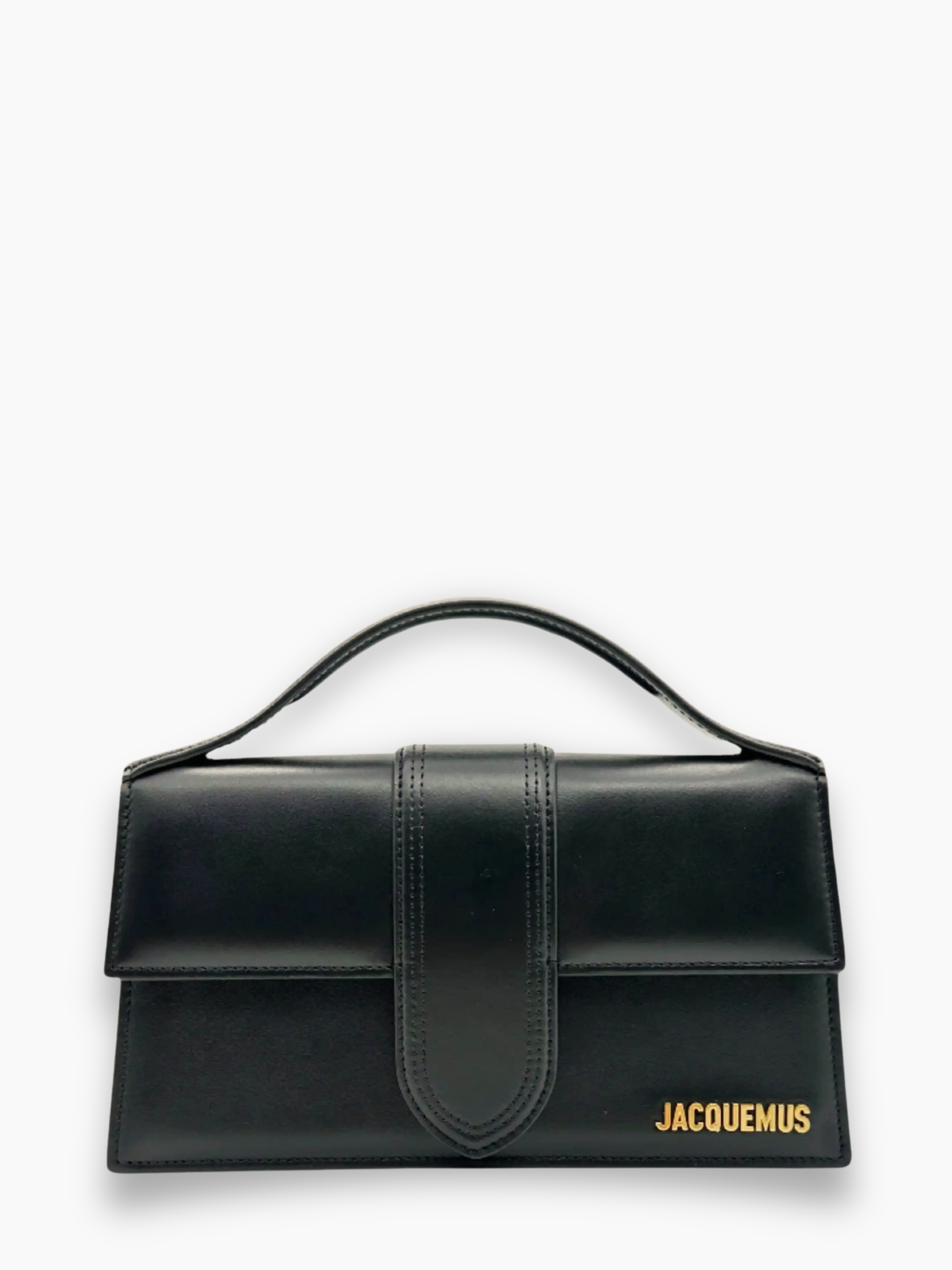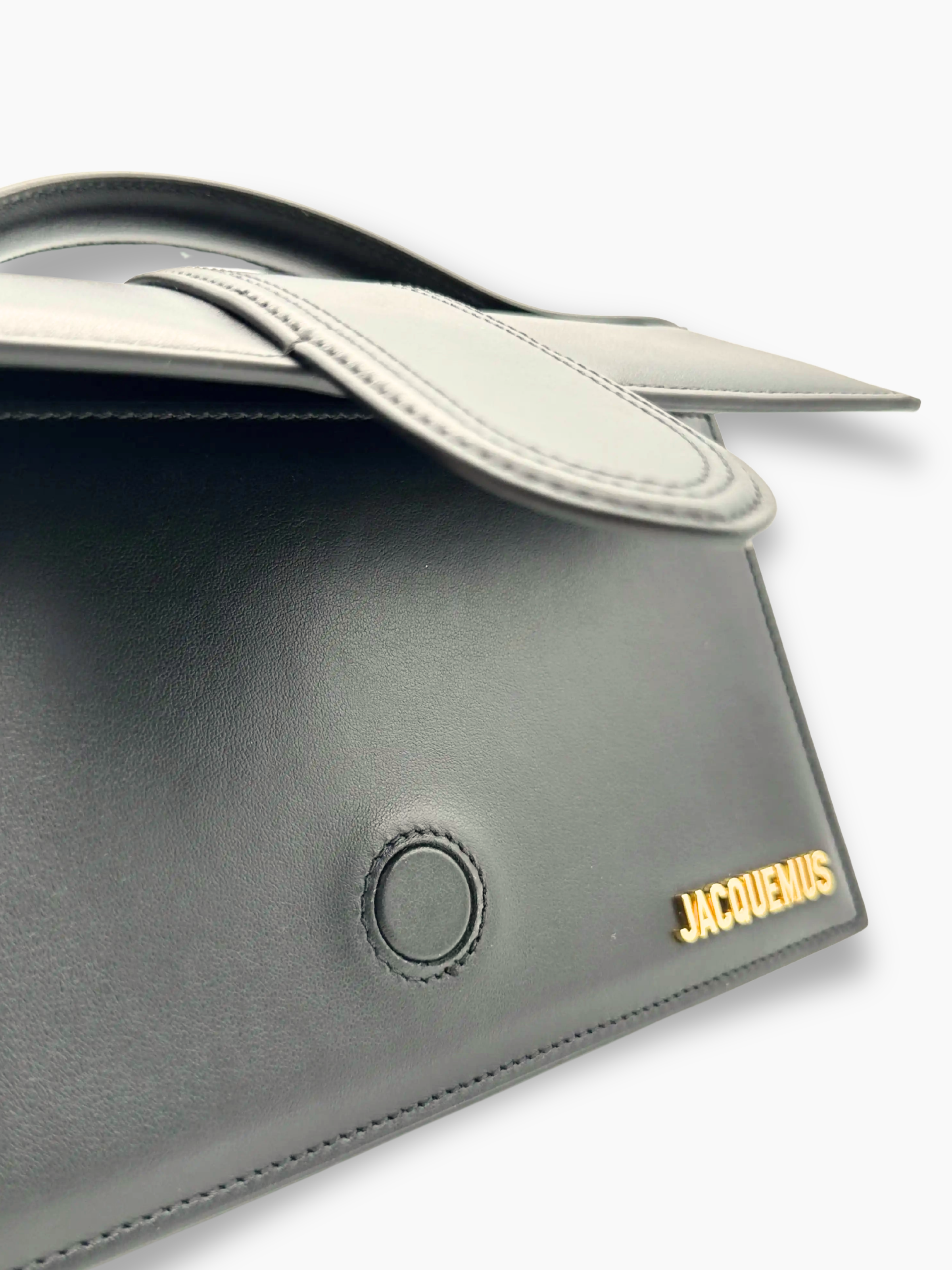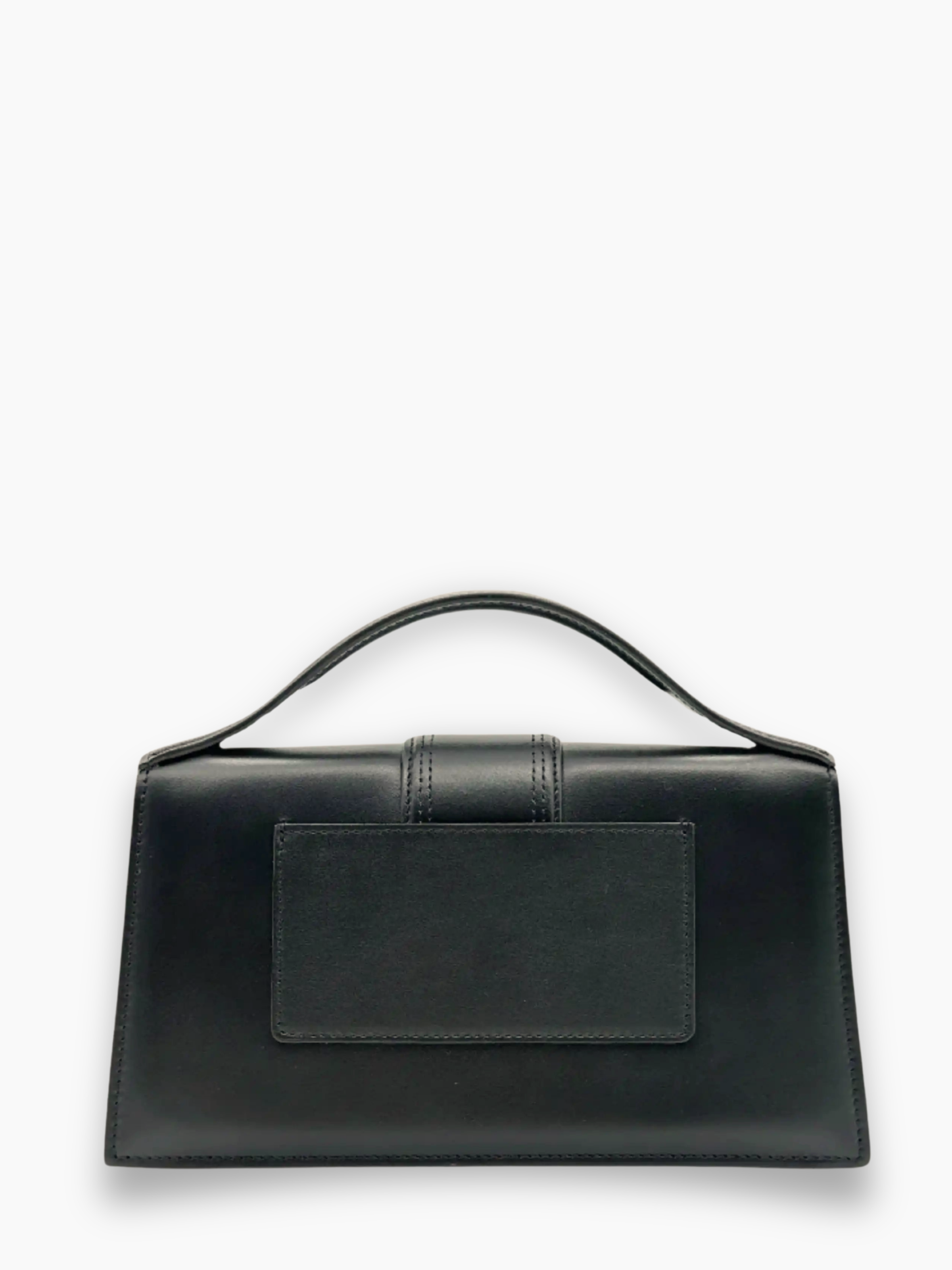 La borsa Jacquemus Le Grand Bambino nera è un accessorio iconico ed elegante, realizzato in pelle liscia. Caratterizzata da un design rettangolare strutturato con patta frontale, presenta un manico superiore rigido e una tracolla regolabile e staccabile che la rende versatile da indossare. La chiusura magnetica con linguetta assicura praticità, mentre il logo Jacquemus in metallo dorato applicato sul davanti dona un dettaglio prezioso e distintivo. L’interno è organizzato con un comparto principale e una tasca interna a filetto. Fornita con sacca antipolvere ed etichetta originale.