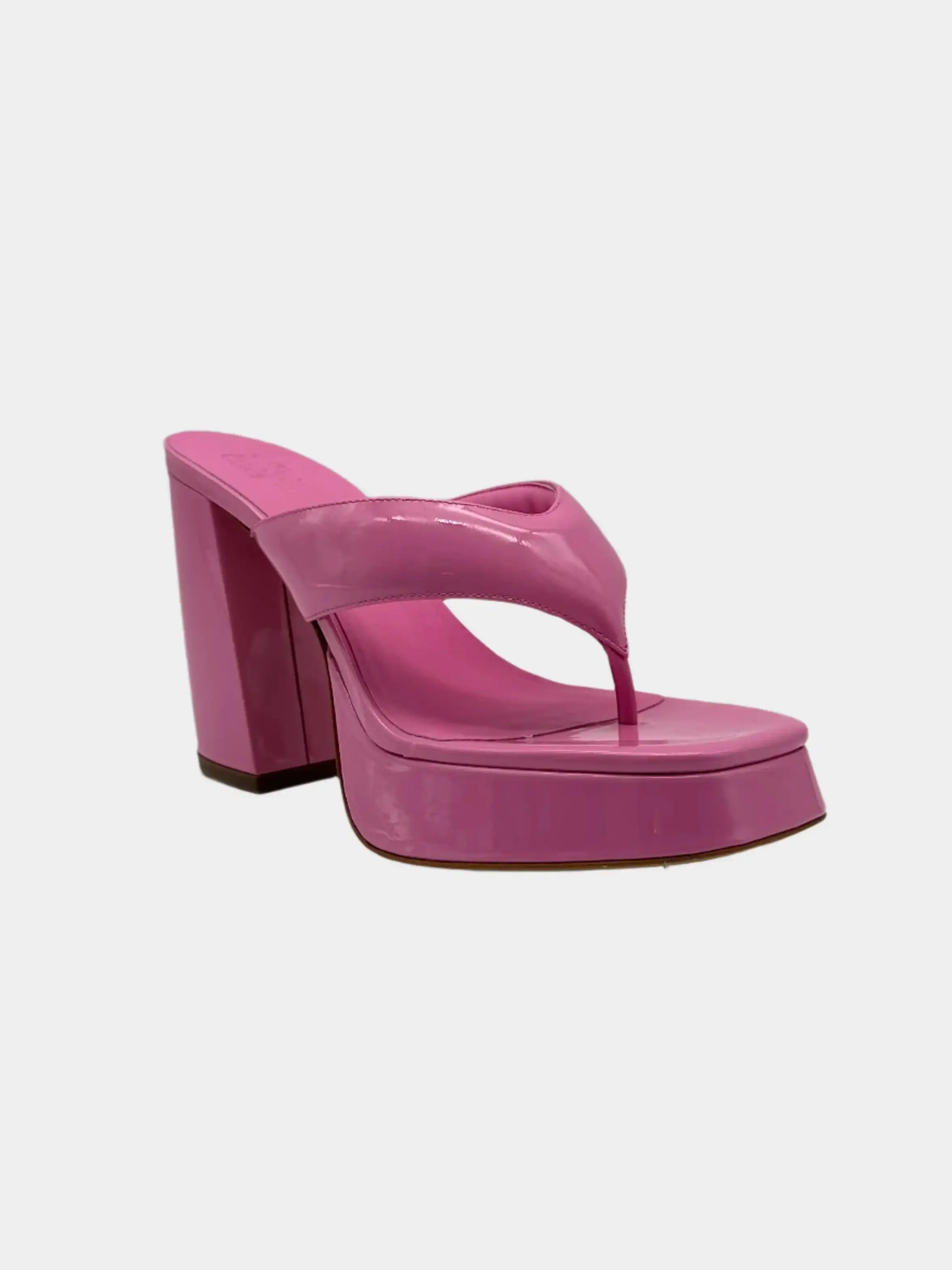 Questi sandali con plateau firmati Gia Borghini uniscono glamour e audacia in un design unico. Realizzati in vernice rosa lucida, sono caratterizzati da una silhouette con infradito imbottito, punta squadrata e tacco largo inclinato che conferisce stabilità e stile. Il plateau dona altezza extra mantenendo il comfort, rendendoli perfetti per serate estive o occasioni speciali. Il prodotto arriva con scatola originale