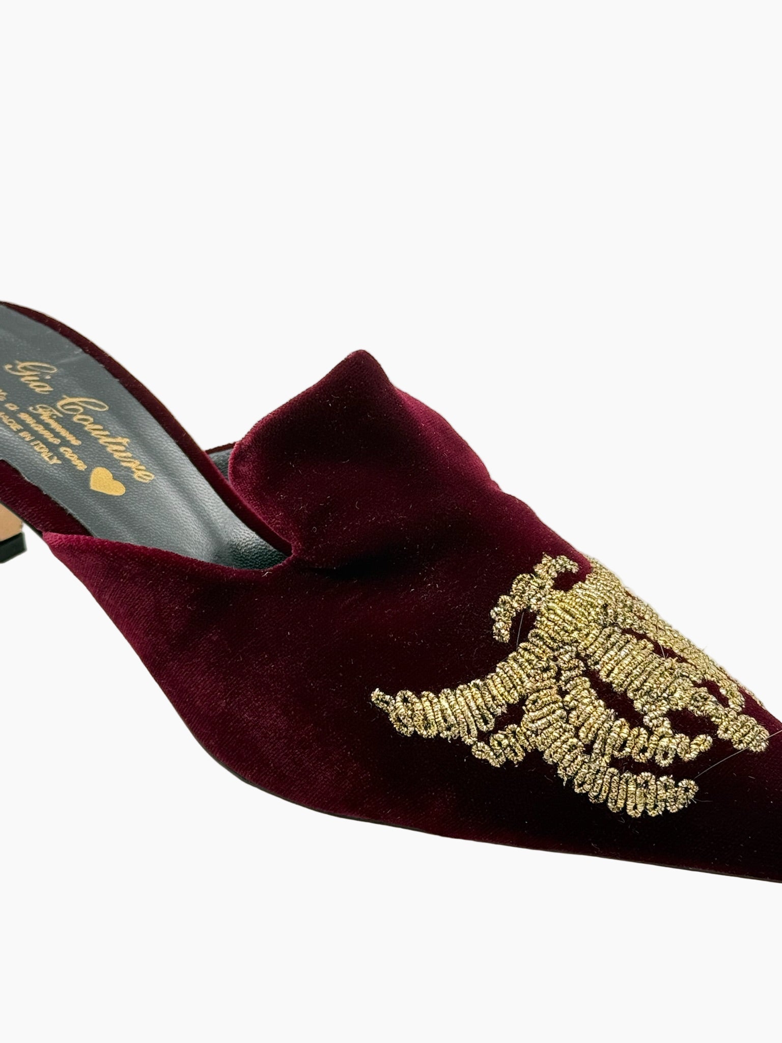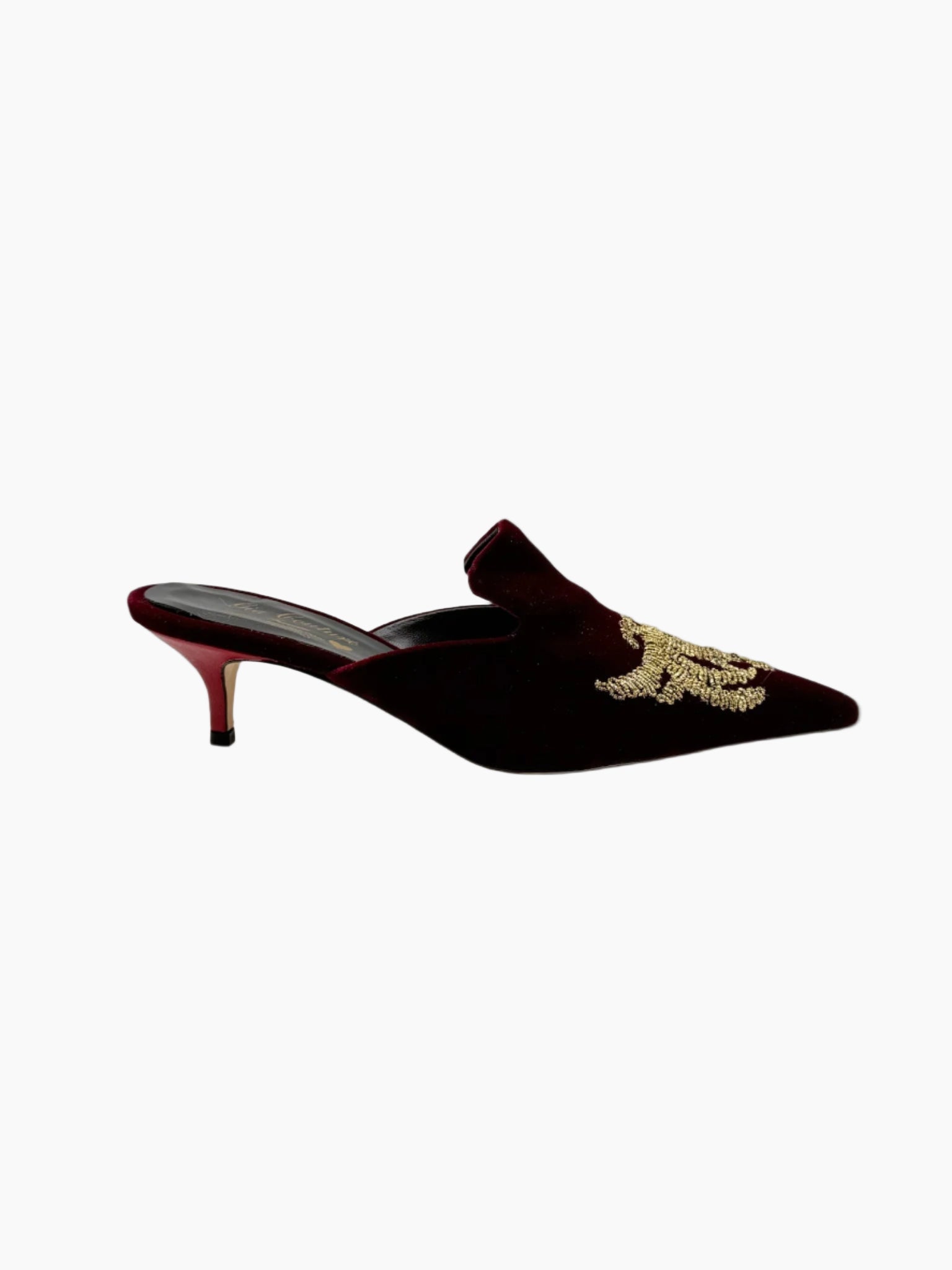 Queste mules firmate Gia Couture incarnano uno stile sofisticato e rétro, con un tocco artigianale. Realizzate in velluto bordeaux intenso, sono arricchite da un ricamo dorato che impreziosisce la tomaia a punta. Il tacco basso e sottile completa il look con un’eleganza disinvolta, perfetta per chi ama distinguersi con dettagli ricercati.