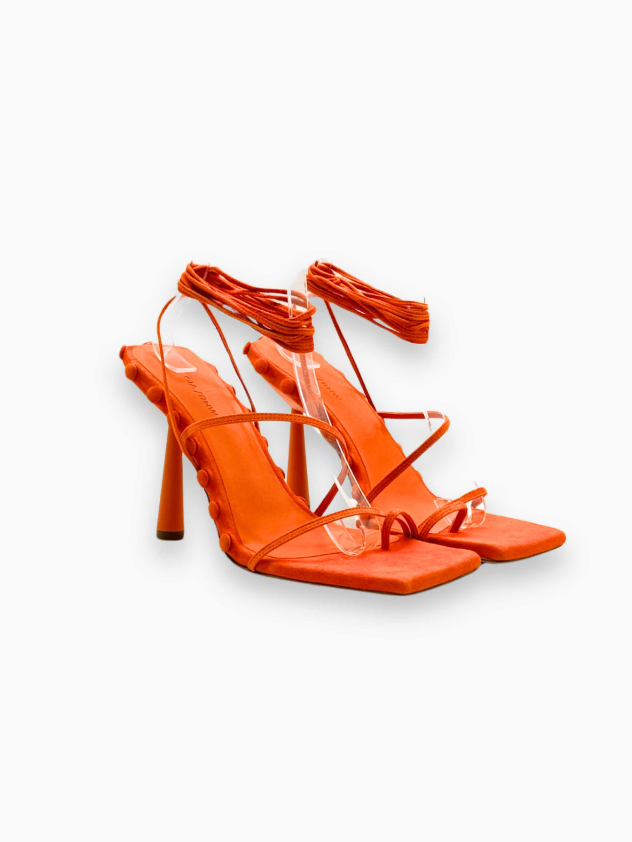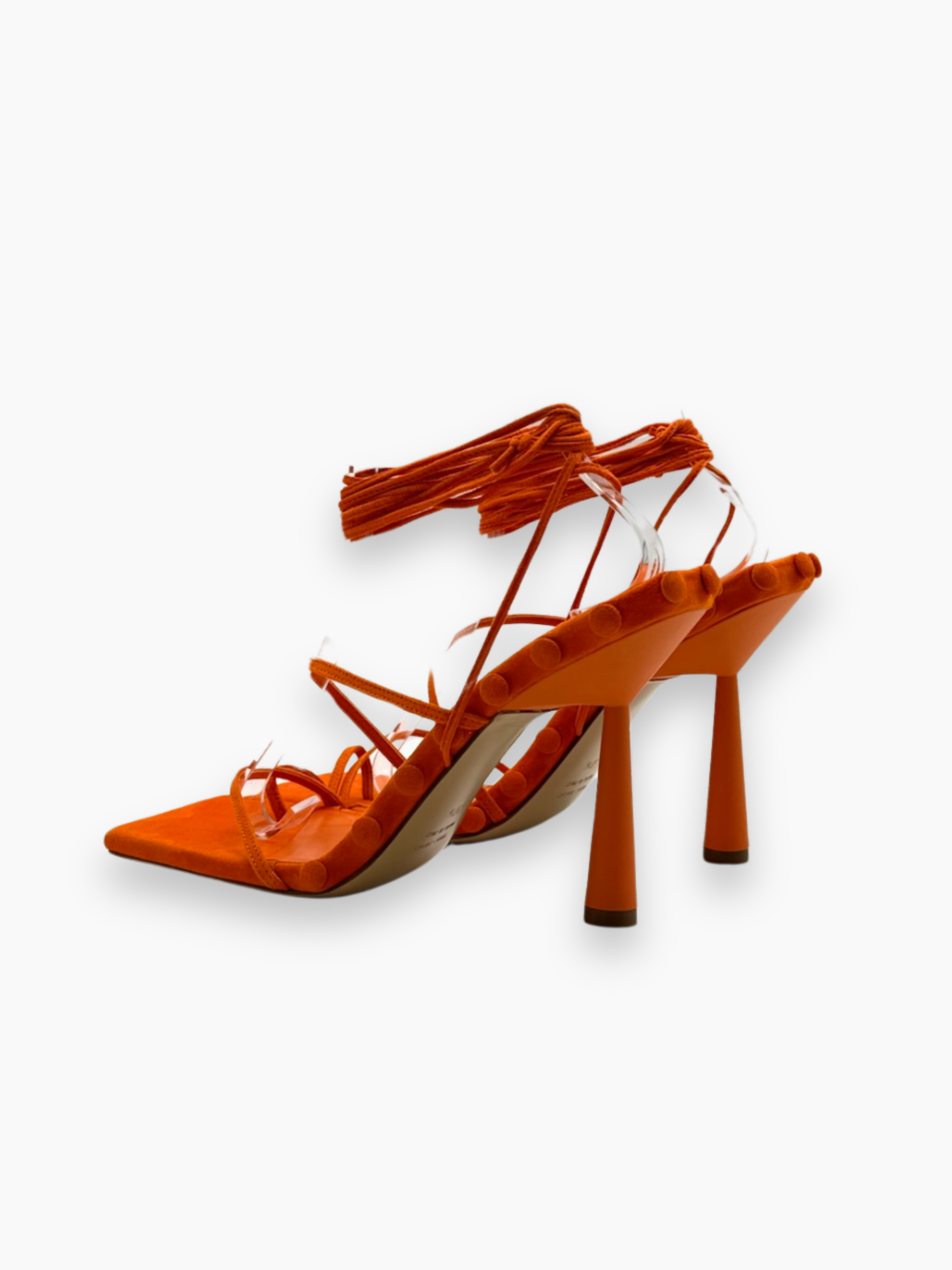 Sandali Gia Borghini dal design contemporaneo e audace. Realizzati in morbido camoscio arancione con sottili cinturini e punta squadrata, presentano un tacco geometrico e lacci alla caviglia che valorizzano la silhouette del piede. Perfetti per aggiungere un tocco vibrante e sofisticato ai look estivi.