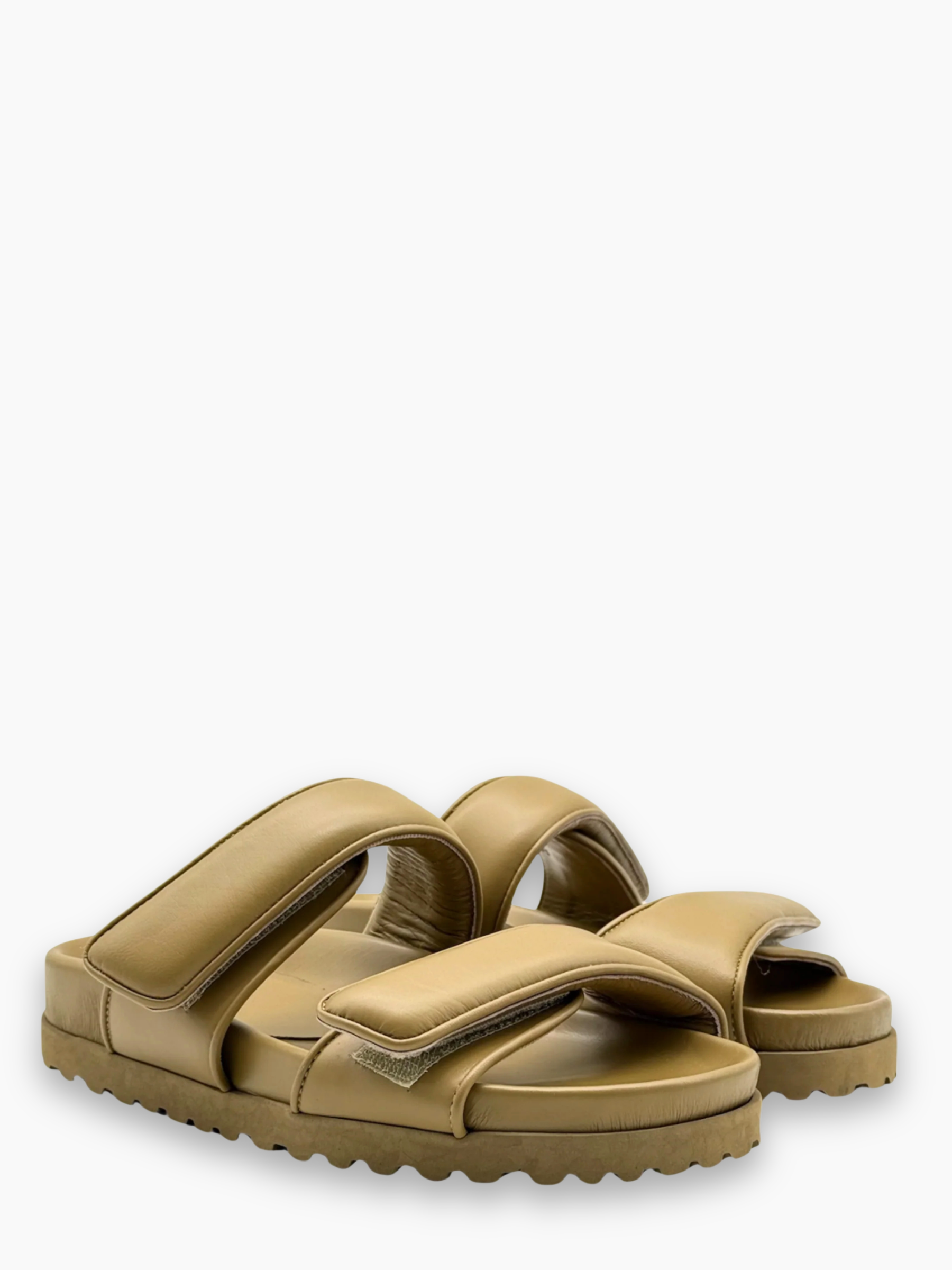 Sandali firmati Gia Borghini, caratterizzati da un design minimal e contemporaneo. Realizzati in morbida pelle beige, presentano doppi listini imbottiti regolabili con chiusura a velcro e una suola in gomma antiscivolo che garantisce comfort e stabilità. Un modello versatile, perfetto per completare look casual o rilassati con un tocco raffinato.