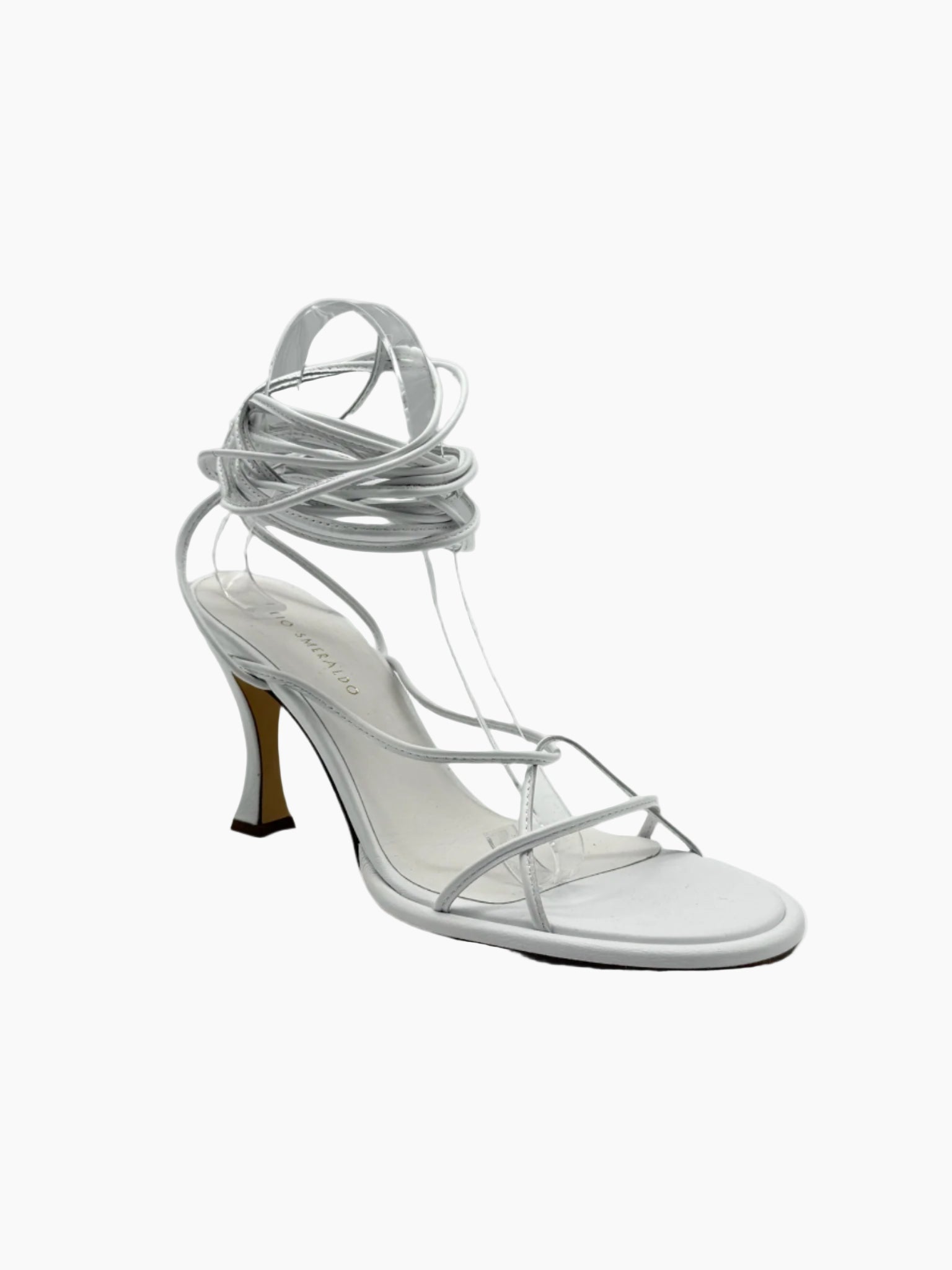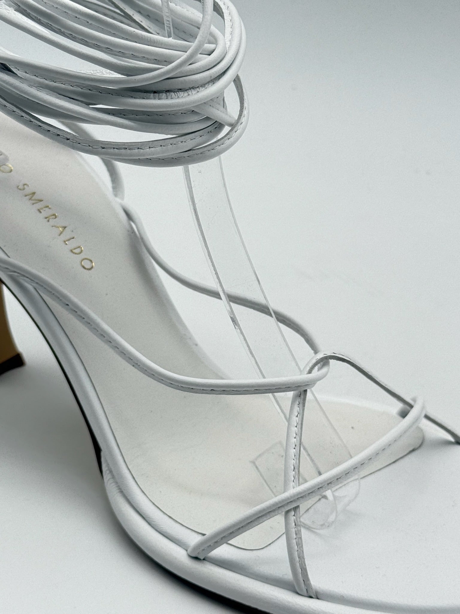 Sandali eleganti in pelle bianca firmati Ilio Smeraldo, perfetti per completare un look sofisticato e contemporaneo. Il design minimal con listini sottili e laccio alla caviglia valorizza la silhouette del piede, mentre il tacco svasato dona un tocco moderno e femminile. Una scelta versatile e raffinata per la sera e per le occasioni speciali.