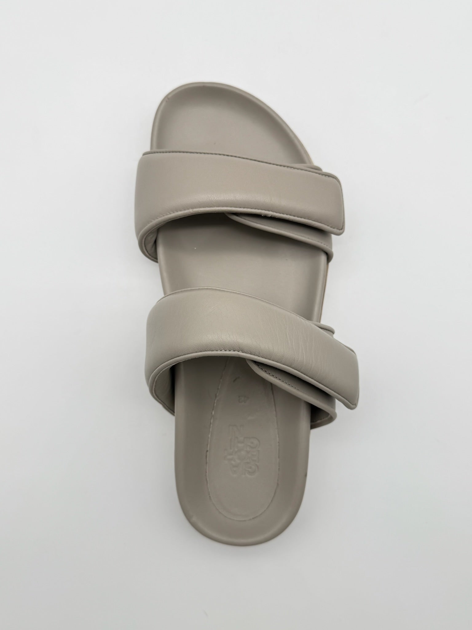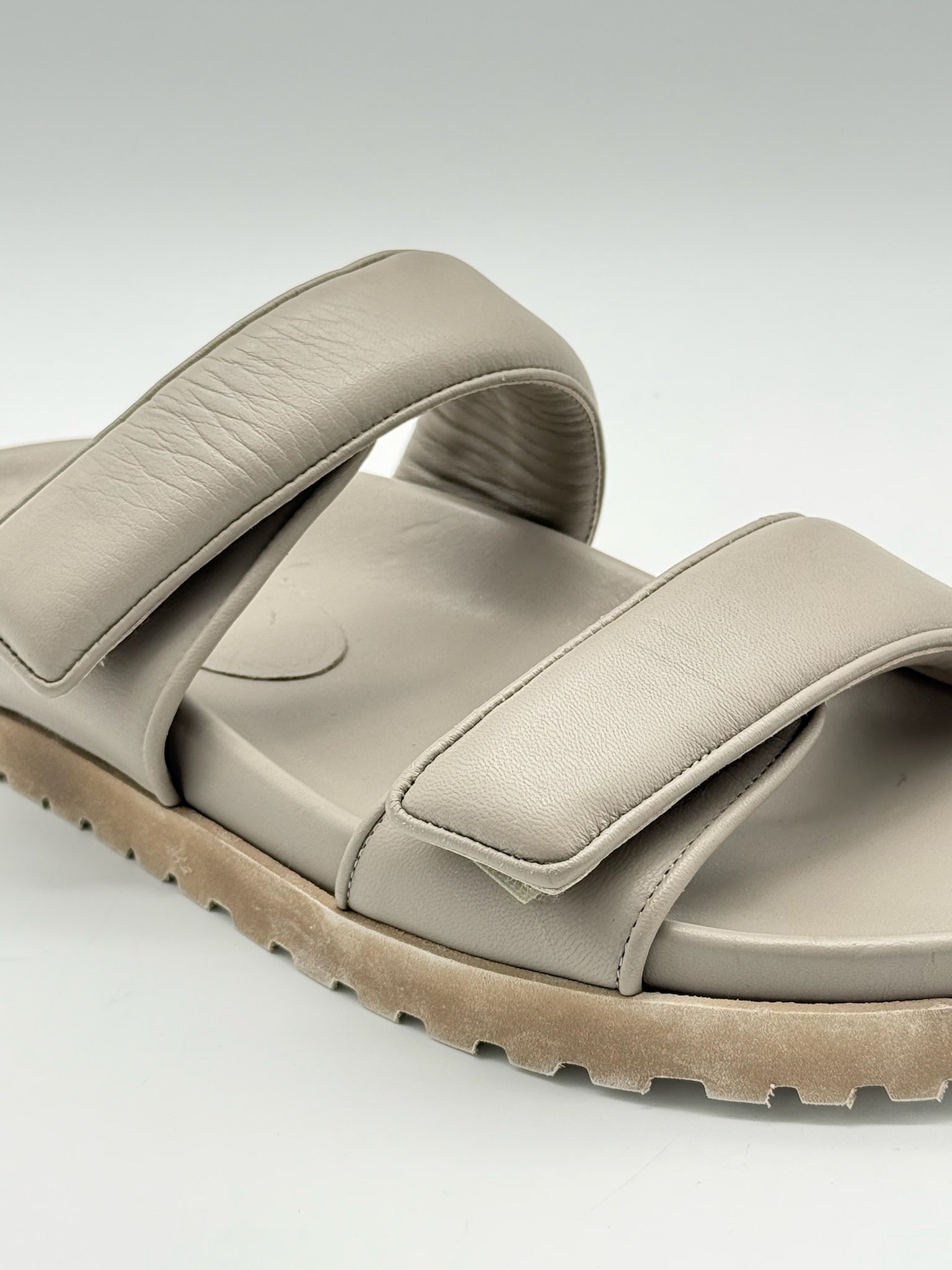 Questi sandali grigi firmati Gia Borghini reinterpretano l’estetica utilitaria con un twist contemporaneo. Realizzati in pelle morbida e imbottita, si distinguono per il doppio strap con chiusura in velcro, che garantisce una calzata regolabile e confortevole. La suola in gomma effetto used completa il design con un tocco urban e funzionale. Un must-have per il daywear estivo.