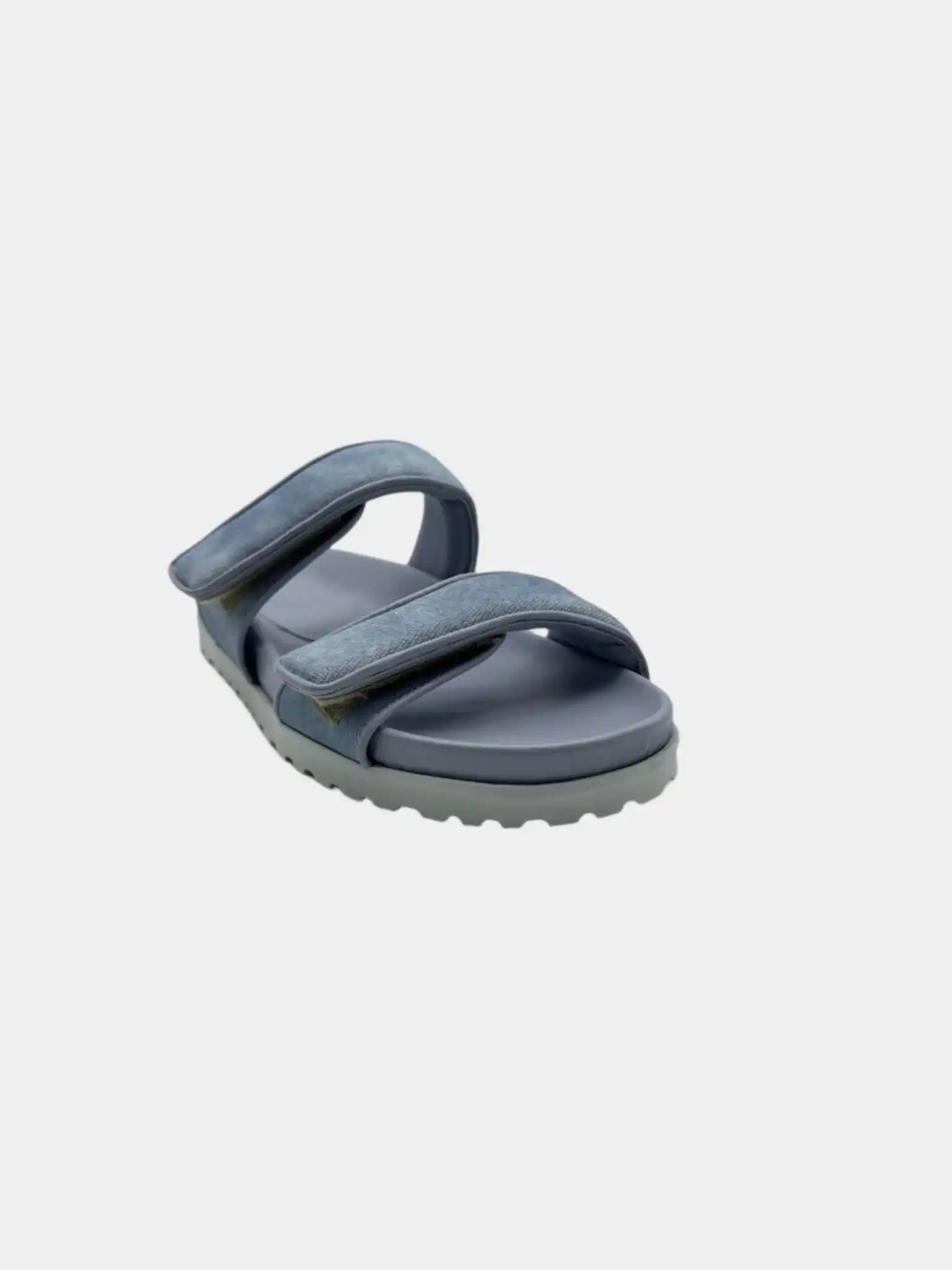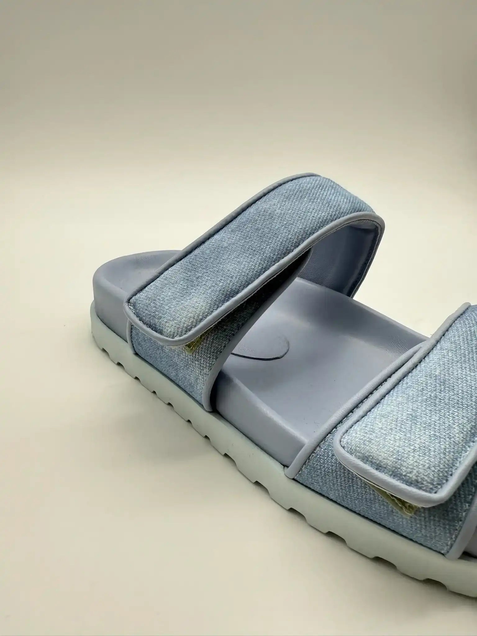 Sandali flat firmati Gia Borghini, modello Perni11, realizzati in denim azzurro chiaro. La silhouette sportiva incontra il gusto minimal con doppia fascia regolabile in velcro, poggiata su una suola ergonomica in gomma dal profilo dentellato per un grip sicuro. Comodi, versatili, perfetti per i look estivi più casual e rilassati.