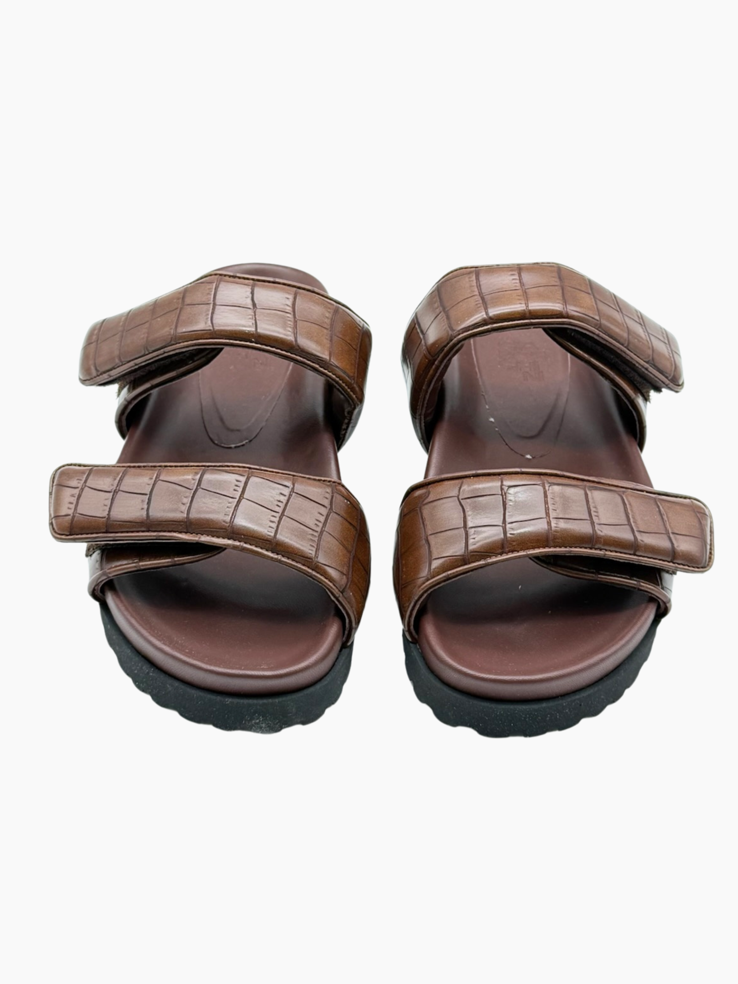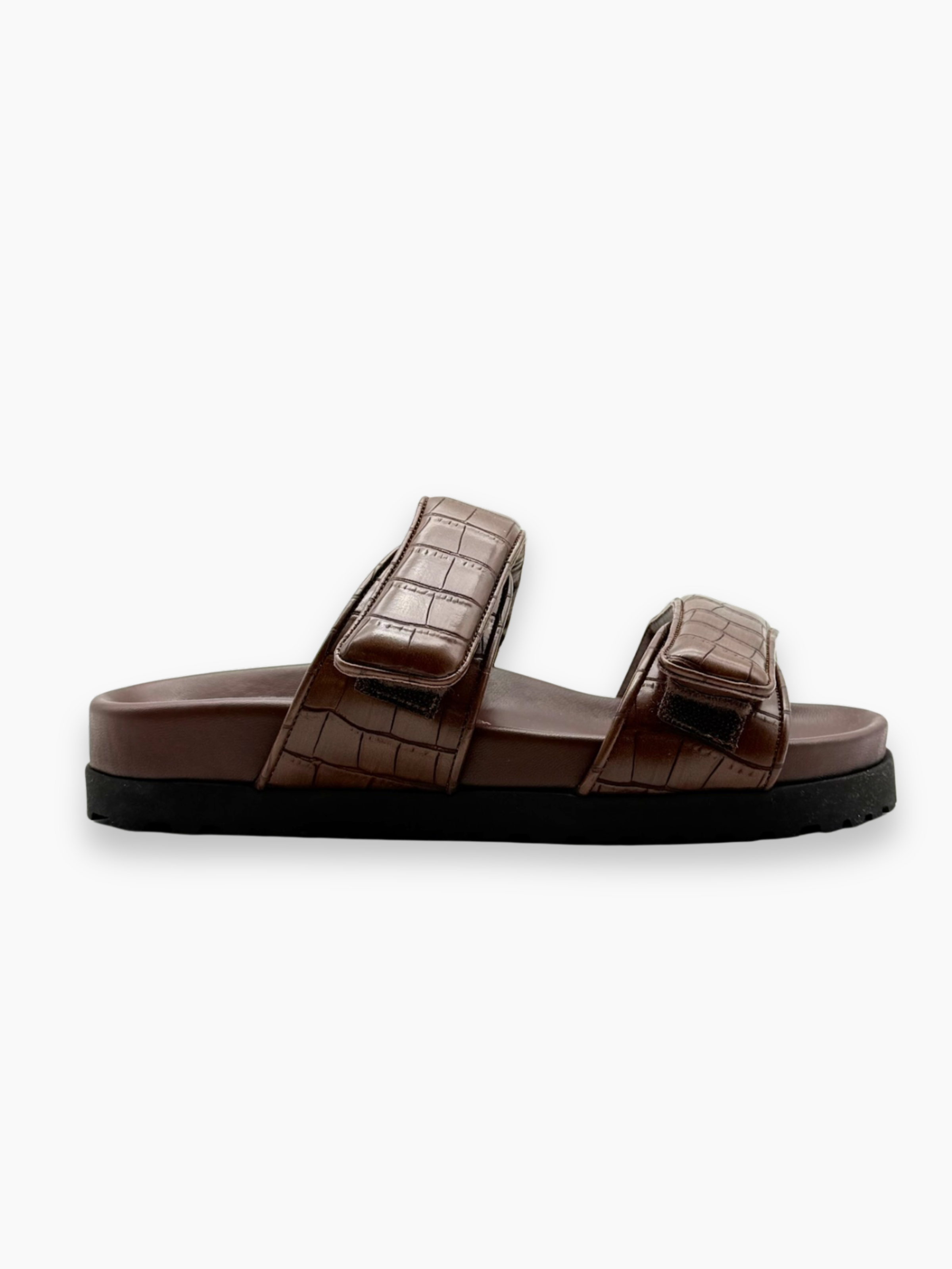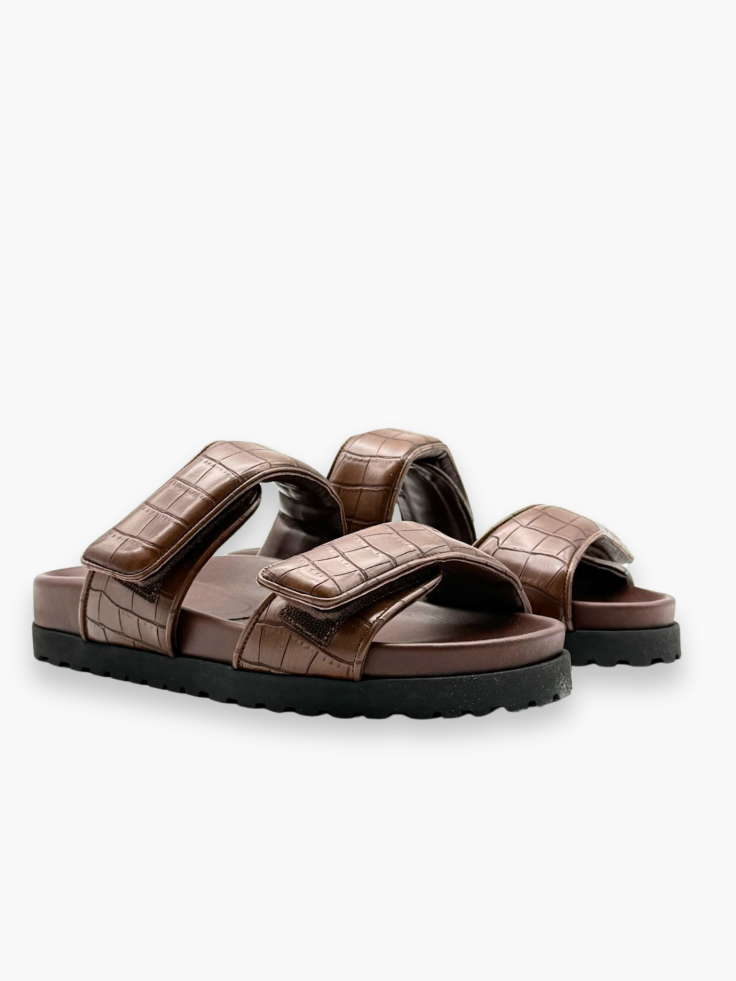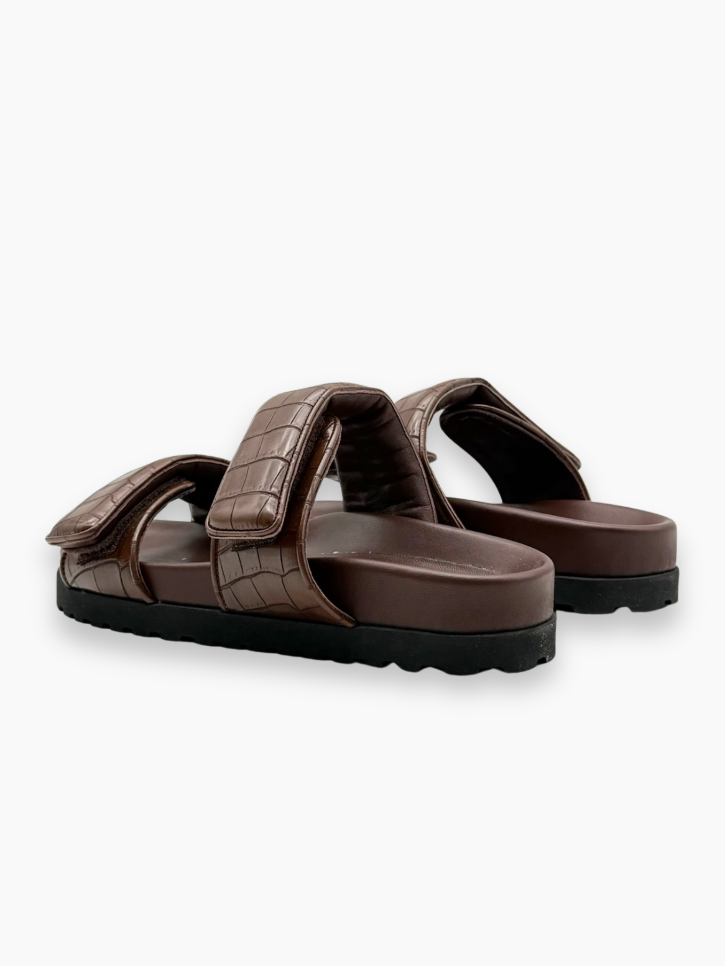 Sandali flat Gia Borghini realizzati in pelle con finitura effetto cocco, impreziositi da doppia fascia regolabile con chiusura a velcro. Un modello che coniuga eleganza e comfort, perfetto per completare look casual-chic nelle giornate estive.