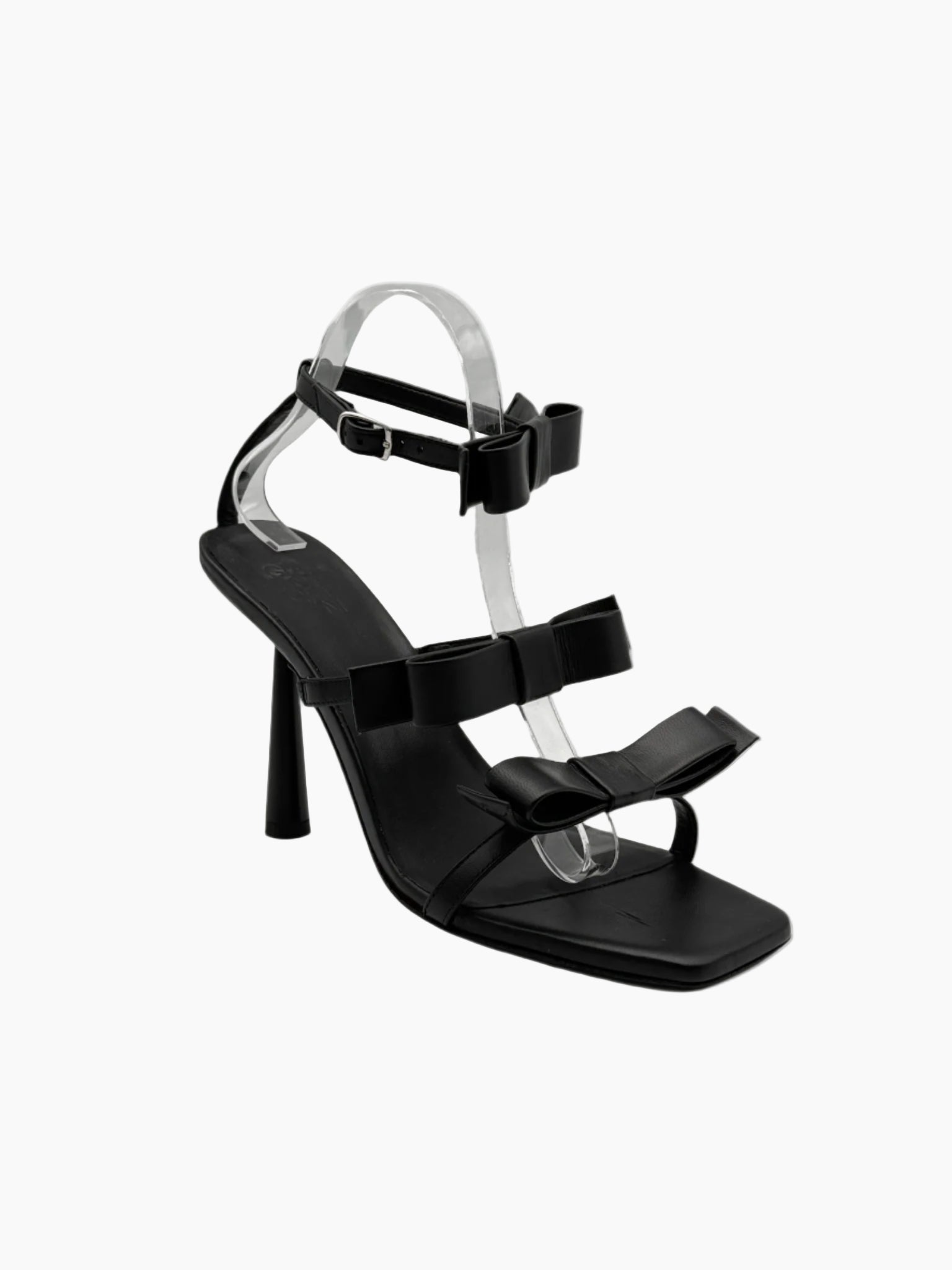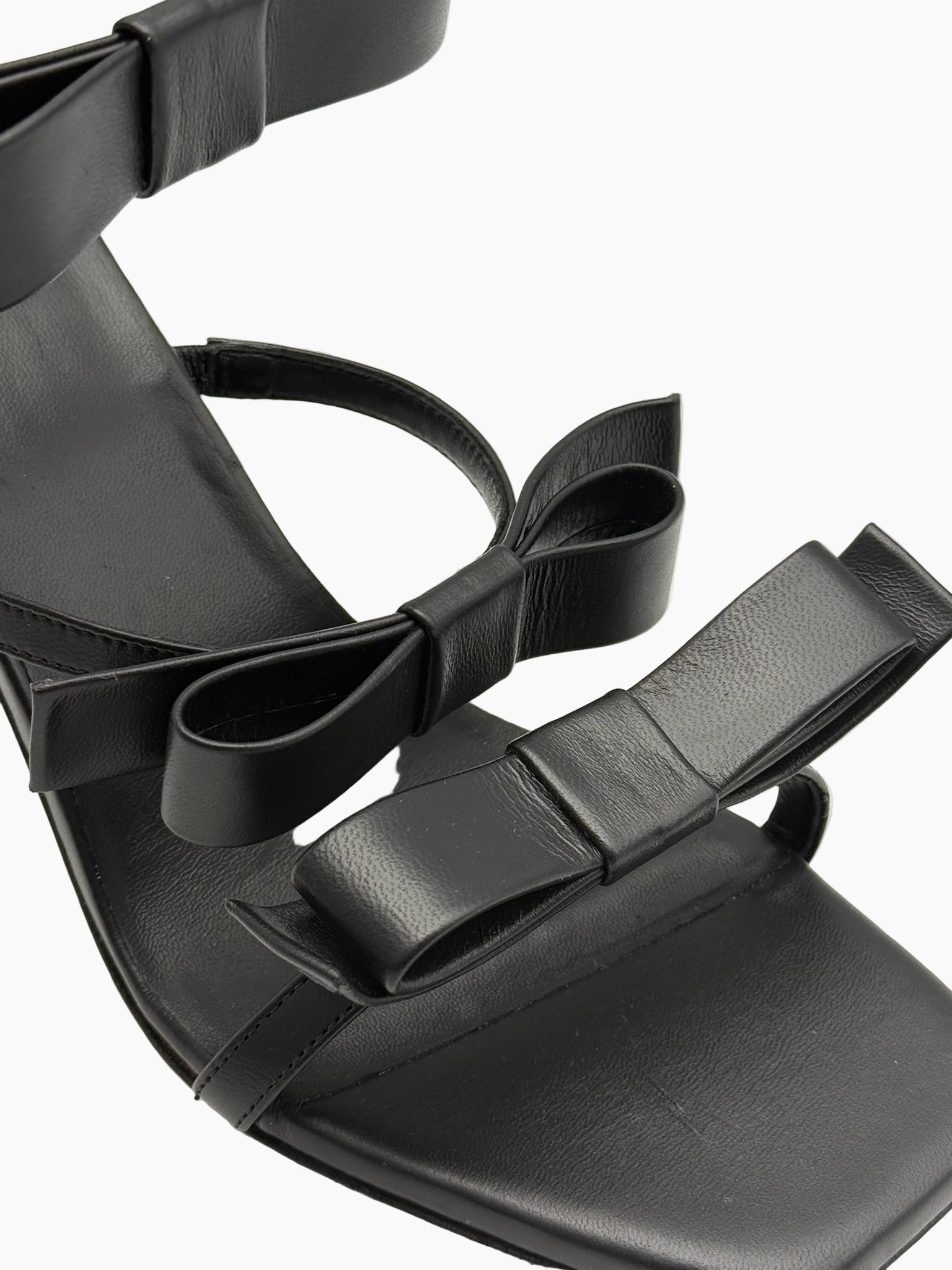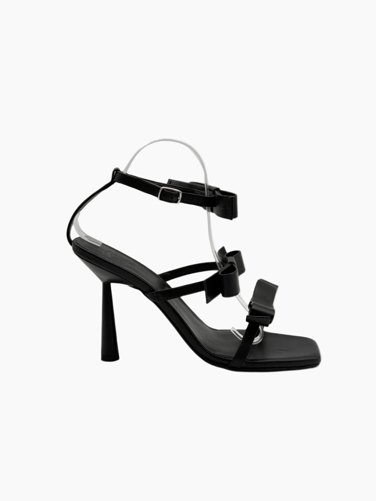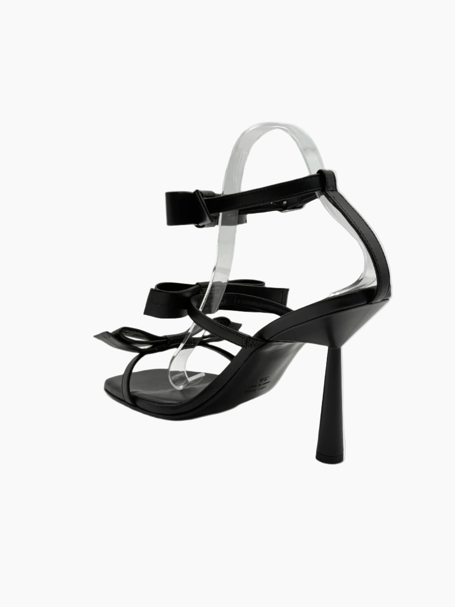 Sandalo elegante e grafico firmato Gia Borghini, realizzato in morbida pelle nera con una silhouette minimal resa speciale dai fiocchi decorativi. Il tacco a rocchetto e il design geometrico della punta donano una nota moderna e sofisticata, perfetta per le occasioni serali o per elevare con stile anche il look più semplice.