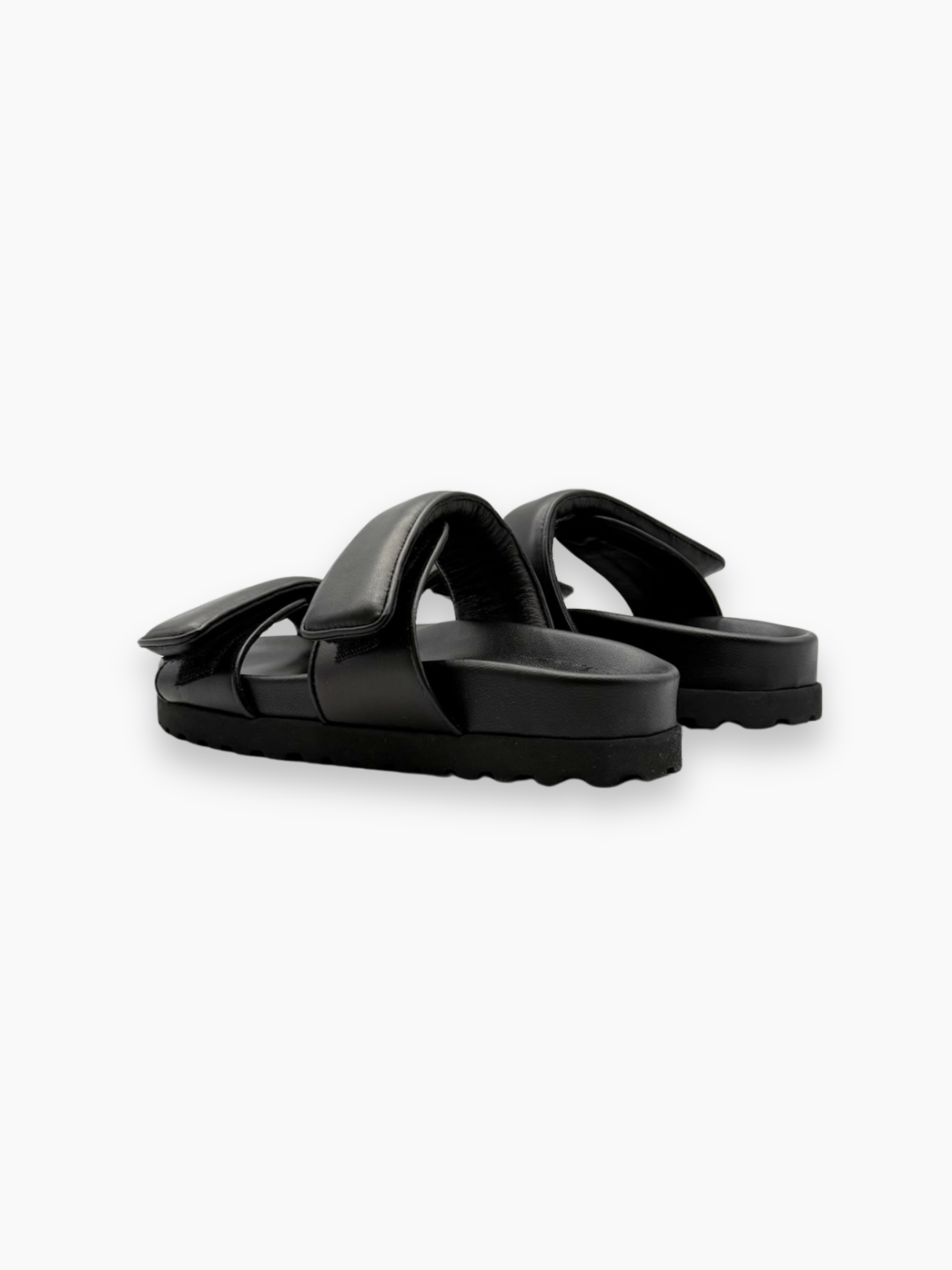 Sandali bassi firmati Gia Borghini realizzati in pelle nera, caratterizzati da un design essenziale e moderno con doppia fascia imbottita e chiusura a velcro. Perfetti per aggiungere comfort e stile a ogni look estivo, dal casual al minimal chic.