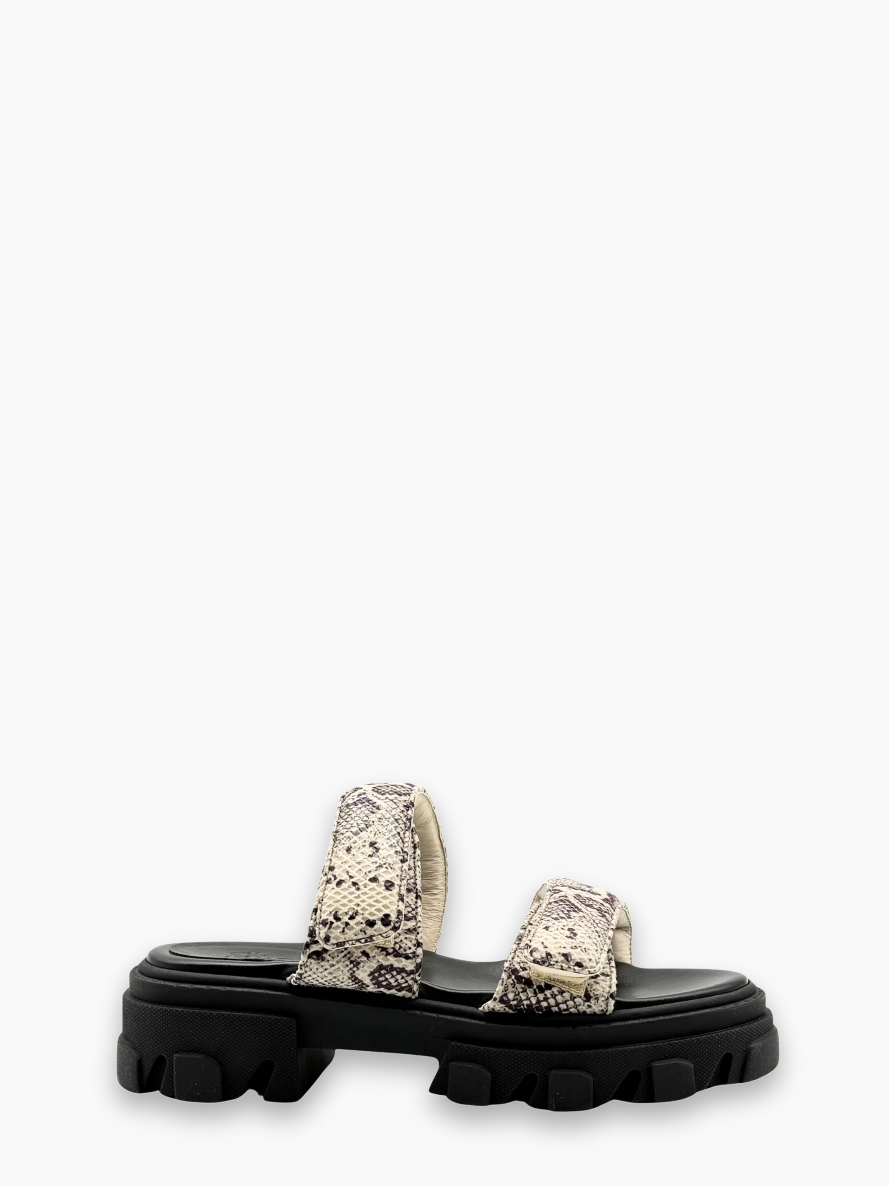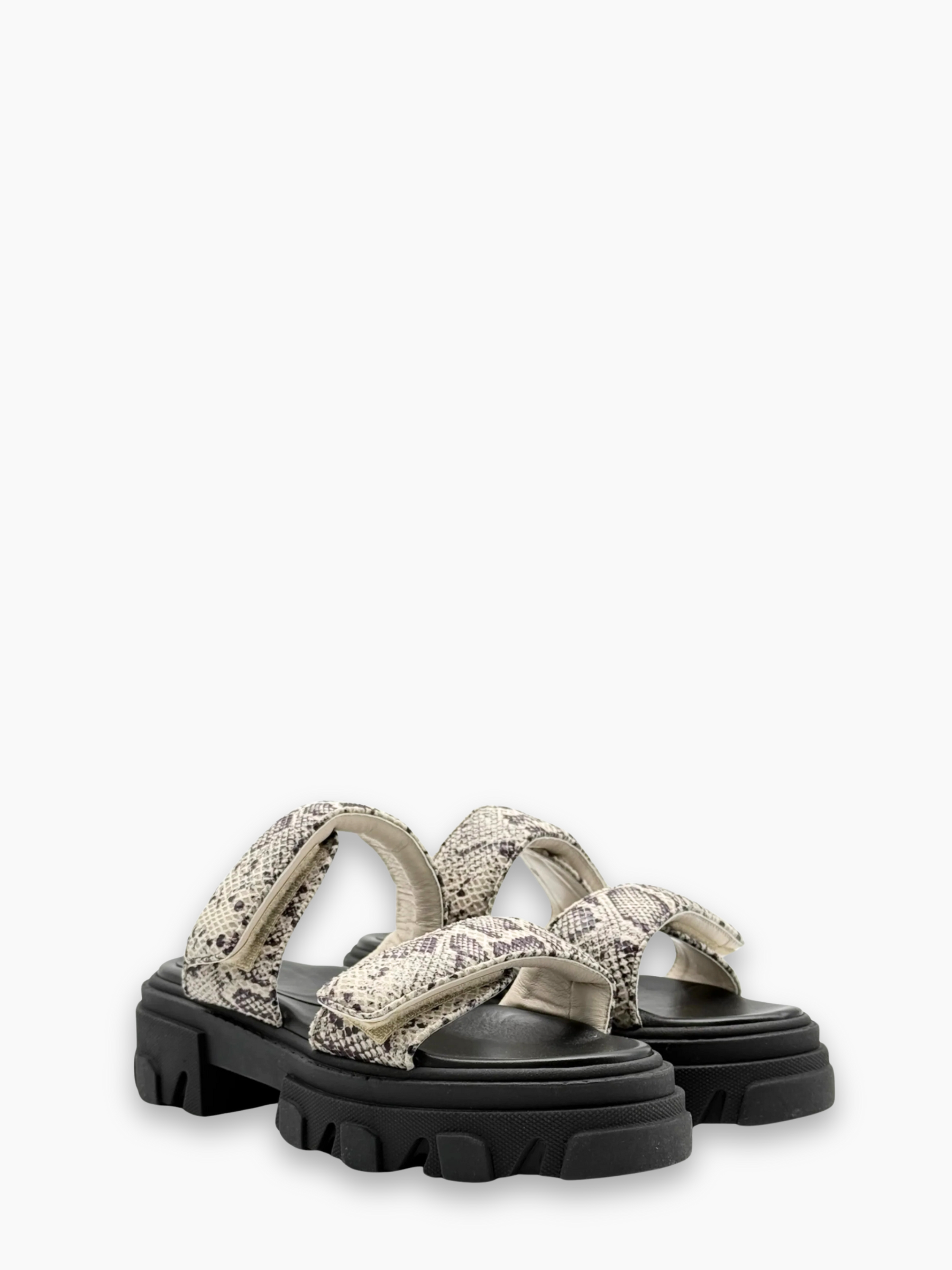 Sandali firmati Gia Borghini, dal carattere deciso e contemporaneo. Realizzati in pelle con stampa effetto pitonato, presentano una suola platform chunky nera che garantisce comfort e stabilità. I doppi listini imbottiti donano un look audace ma versatile, ideale per aggiungere personalità ai tuoi outfit estivi casual o street.