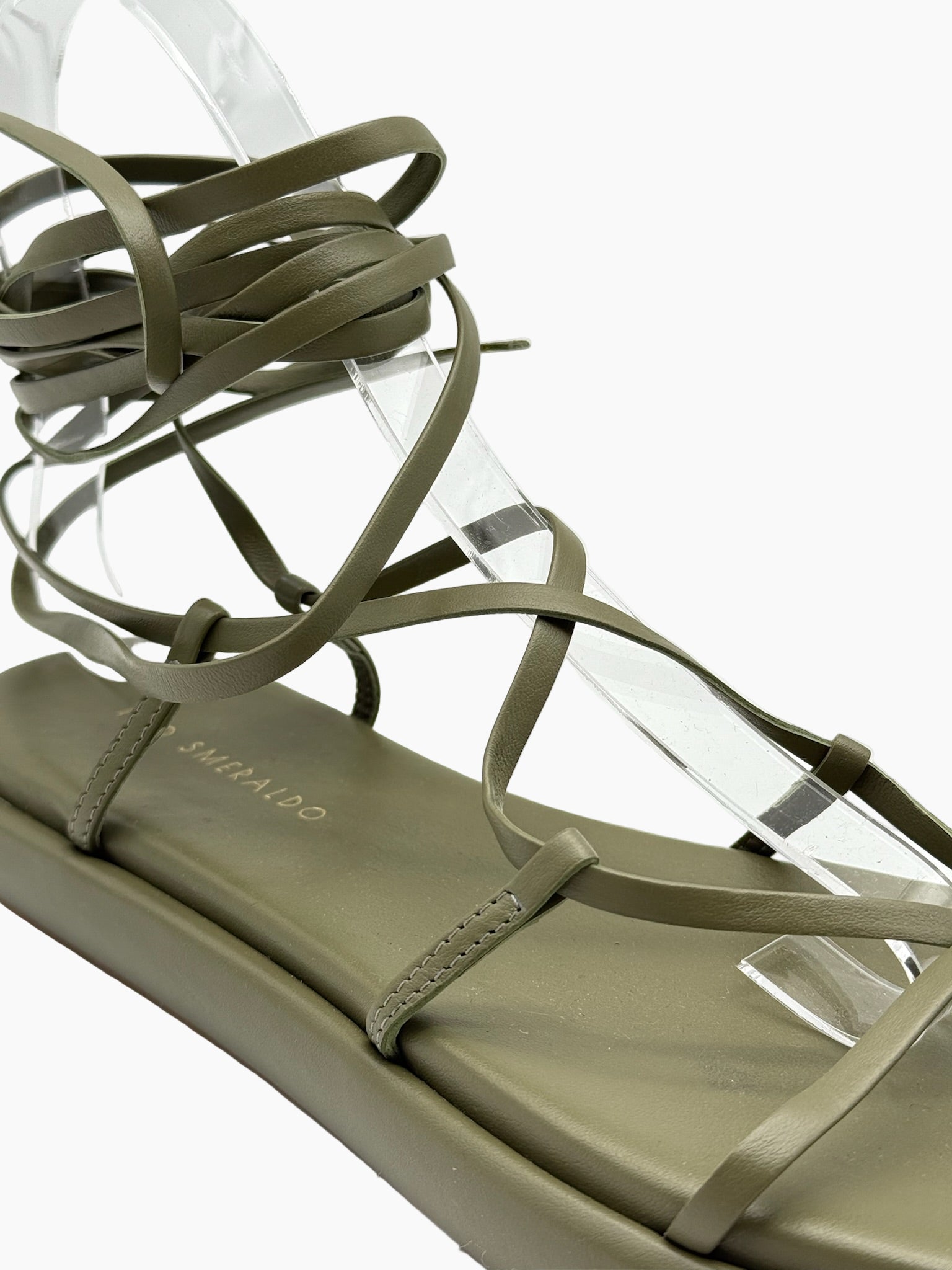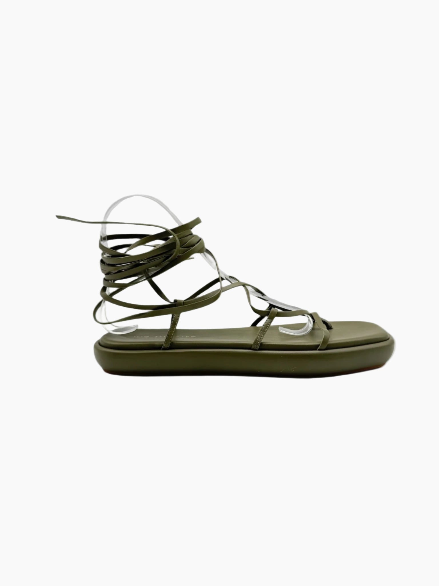 Sandali bassi dal design minimal ma ricercato, perfetti per chi cerca comodità e stile nei mesi più caldi. Realizzati in pelle verde oliva con lacci sottili alla caviglia e punta squadrata, presentano una suola imbottita che garantisce comfort e leggerezza durante tutto il giorno. L’essenzialità della silhouette è valorizzata da dettagli curati e una costruzione artigianale di qualità. Perfetti con abiti lunghi estivi, pantaloni cropped o denim relaxed.