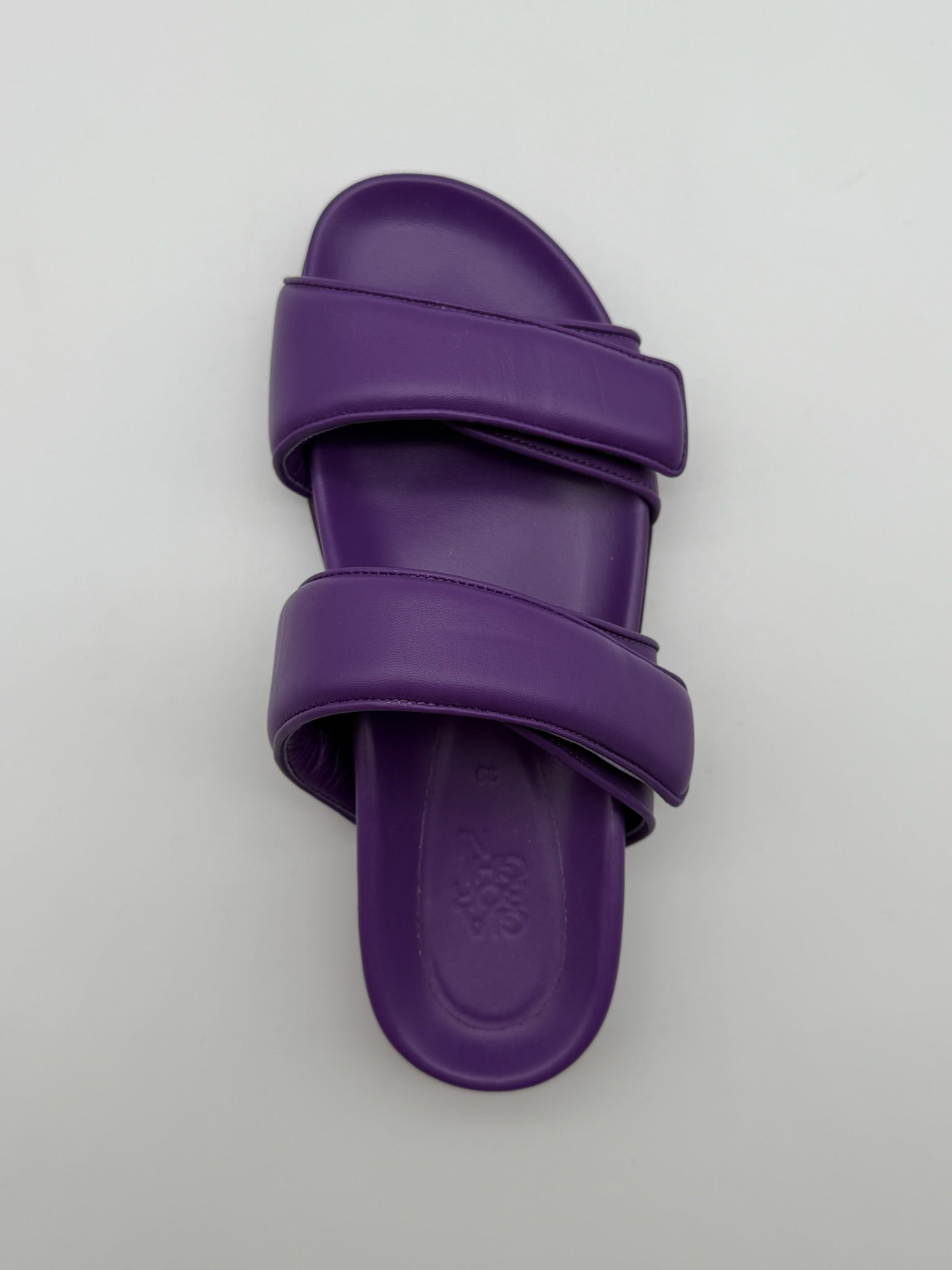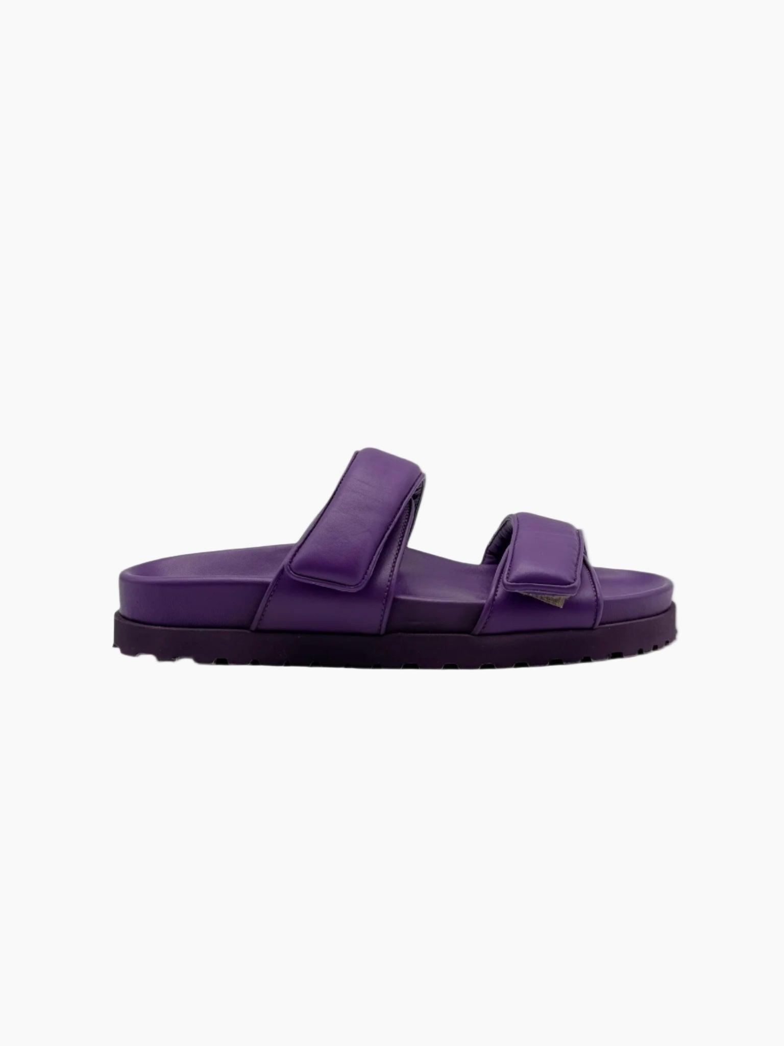 Questi sandali viola firmati Gia Borghini reinterpretano l’estetica utilitaria con un twist contemporaneo. Realizzati in pelle morbida e imbottita, si distinguono per il doppio strap con chiusura in velcro, che garantisce una calzata regolabile e confortevole. La suola in gomma effetto used completa il design con un tocco urban e funzionale. Un must-have per il daywear estivo.