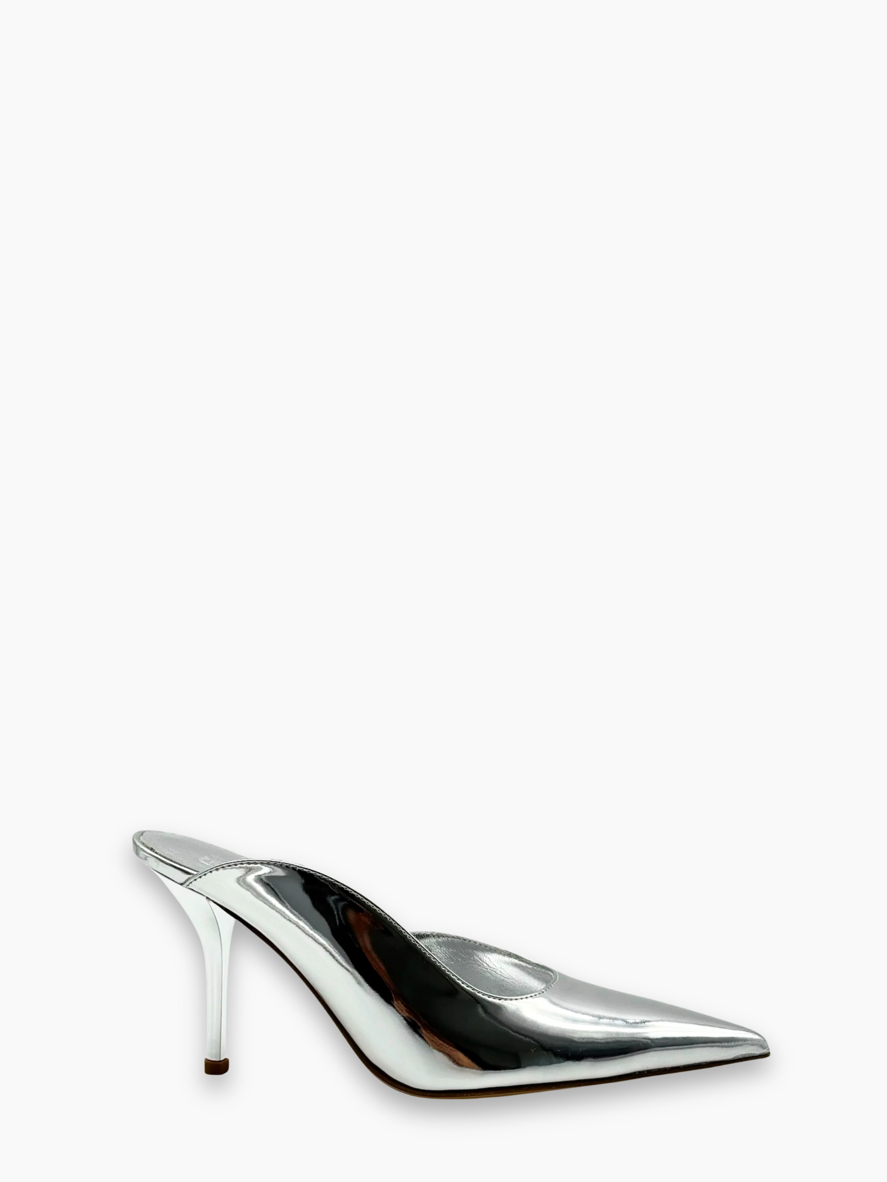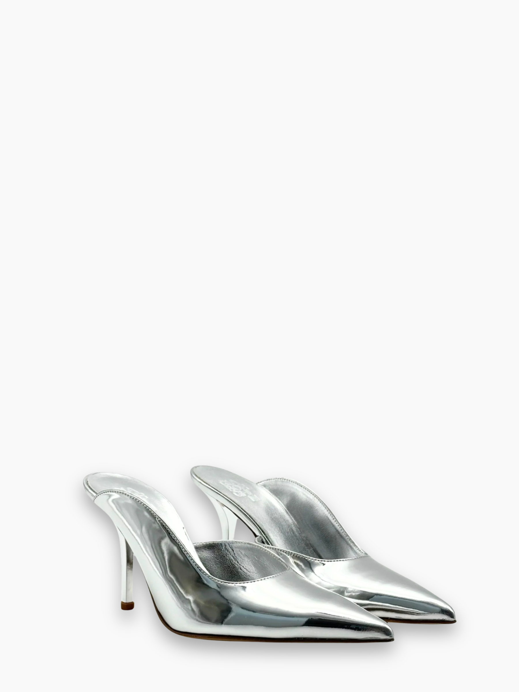 Mule dal design moderno firmate Gia Borghini, realizzate in pelle argentata effetto specchio. Il profilo affusolato con punta sfilata e tacco sottile dona un’eleganza scultorea, perfetta per look serali o per aggiungere un tocco brillante agli outfit più minimal. Un modello che combina raffinatezza e carattere.