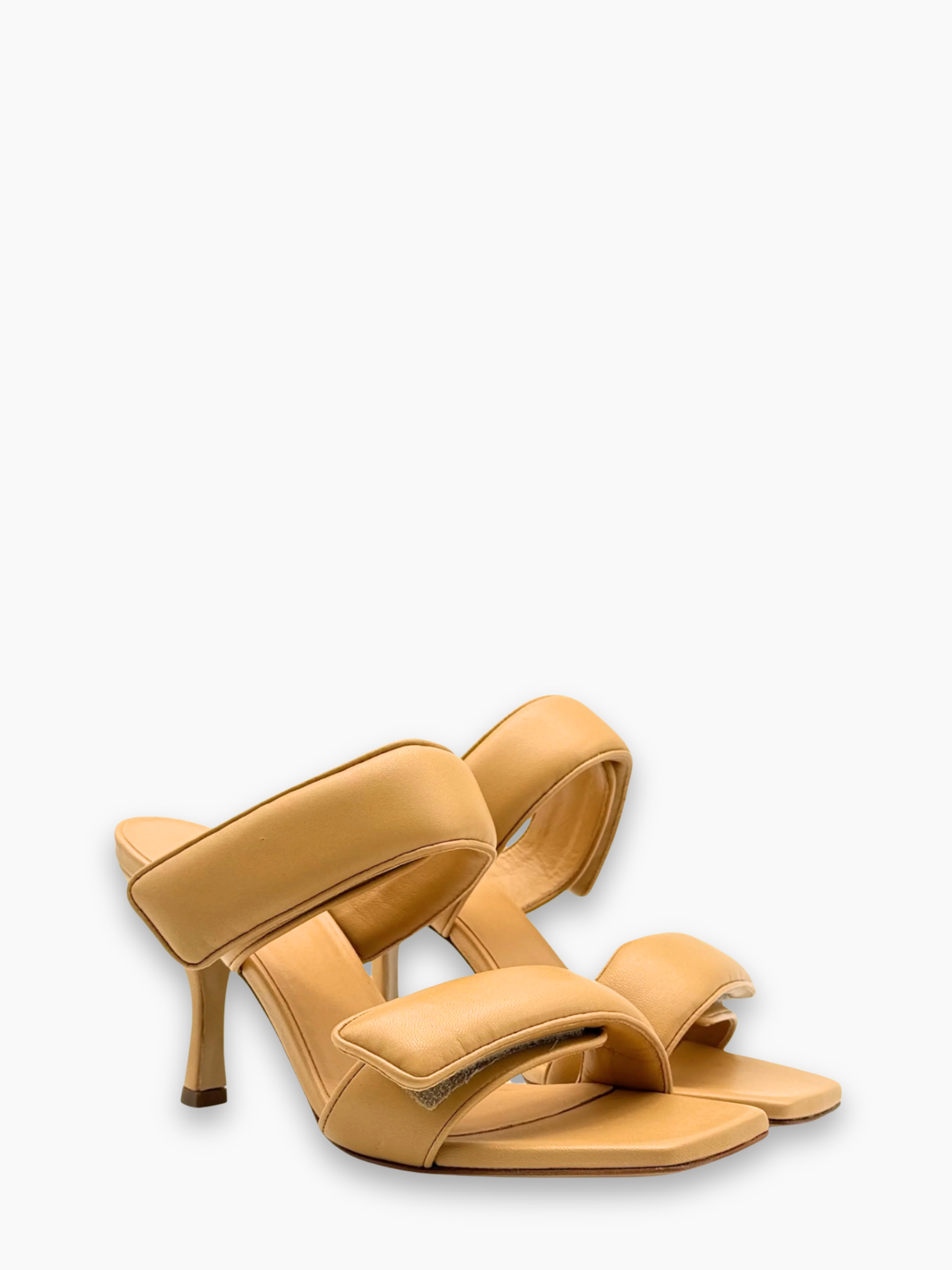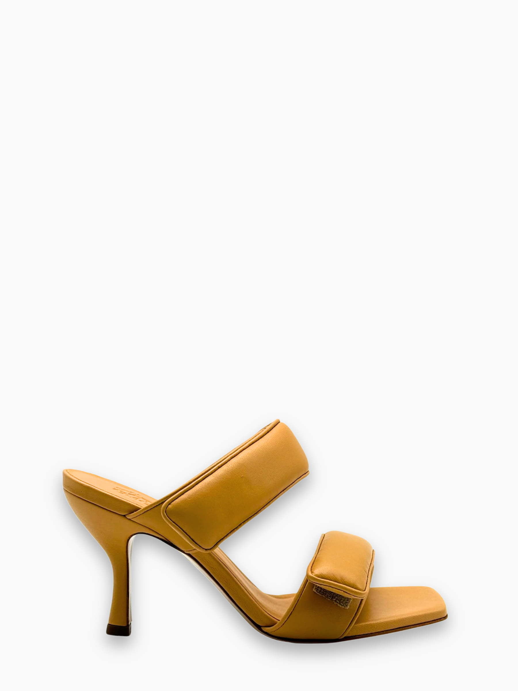 Mule color caramello firmate Gia Borghini, realizzate in morbida pelle con doppia fascia imbottita e punta squadrata. Il tacco sottile dona un’eleganza raffinata, mentre la struttura imbottita assicura una calzata confortevole. Un modello versatile, perfetto per look da giorno e da sera.